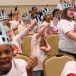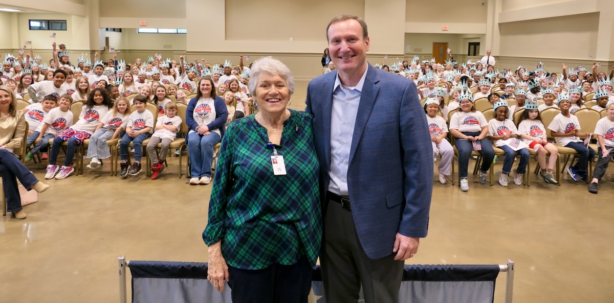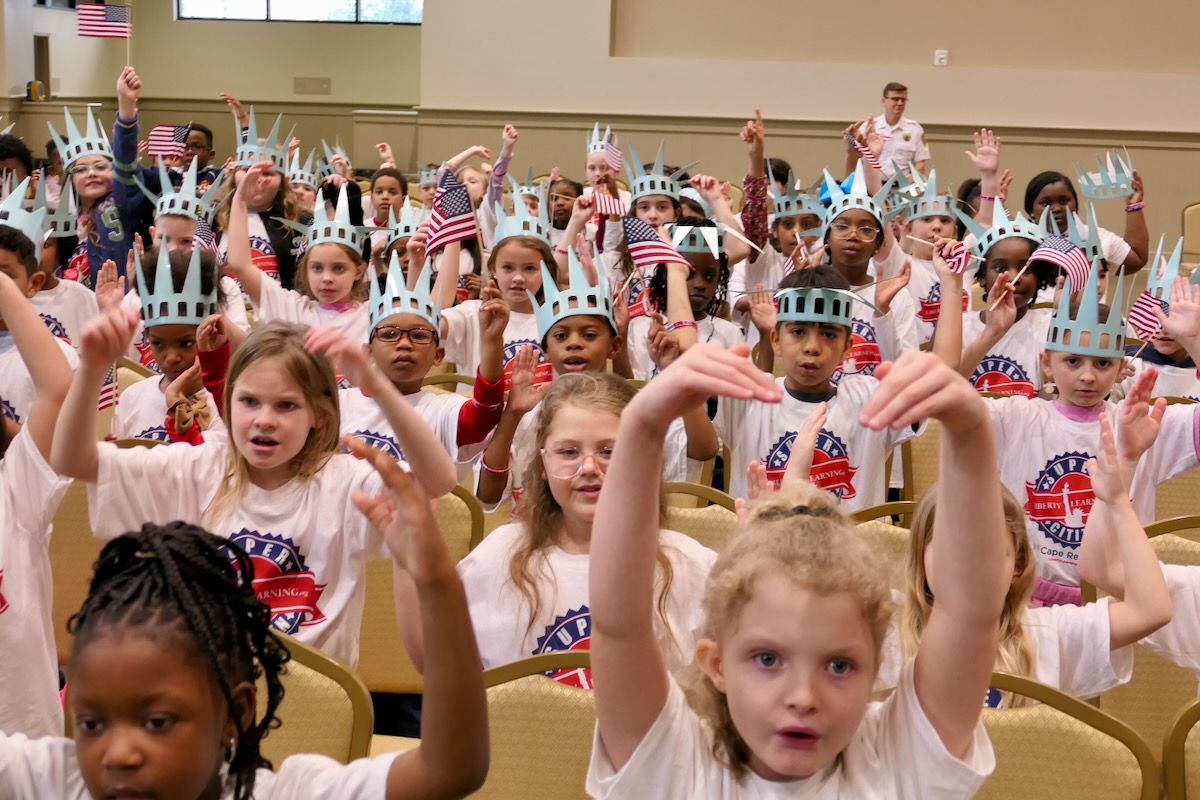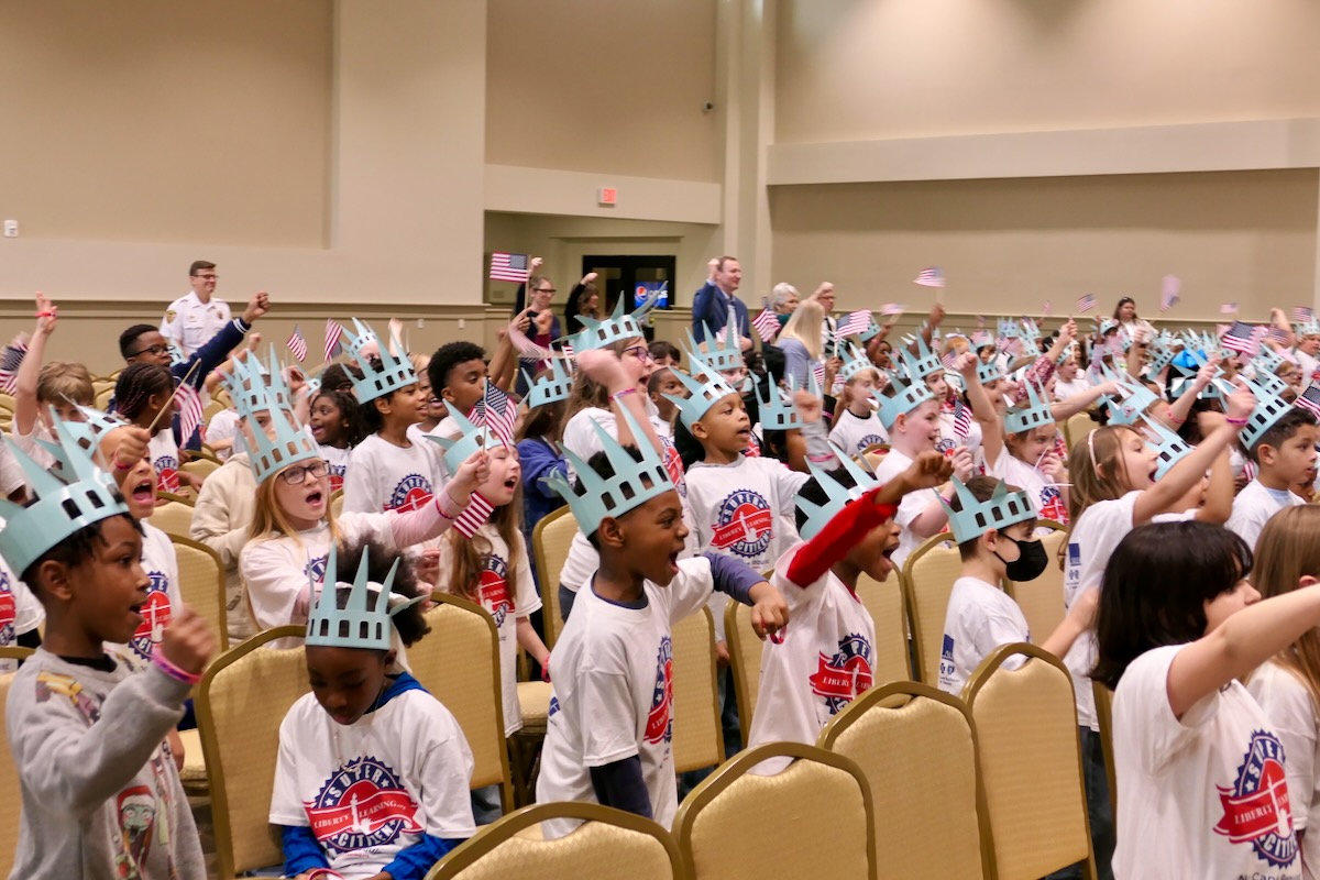 Today, 2nd graders from Calera & Wilsonville Elementary Schools filled the Shelby County Arts Council Auditorium. After finishing 10 weeks in the Hands on Liberty Program, they are gathered to celebrate their accomplishments and honor local heroes from the stage.