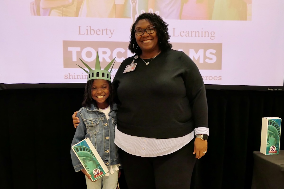 These students have learned their important roles in America’s future thanks to an immersive experience in civics, character, financial literacy and social studies. And in the closing piece of the program, Torch Teams (or “Helping Hands” for the younger students), students are applying those crucial lessons in the real world. They chose heroes who embodied the traits of amazing citizens and read essays from stage before presenting them with an Authentic Liberty Replicas & Liberty Pins. They learned that “when you honor a hero, you become a hero!”