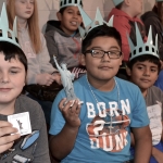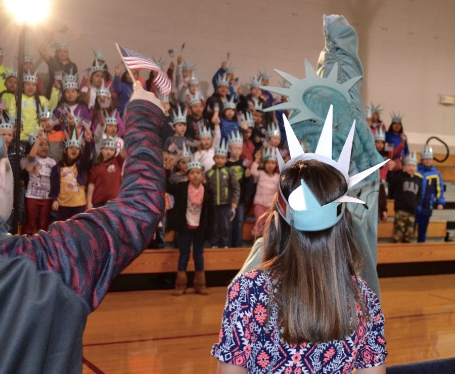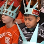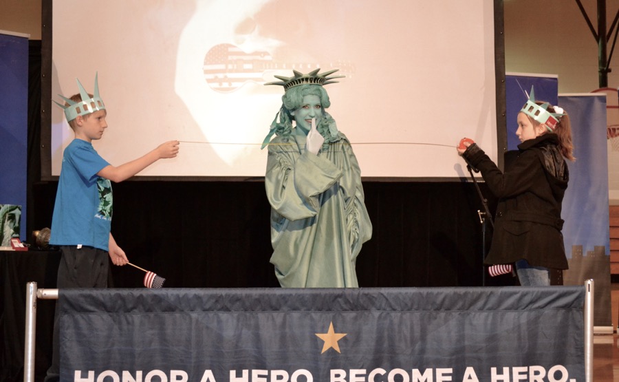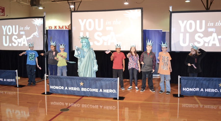 Today, nearly 200 crown-wearing, flag-waving 2nd and 5th graders cheered, clapped and counted down to a grand entrance by Libby Liberty™ at Asbury School. Fresh off her Next Great Americans Tour bus, the lady in green brought history to life and introduced students to the 10-week civics, character, financial literacy and social studies program they’ll begin after her bus rolls away.