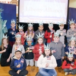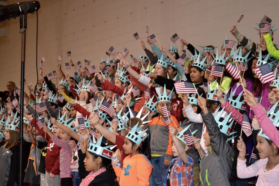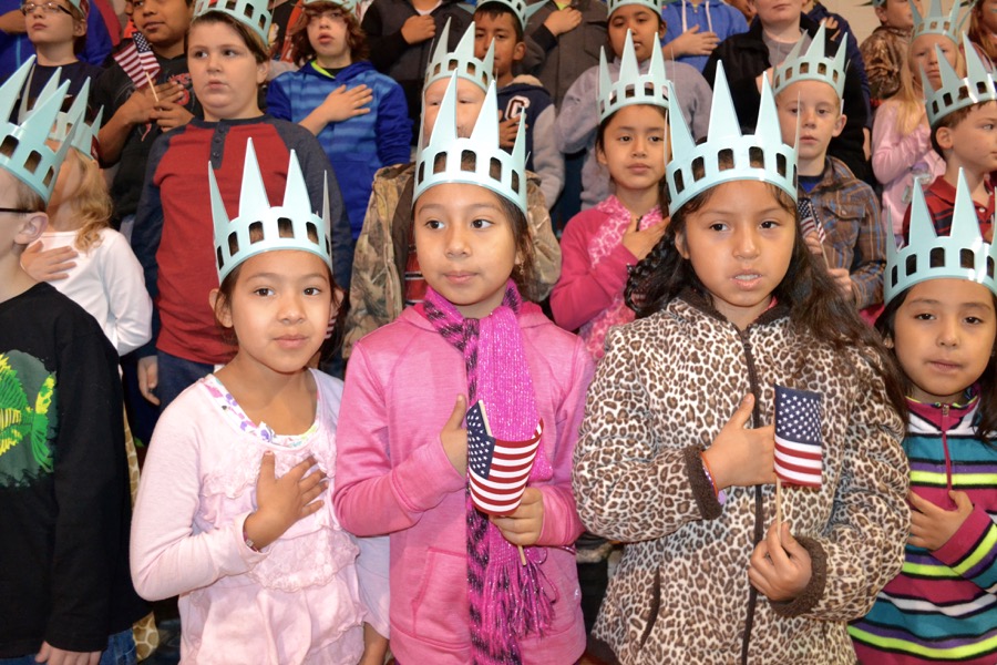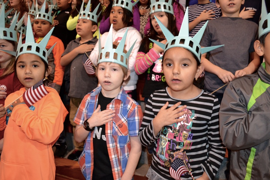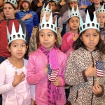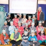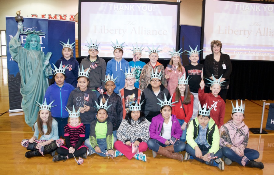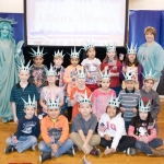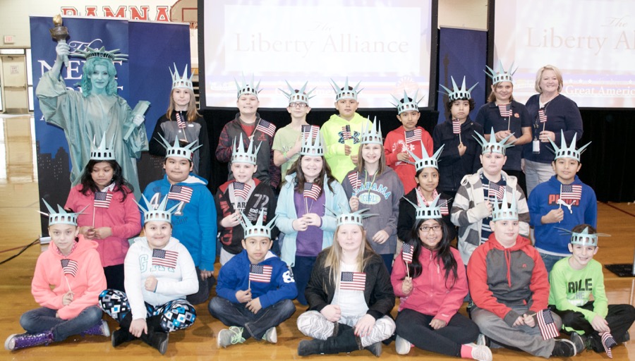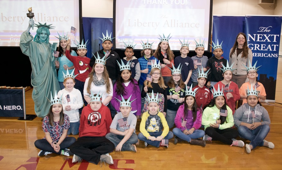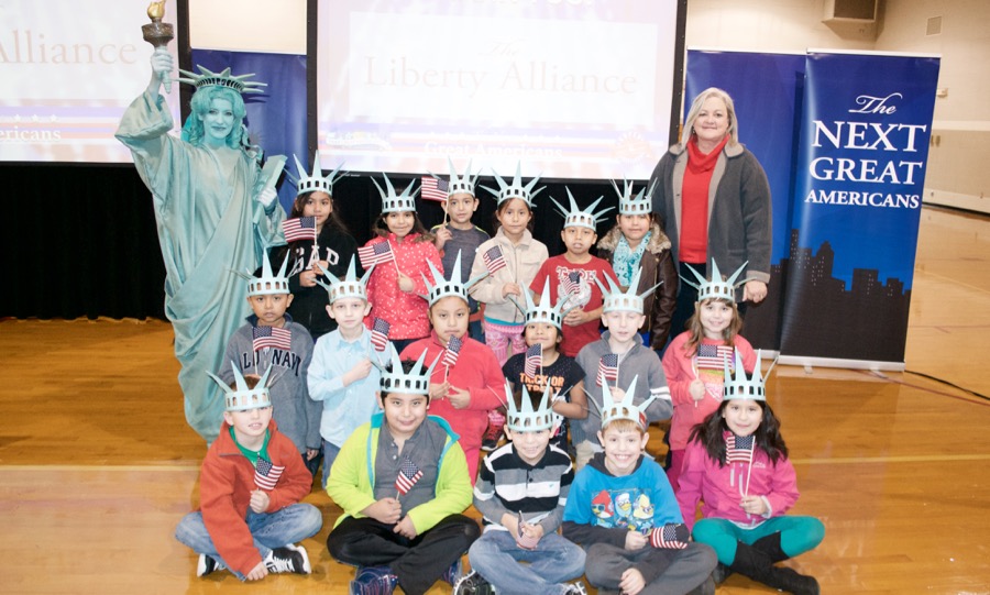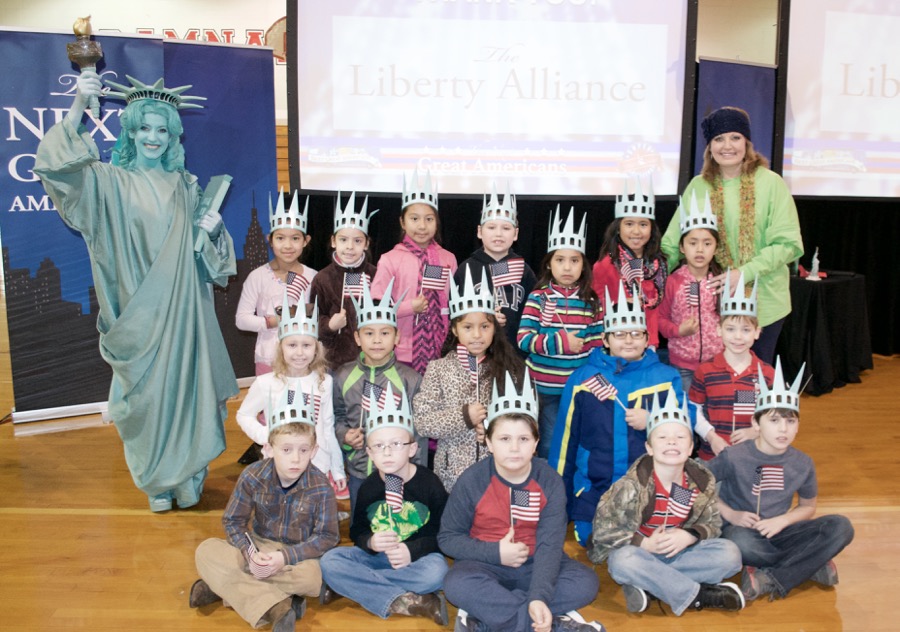 - The next great Americans from Asbury Elementary pose with Libby Liberty™ after the program.