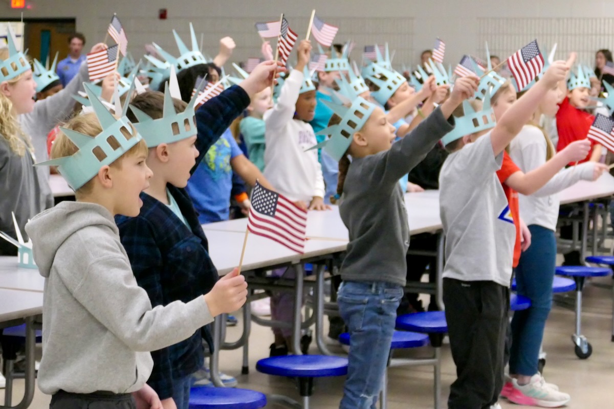Today second graders from Beauregard Elementary School cheered and counted down to the grand entrance of Libby Liberty™. Wearing green paper crowns and waving tiny American flags, they showed their enthusiasm for the Super Citizen Program they’ll begin after today’s theatrical performance.