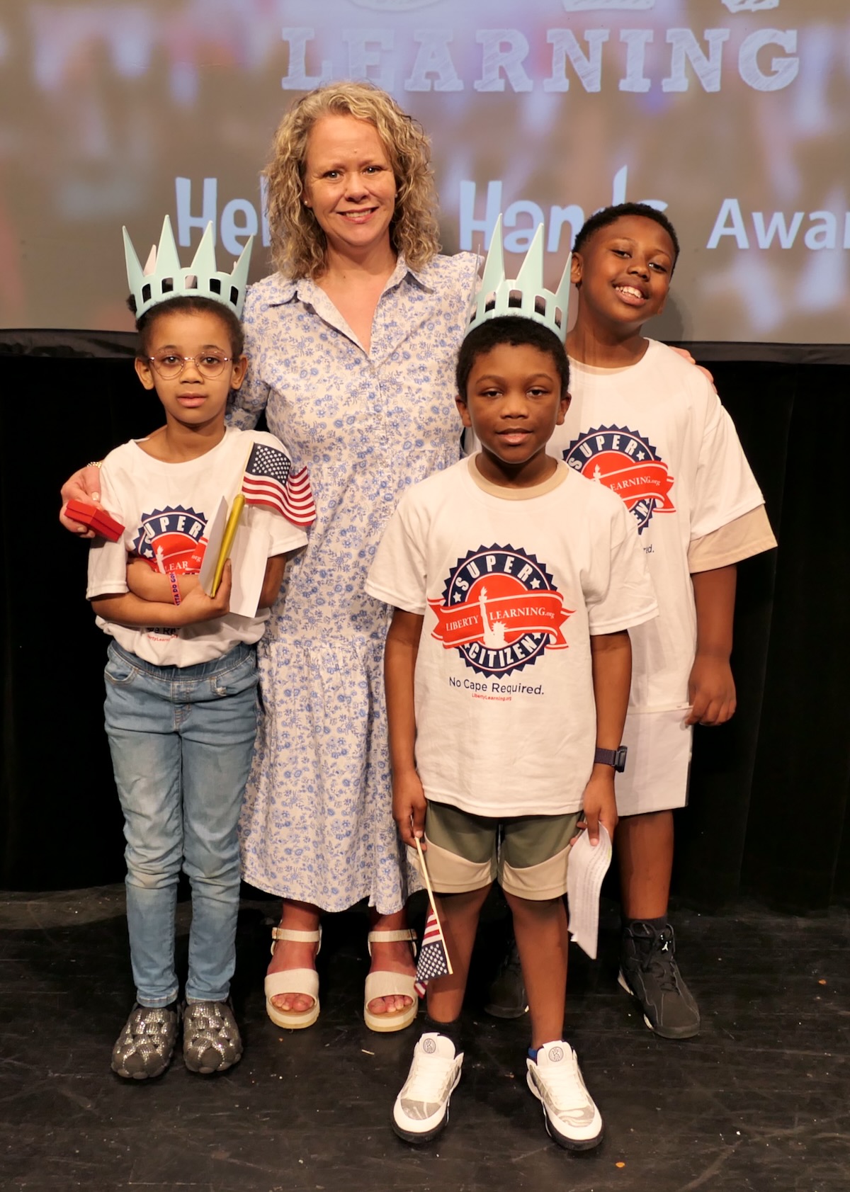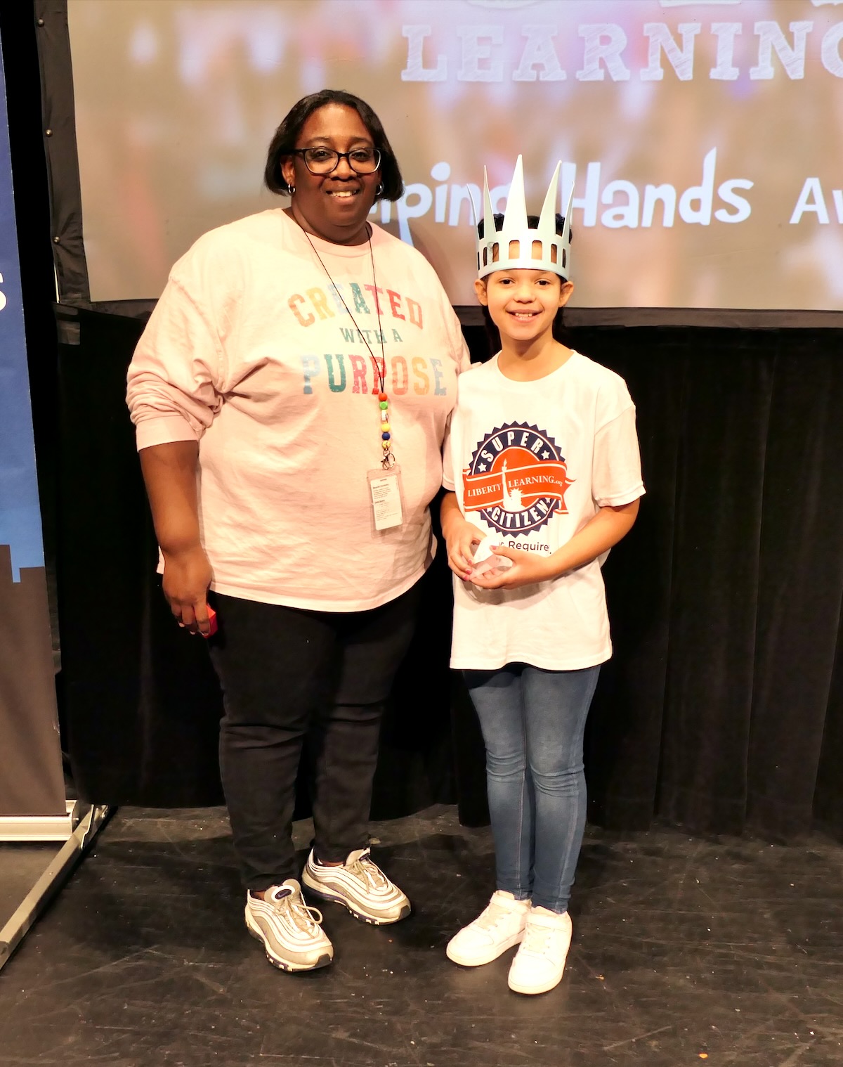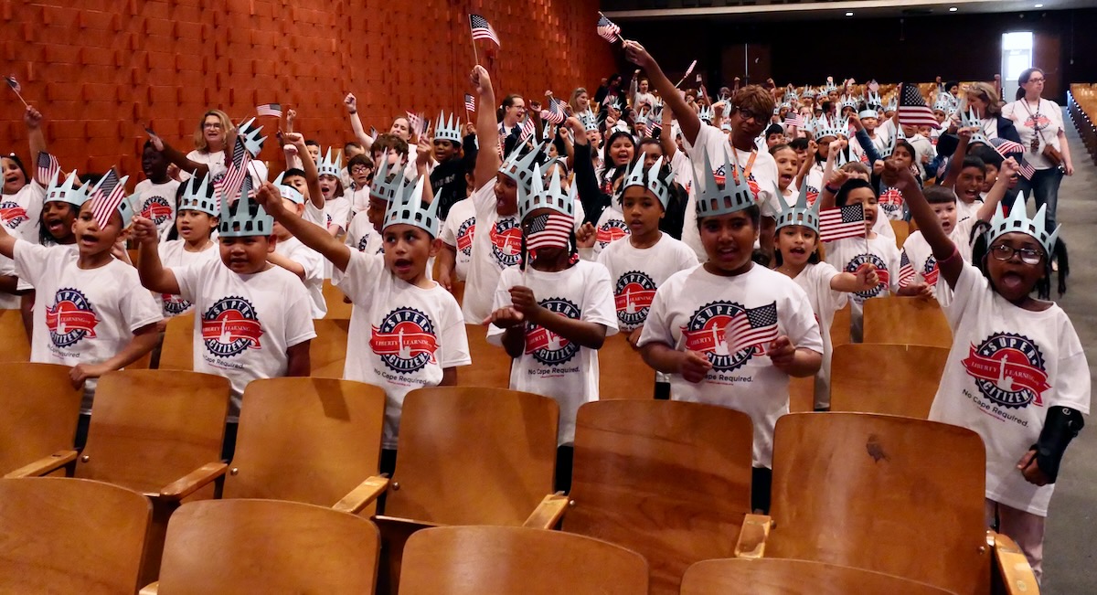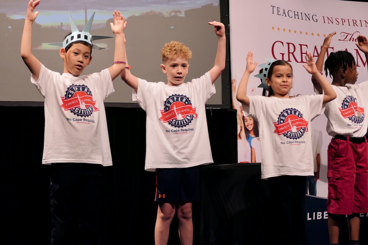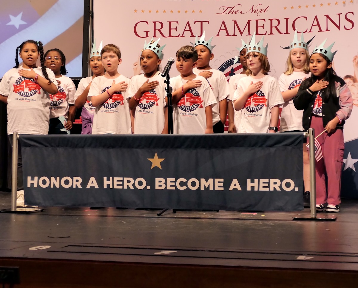 Thanks to Mr. Palmer and his very hands-on teaching, these students have begun learning about their important roles in America’s future. The “Hands on Liberty” series and accompanying activities and lesson plans teach crucial lessons in civics, character, financial literacy and social studies to a tech-centric generation. And in the closing piece of the program, Helping Hands, students are applying those crucial lessons in the real world. Students chose heroes who embodied the traits of amazing citizens and read essays from stage before presenting them with Liberty Pins. They learned that “when you honor a hero, you become a hero!”