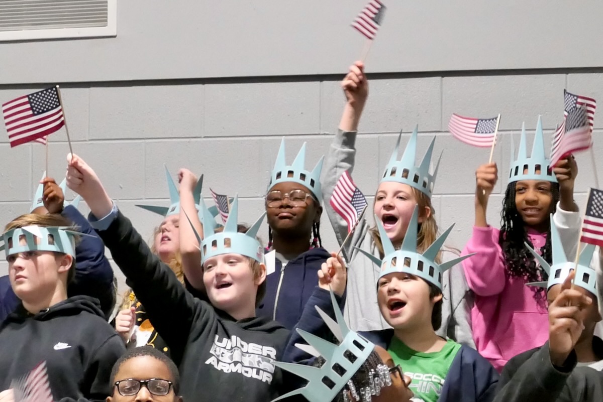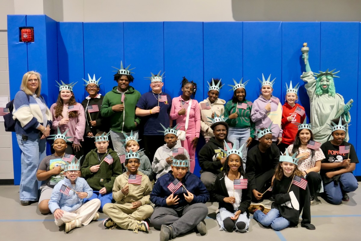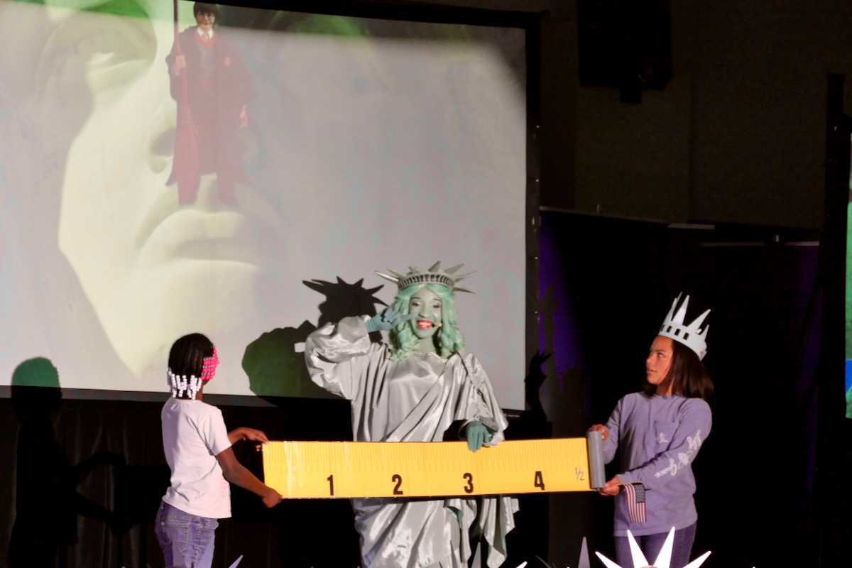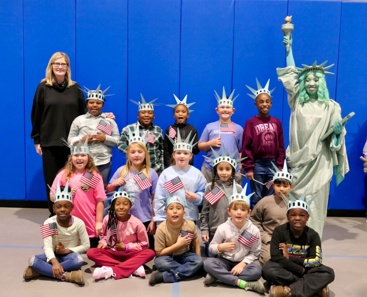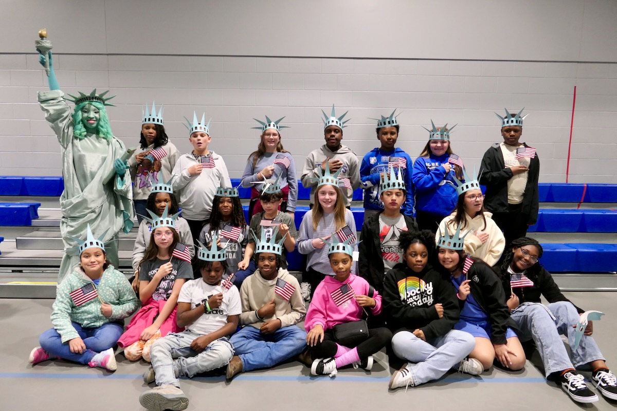 Today 2nd and 5th grade elementary students from Westside Elementary & US Jones Elementary Schools came together to kick off the Super Citizen Program for 2025-2026 School Year. They waved flags, wore Statue of Liberty crowns and counted down for Libby Liberty™ to take the stage. On three huge screens “live video” shows her Next Great Americans tour pulling up to the school and then the real-life Libby walked out from behind the screens!