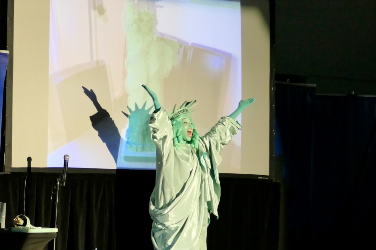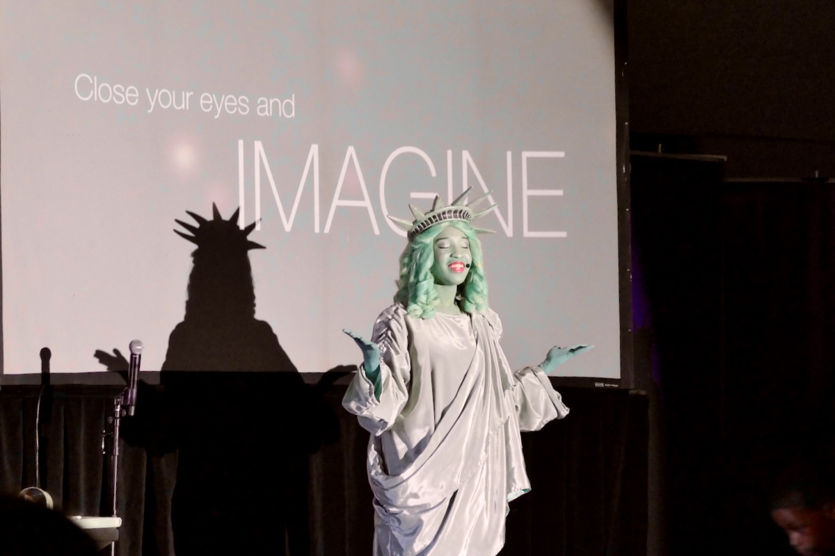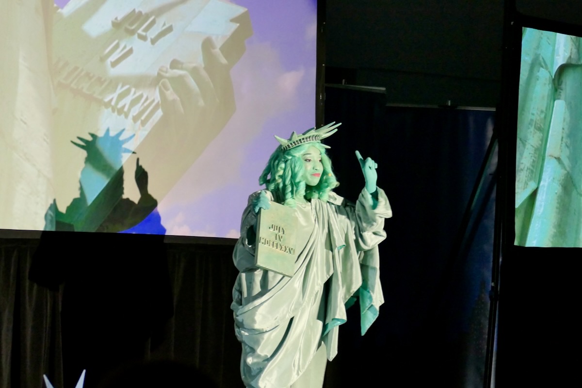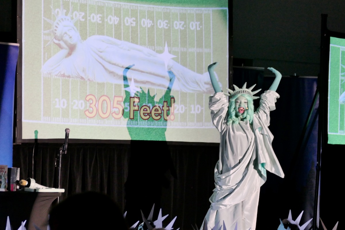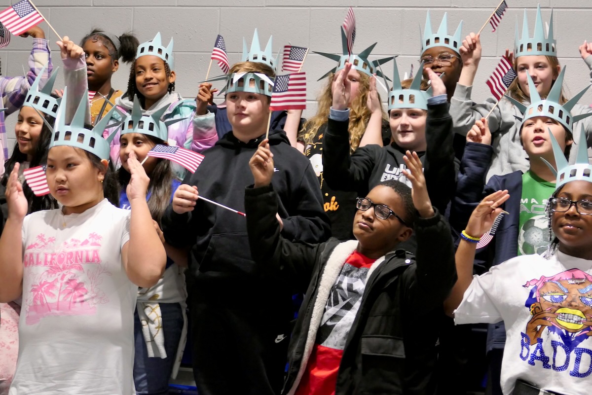 Today 2nd and 5th grade elementary students from Westside Elementary & US Jones Elementary Schools came together to kick off the Super Citizen Program for 2025-2026 School Year. They waved flags, wore Statue of Liberty crowns and counted down for Libby Liberty™ to take the stage. On three huge screens “live video” shows her Next Great Americans tour pulling up to the school and then the real-life Libby walked out from behind the screens!