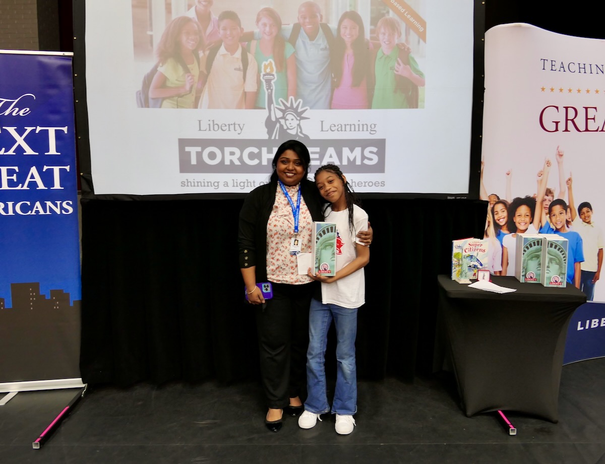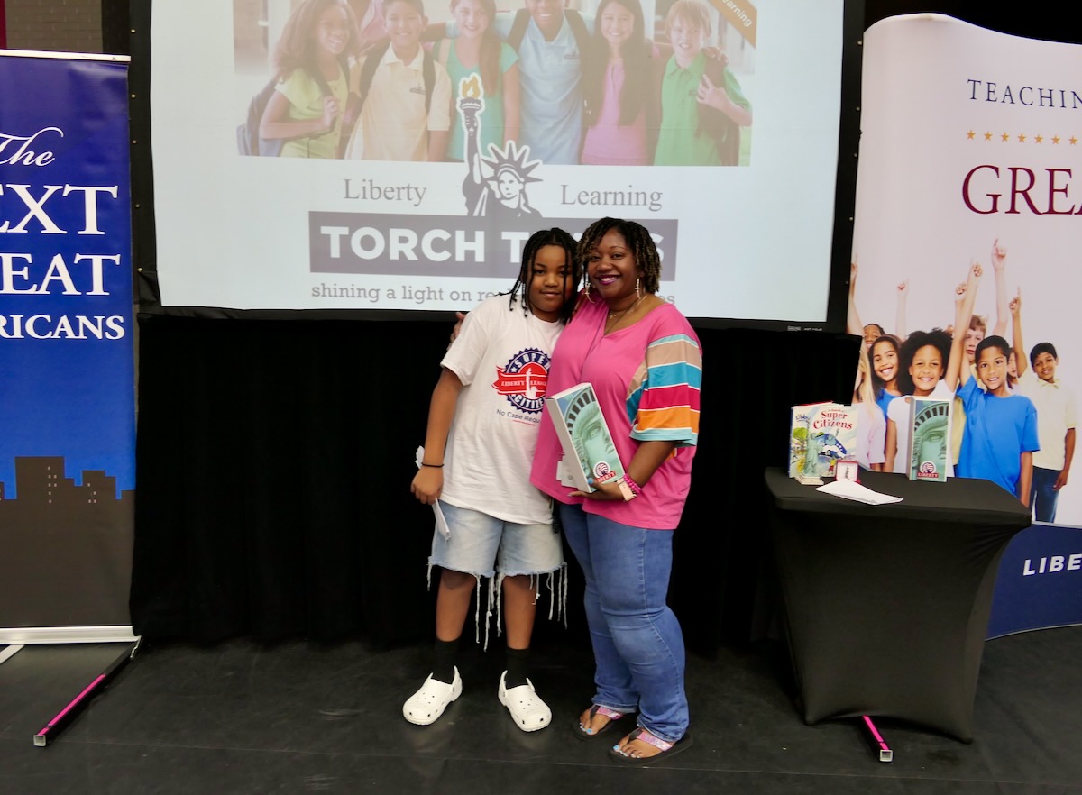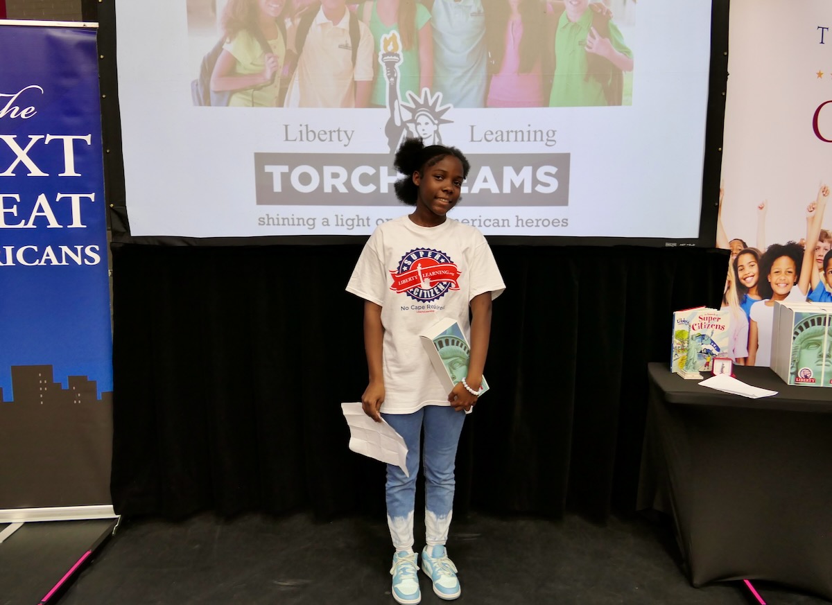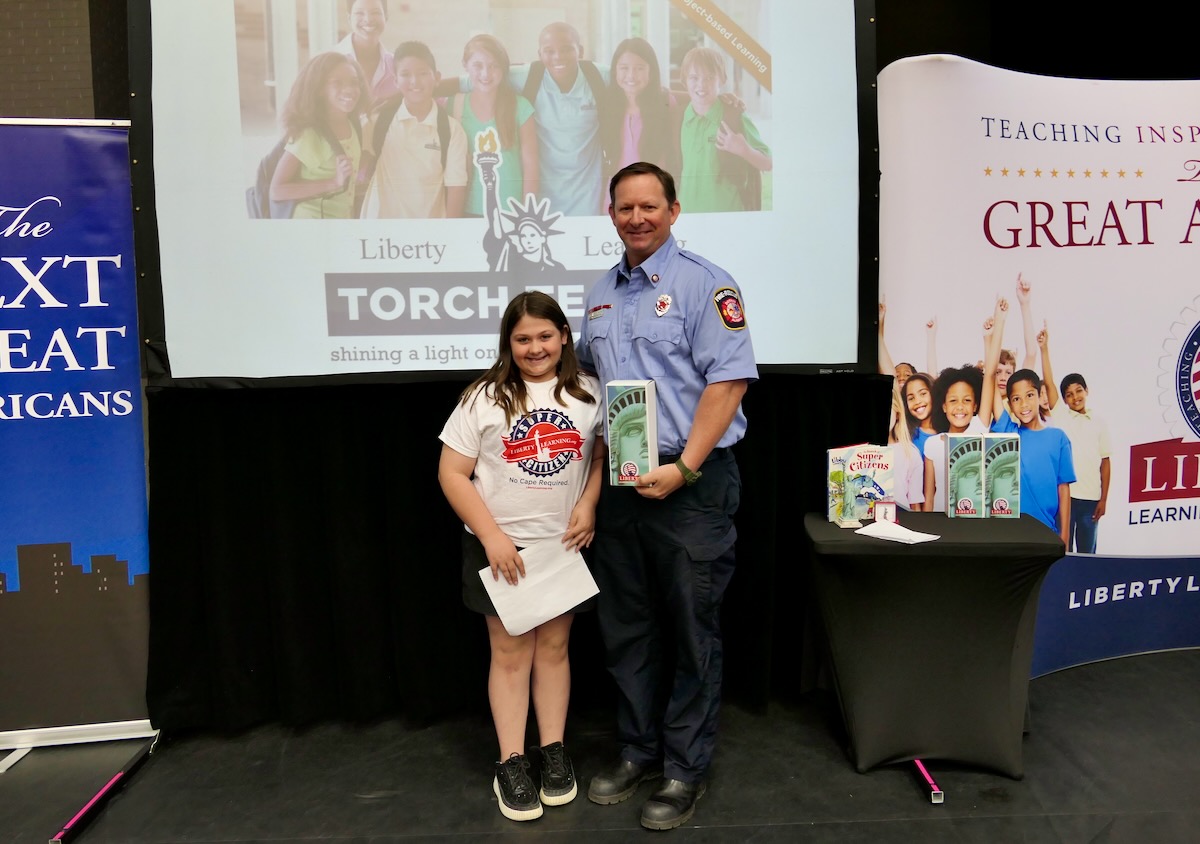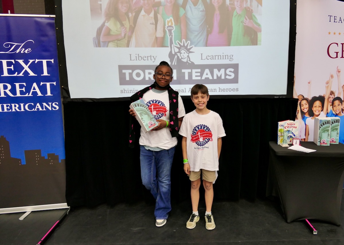 These students have learned their important roles in America’s future thanks to an immersive experience in civics, character, financial literacy and social studies. And in the closing piece of the program, Torch Teams (or “Helping Hands” for the younger students), students are applying those crucial lessons in the real world. They chose heroes who embodied the traits of amazing citizens and read essays from stage before presenting them with an Authentic Liberty Replicas & Liberty Pins. They learned that “when you honor a hero, you become a hero!”