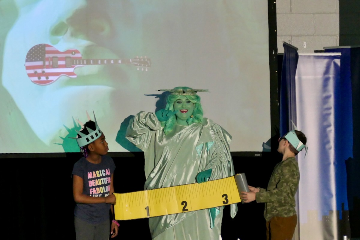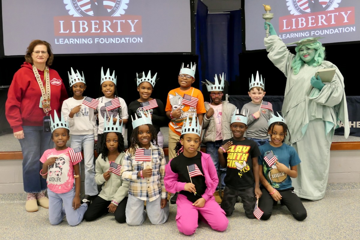 Today second and fourth grade elementary students from Early County Elementary School came together to kick off the Super Citizen Programs for 2025-2026 School Year. They waved flags, wore Statue of Liberty crowns and counted down for Libby Liberty™ to take the stage. On three huge screens “live video” shows her Next Great Americans tour pulling up to the school and then the real-life Libby walked out from behind the screens!