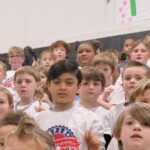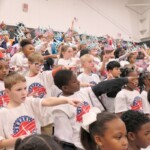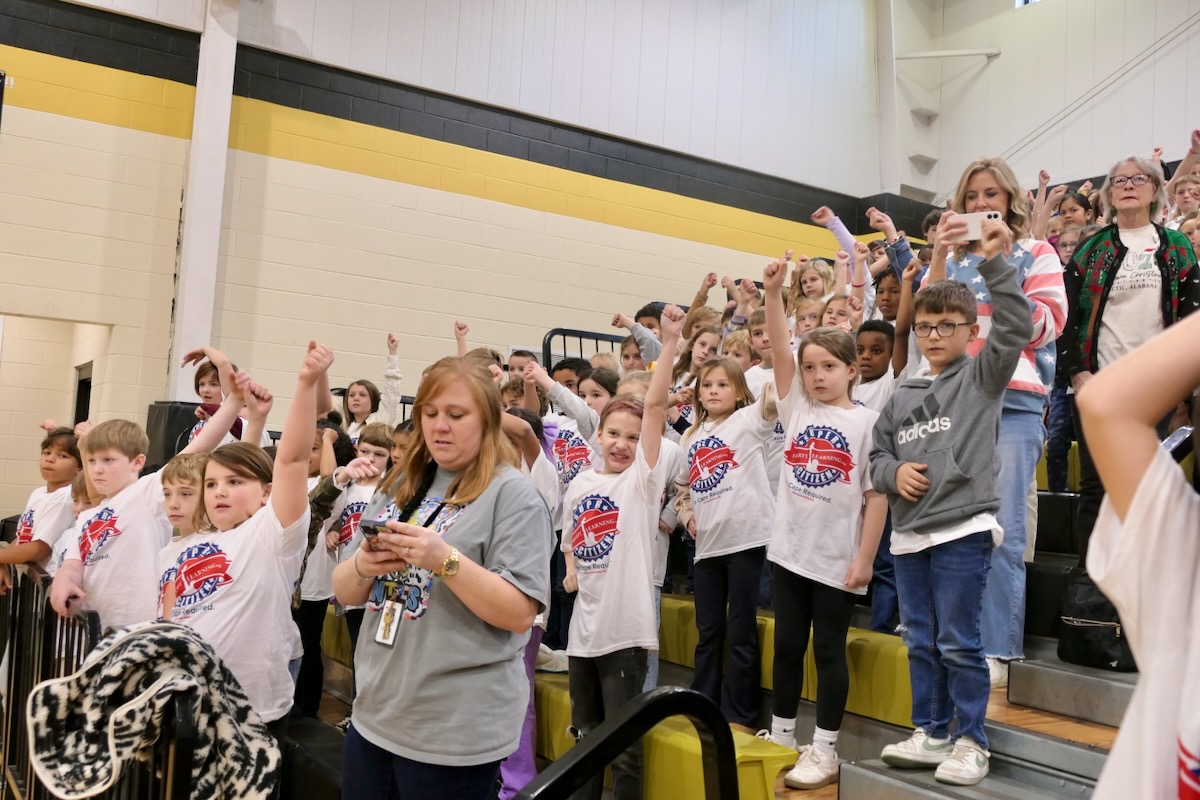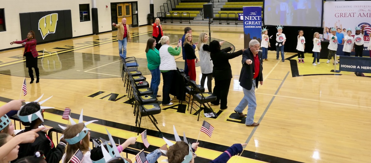 Today, 2nd graders from Coosada, Redland, Wetumpka, Holtville, & Eclectic Elementary Schools filled the Wetumpka High School Auditorium. After finishing 10 weeks in the Hands on Liberty Program, they are gathered to celebrate their accomplishments and honor local heroes from the stage.