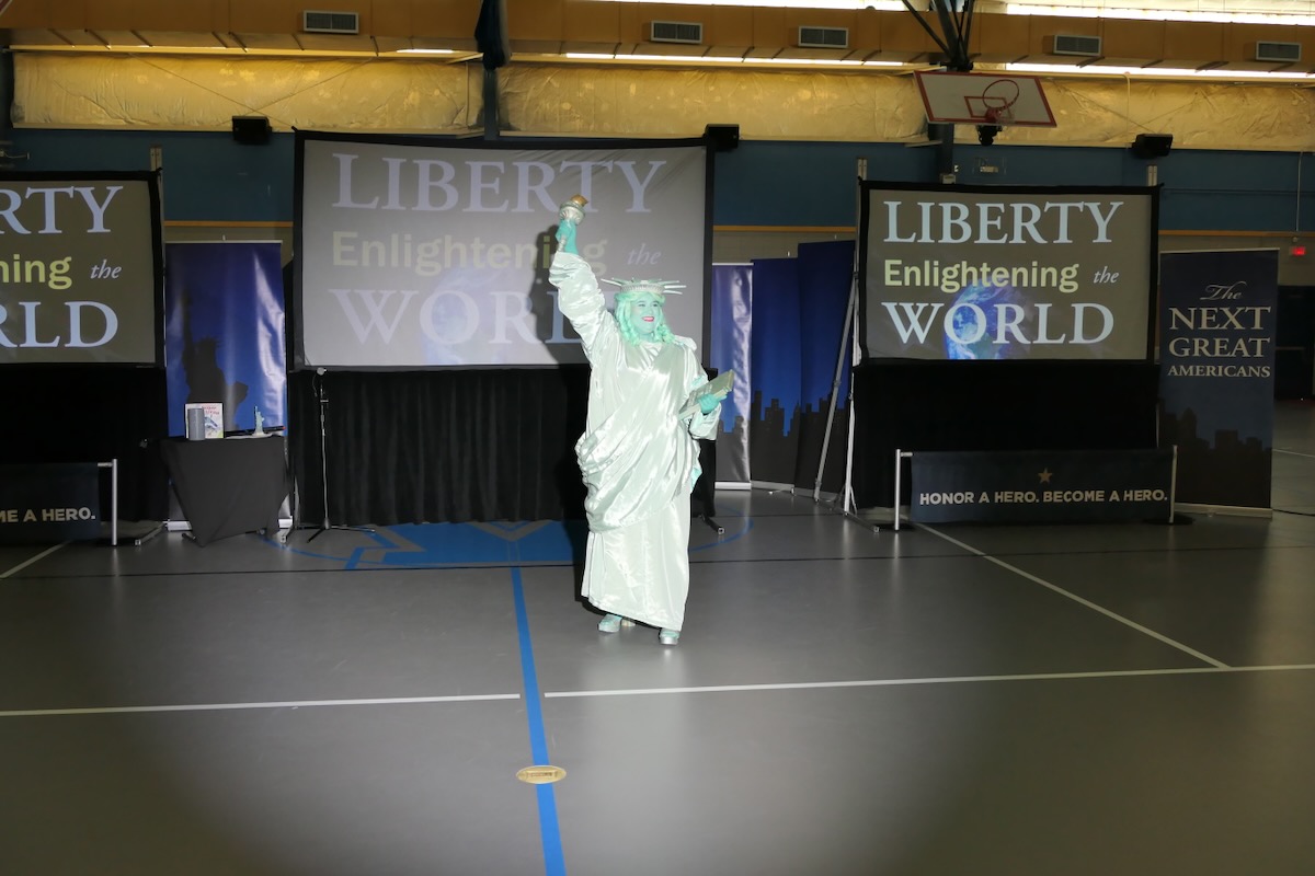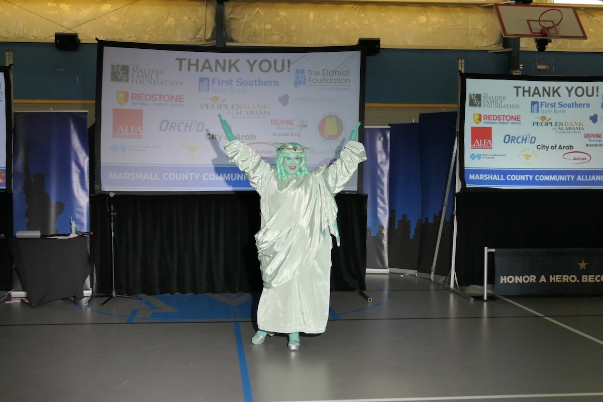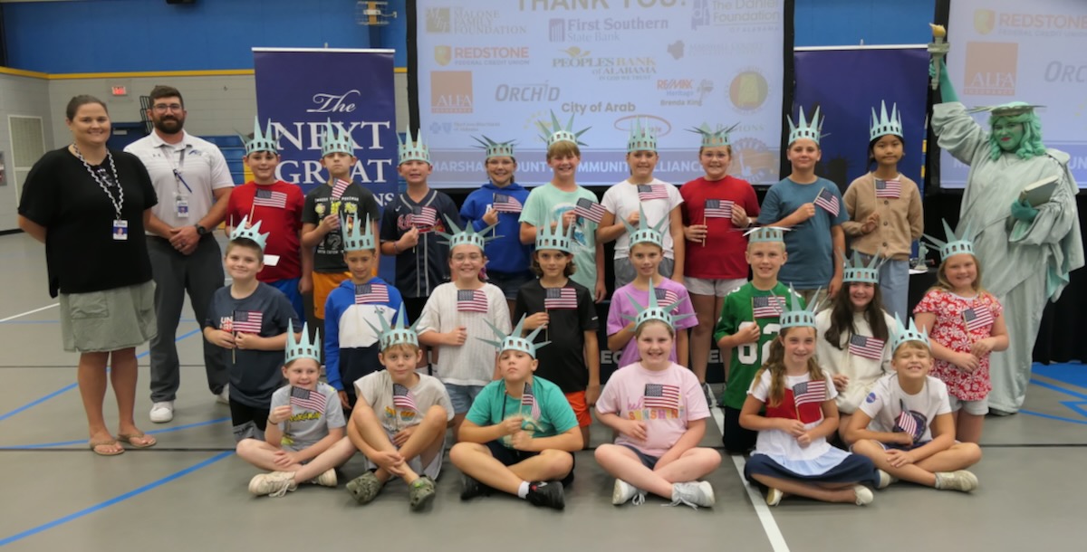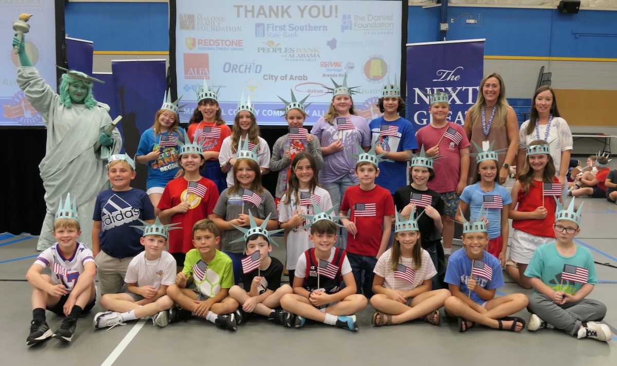 Arab Elementary crown-wearing, flag-waving fifth graders cheered, clapped and counted down to a grand entrance by Libby Liberty™ . Fresh off her Next Great Americans Tour, the lady in green brought history to life and introduced students to the 10-week civics, character, financial literacy and social studies program they’ll begin after her tour rolls away.