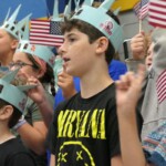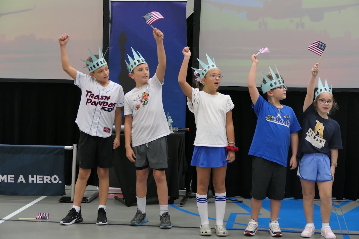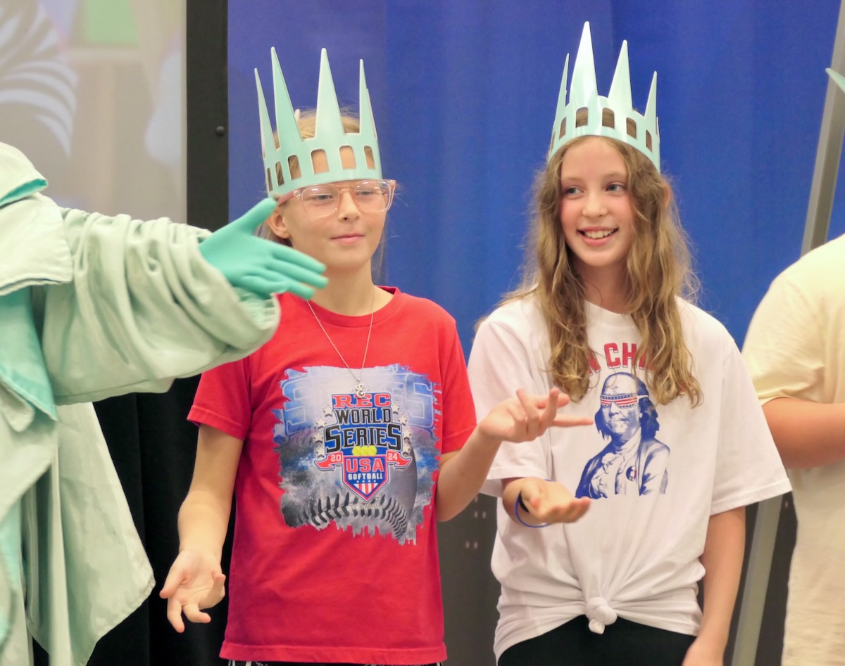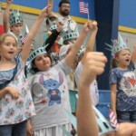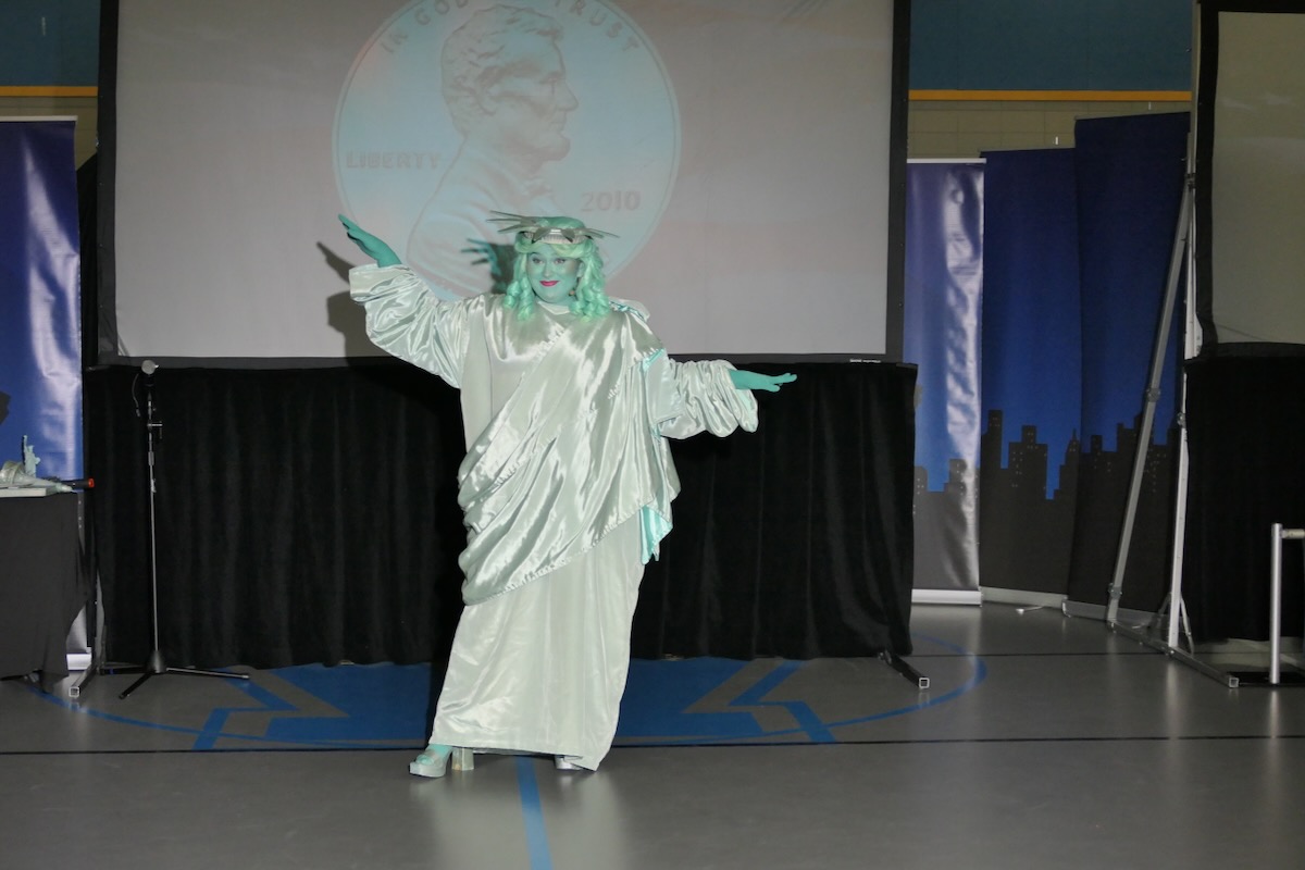 Arab Elementary crown-wearing, flag-waving fifth graders cheered, clapped and counted down to a grand entrance by Libby Liberty™ . Fresh off her Next Great Americans Tour, the lady in green brought history to life and introduced students to the 10-week civics, character, financial literacy and social studies program they’ll begin after her tour rolls away.