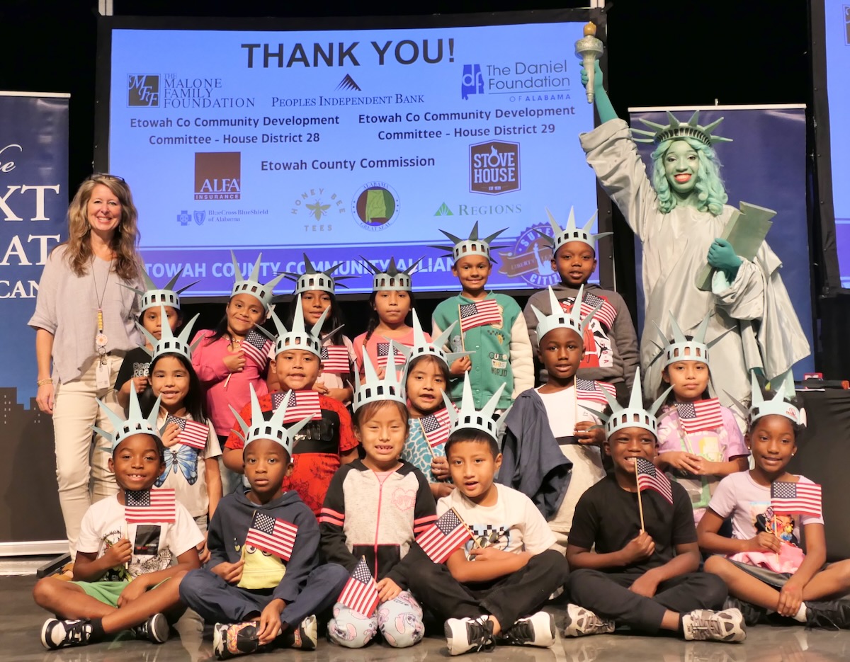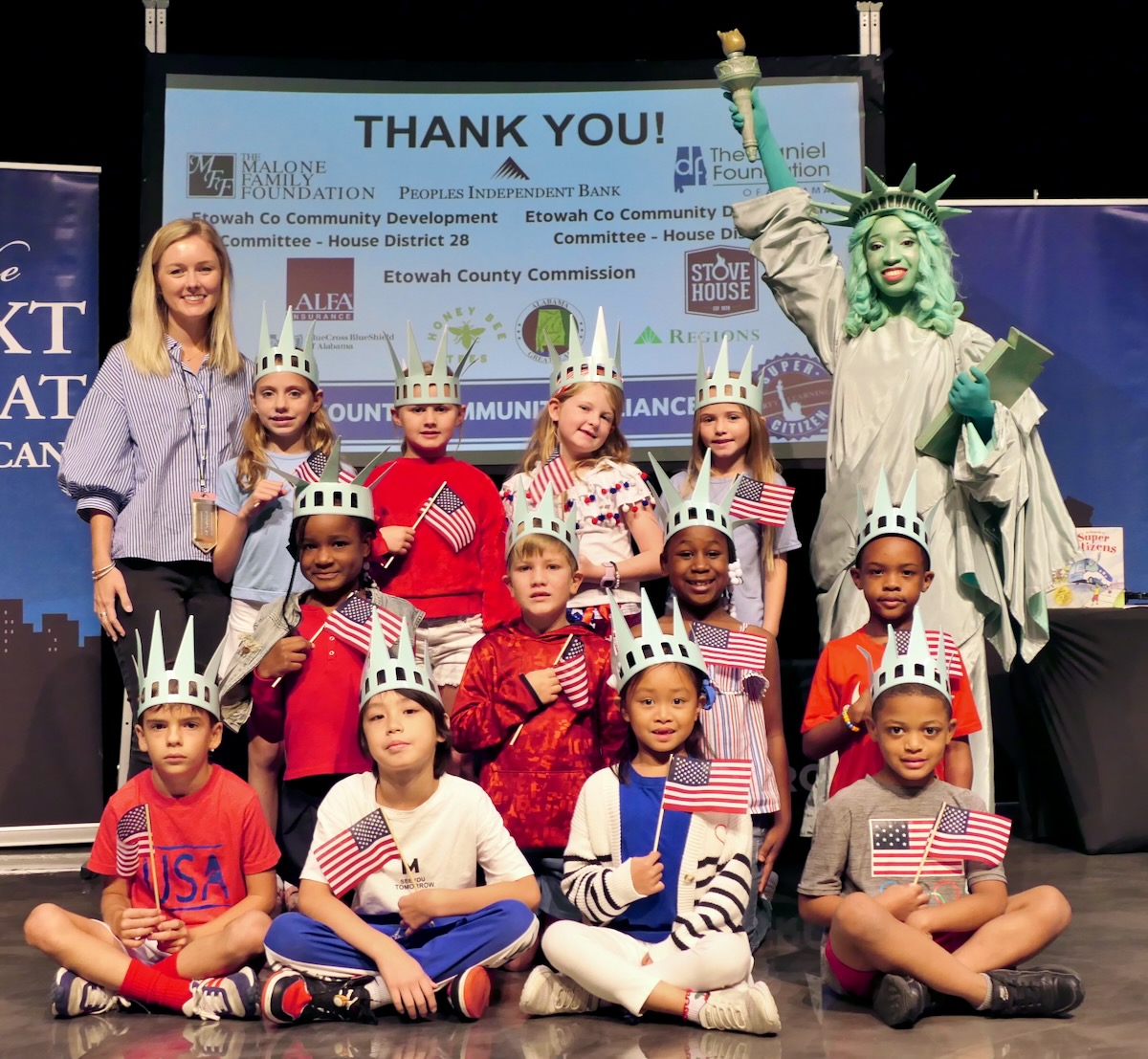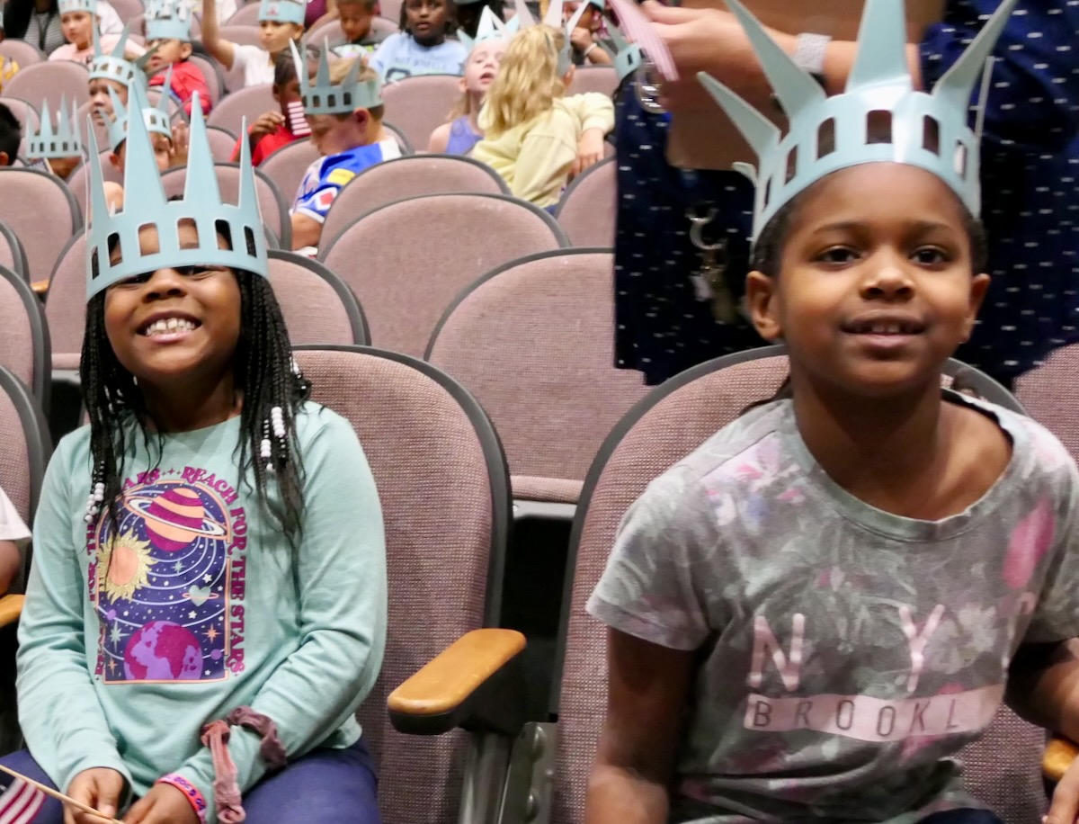 Today second graders from Gadsden City Schools cheered and counted down to the grand entrance of Libby Liberty™. Wearing green paper crowns and waving tiny American flags, they showed their enthusiasm for the Super Citizen Program they’ll begin after today’s theatrical performance.