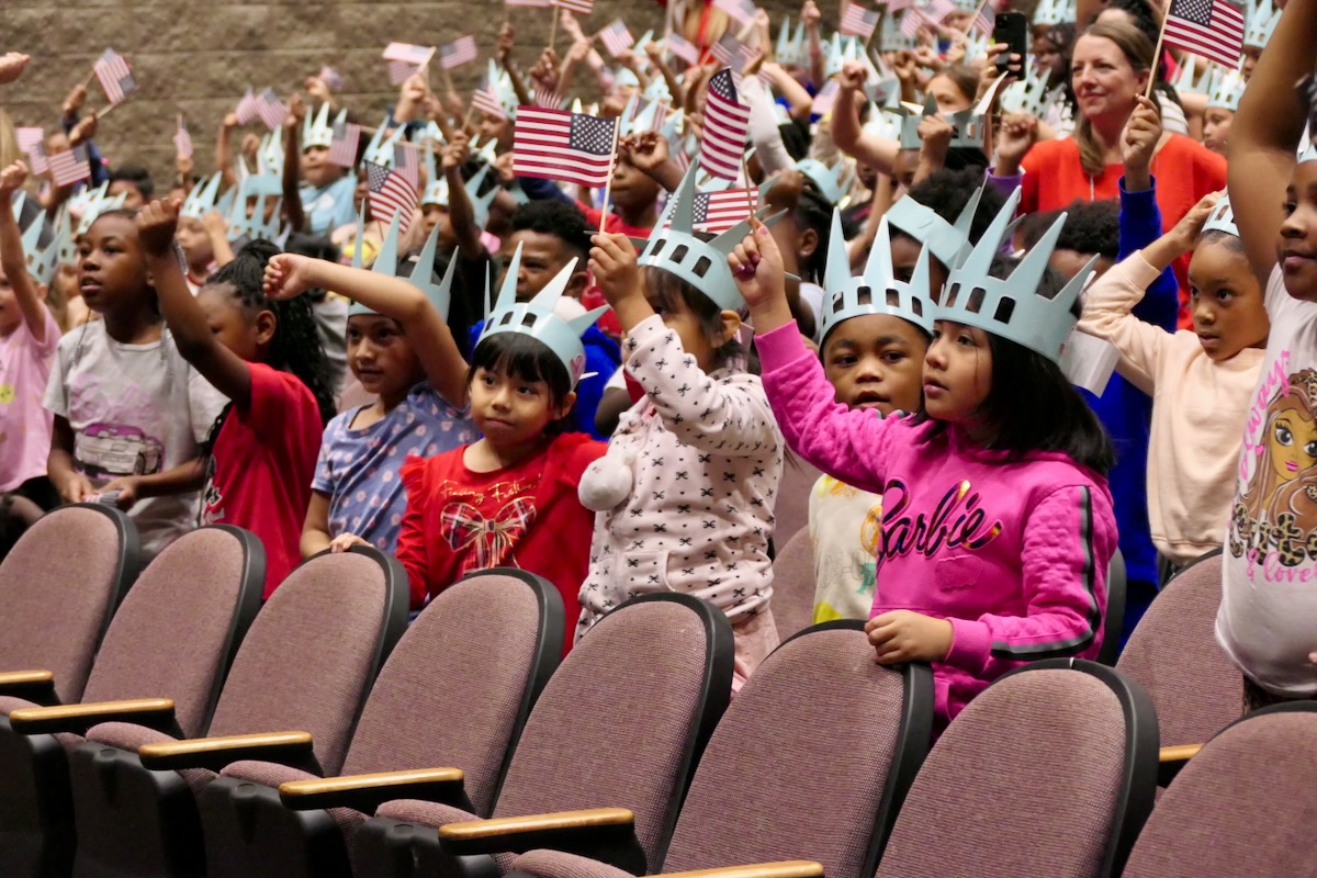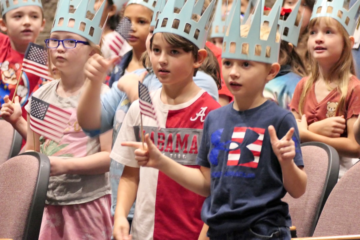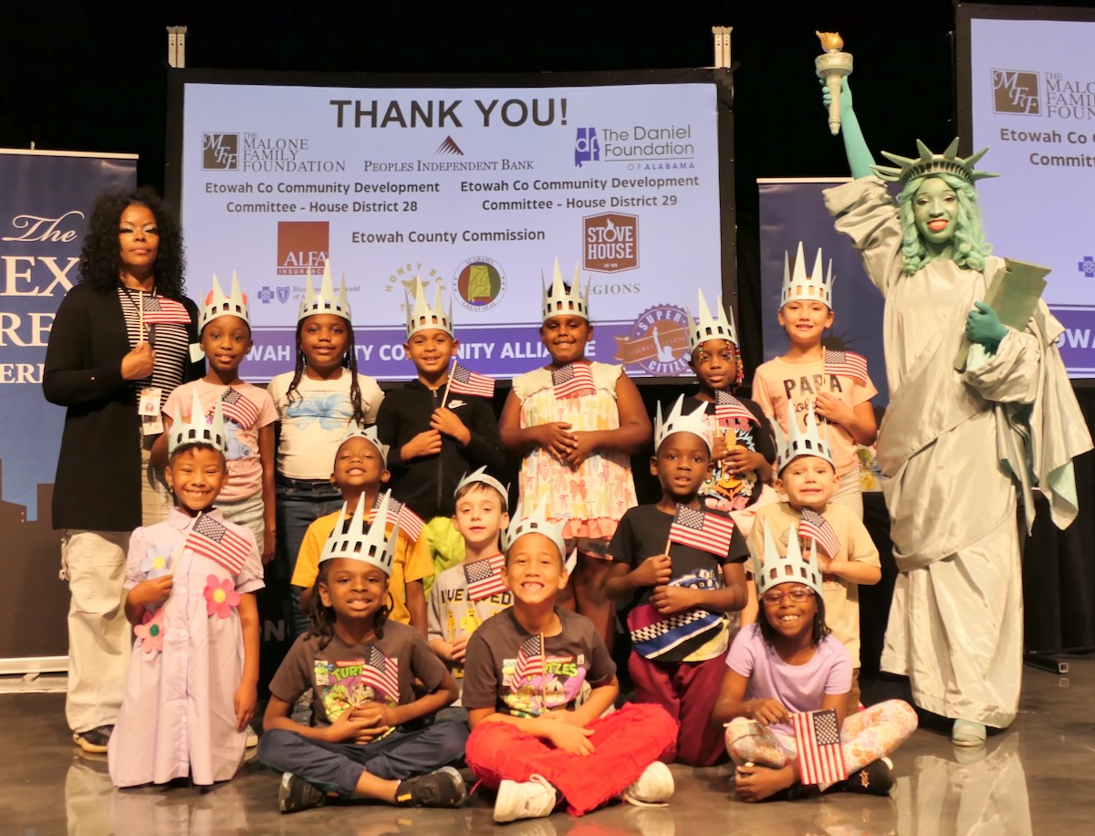 Today second graders from Gadsden City Schools cheered and counted down to the grand entrance of Libby Liberty™. Wearing green paper crowns and waving tiny American flags, they showed their enthusiasm for the Super Citizen Program they’ll begin after today’s theatrical performance.