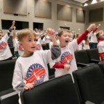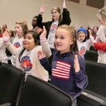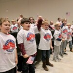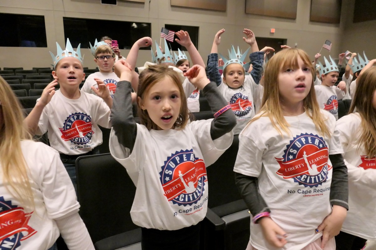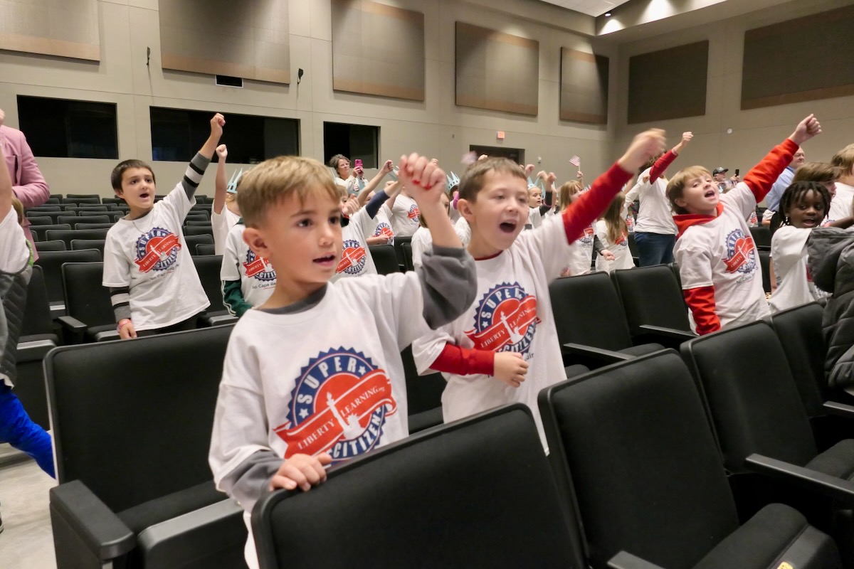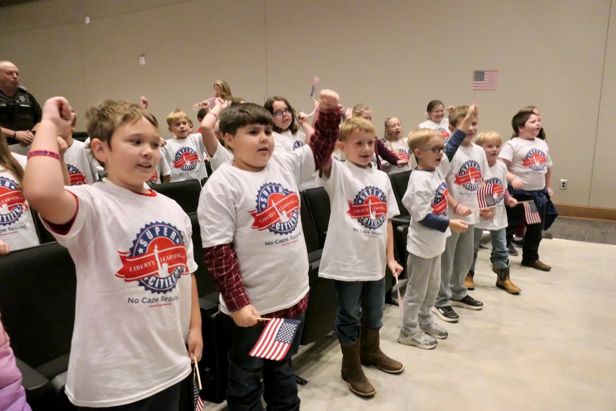 Today, 2nd graders from Jackson County Schools filled the Kevin Dukes Career & Innovation Academy- Auditorium. After finishing 10 weeks in the Hands on Liberty Program, they are gathered to celebrate their accomplishments and honor local heroes from the stage.