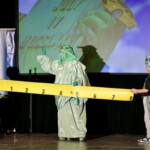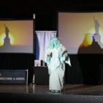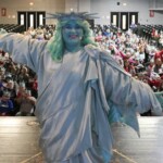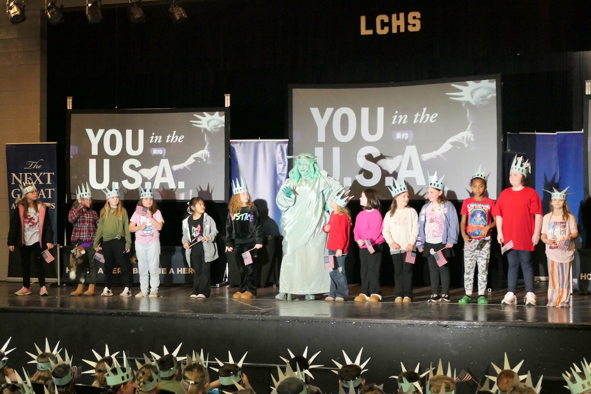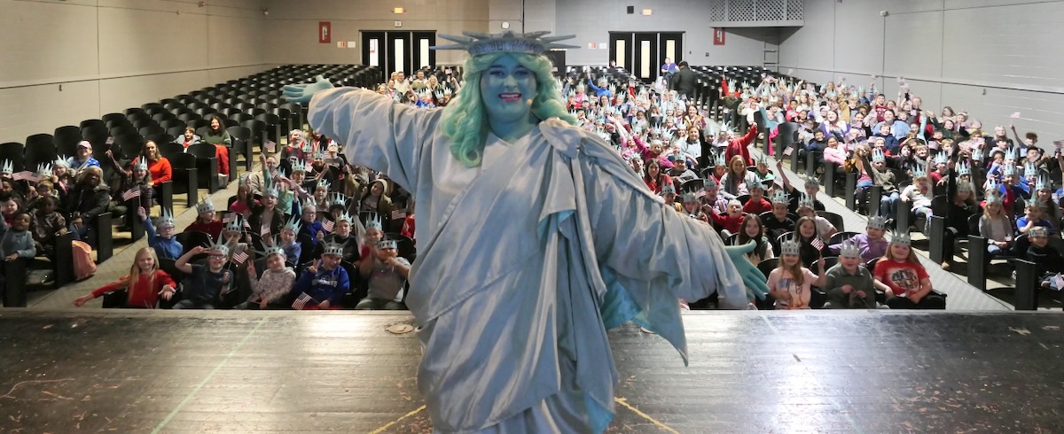 Liberty Learning Foundation (with generous sponsorship by the Lawrence County Community Alliance) is kicking off the program in a big way. Not only are students watching as the vivacious Statue of Liberty character brings history to life, they are also being introduced to the man who will give them a “hand” with lessons back in their classrooms. As Libby winds down, she hands the screen over to Mr. Palmer, a brash and brilliant hand-character who leads students in lessons in civics, character, financial literacy and our Great American Story.