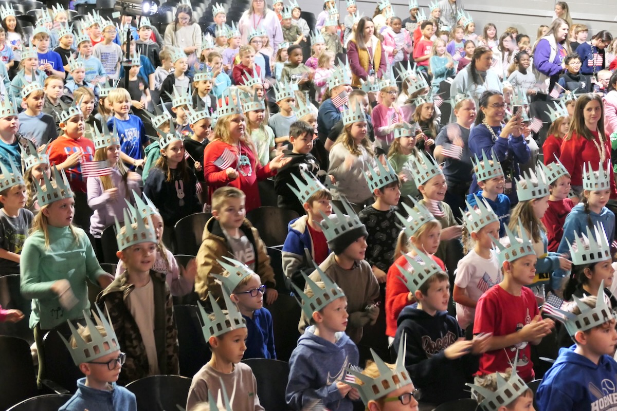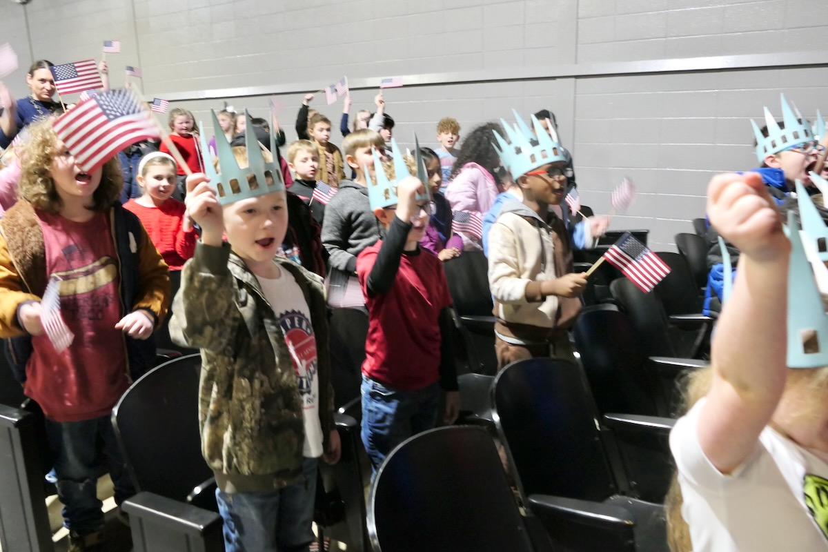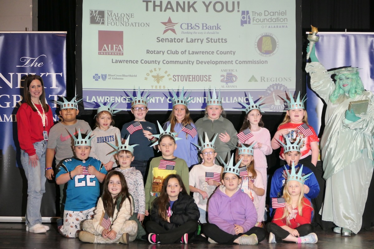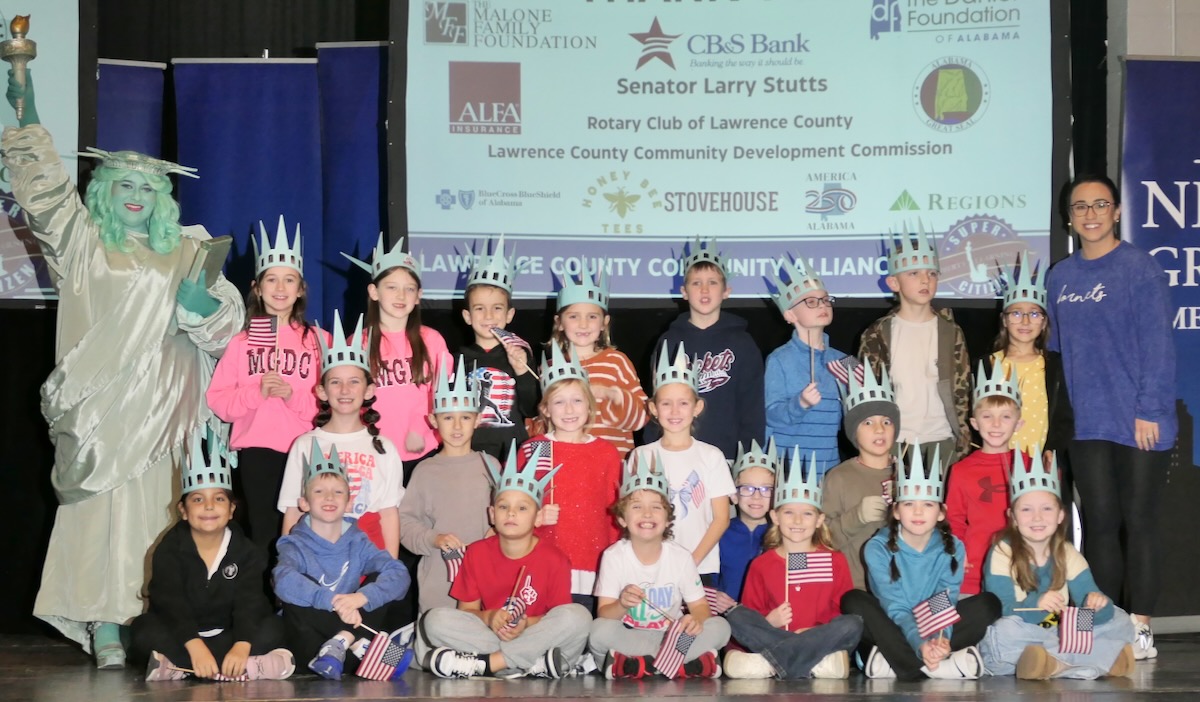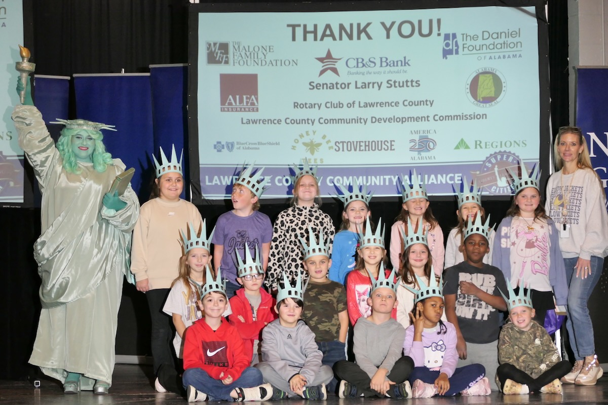 Today second graders from East Lawrence, Hazelwood, Moulton, Lawrence County Signature, Mt. Hope, Speake, & Hatton Elementary Schools cheered and counted down to the grand entrance of Libby Liberty™. Wearing green paper crowns and waving tiny American flags, they showed their enthusiasm for the Super Citizen Program they’ll begin after today’s theatrical performance.