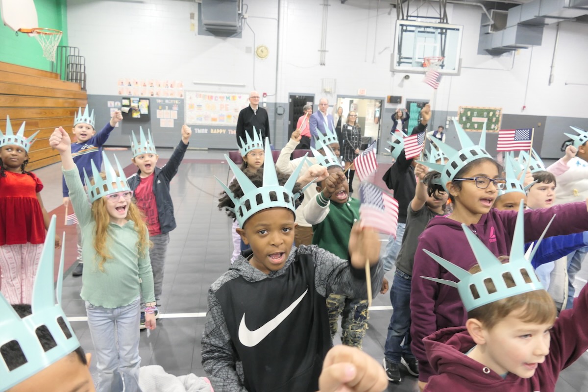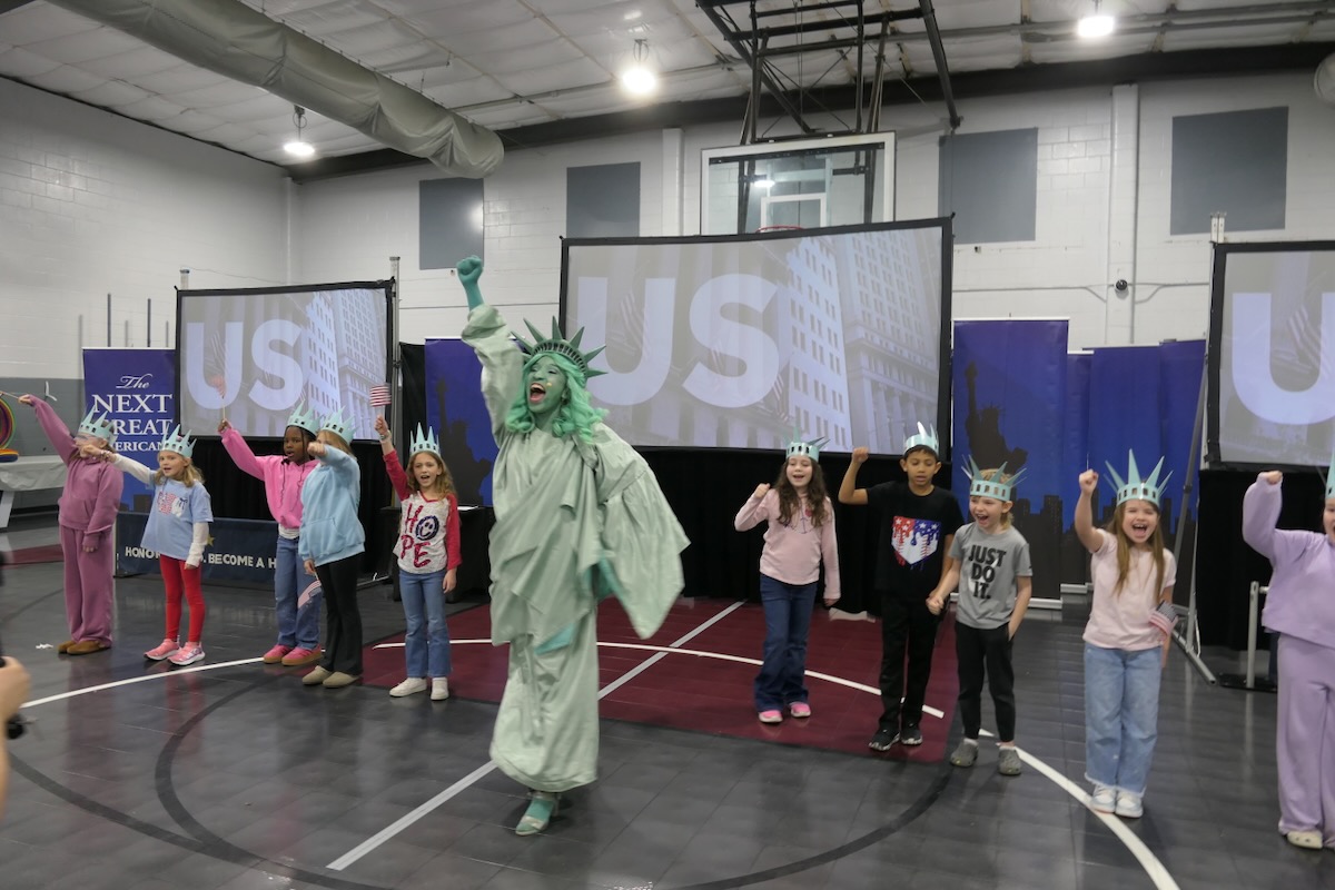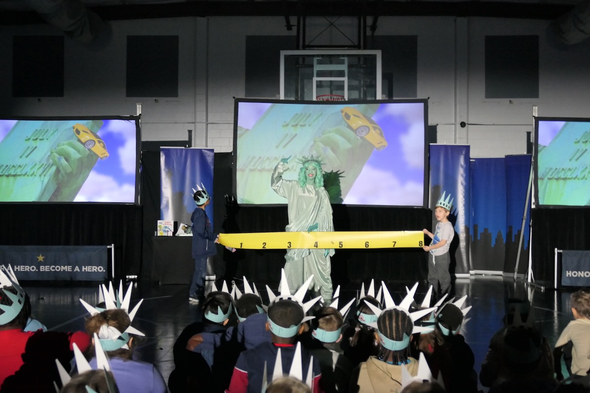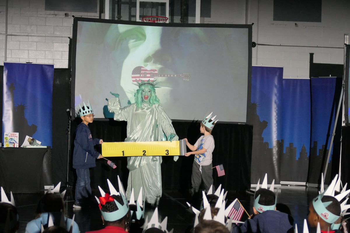 Today second graders from Gardendale Elementary School cheered and counted down to the grand entrance of Libby Liberty™. Wearing green paper crowns and waving tiny American flags, they showed their enthusiasm for the Super Citizen Program they’ll begin after today’s theatrical performance.