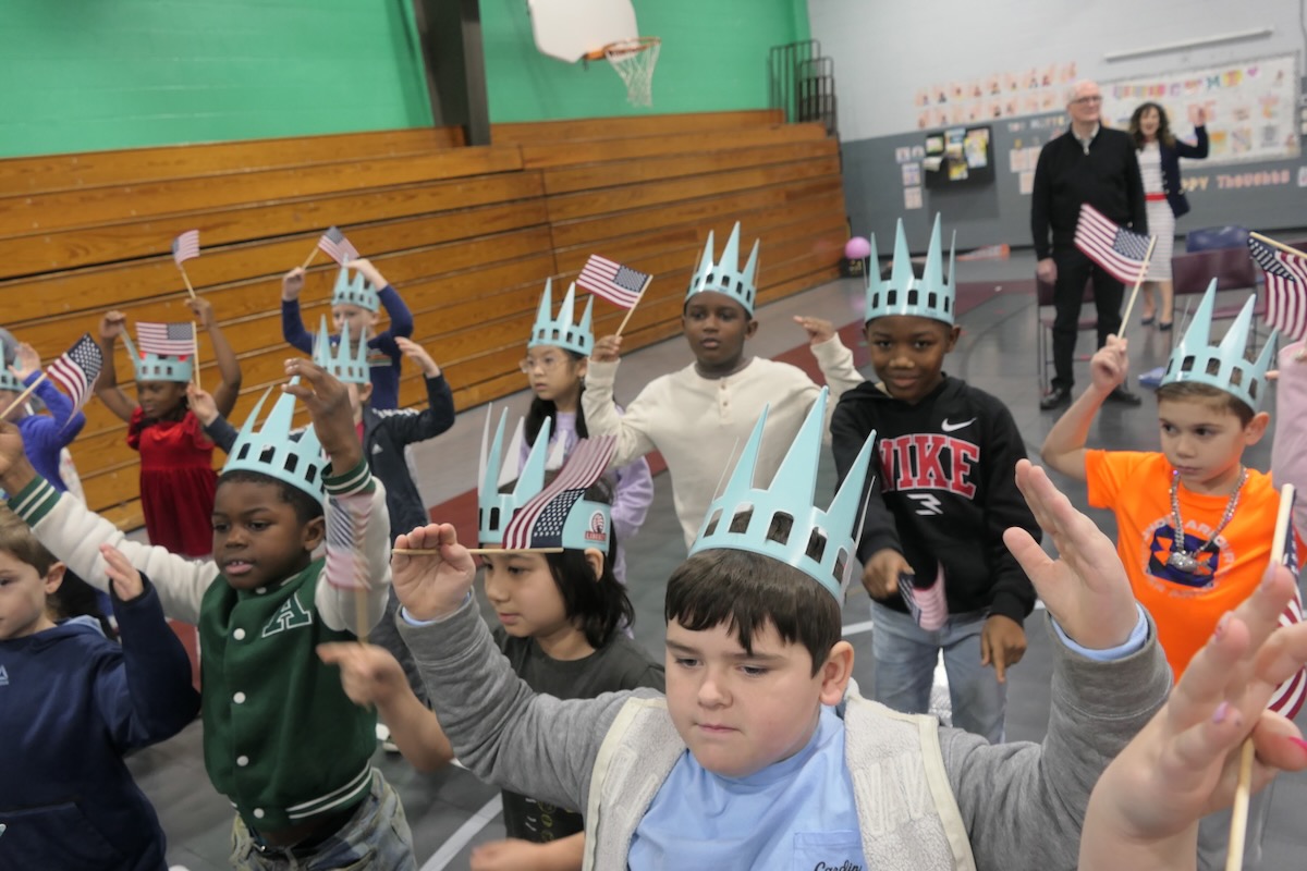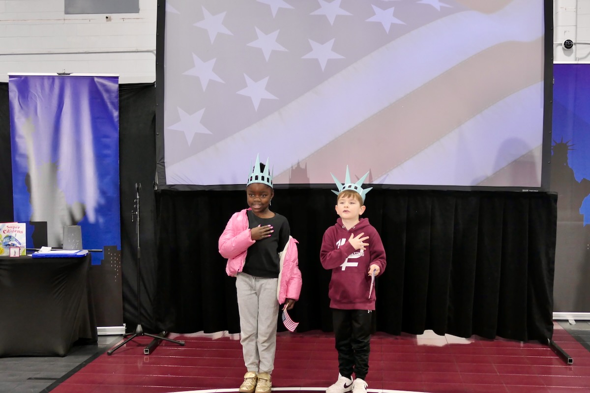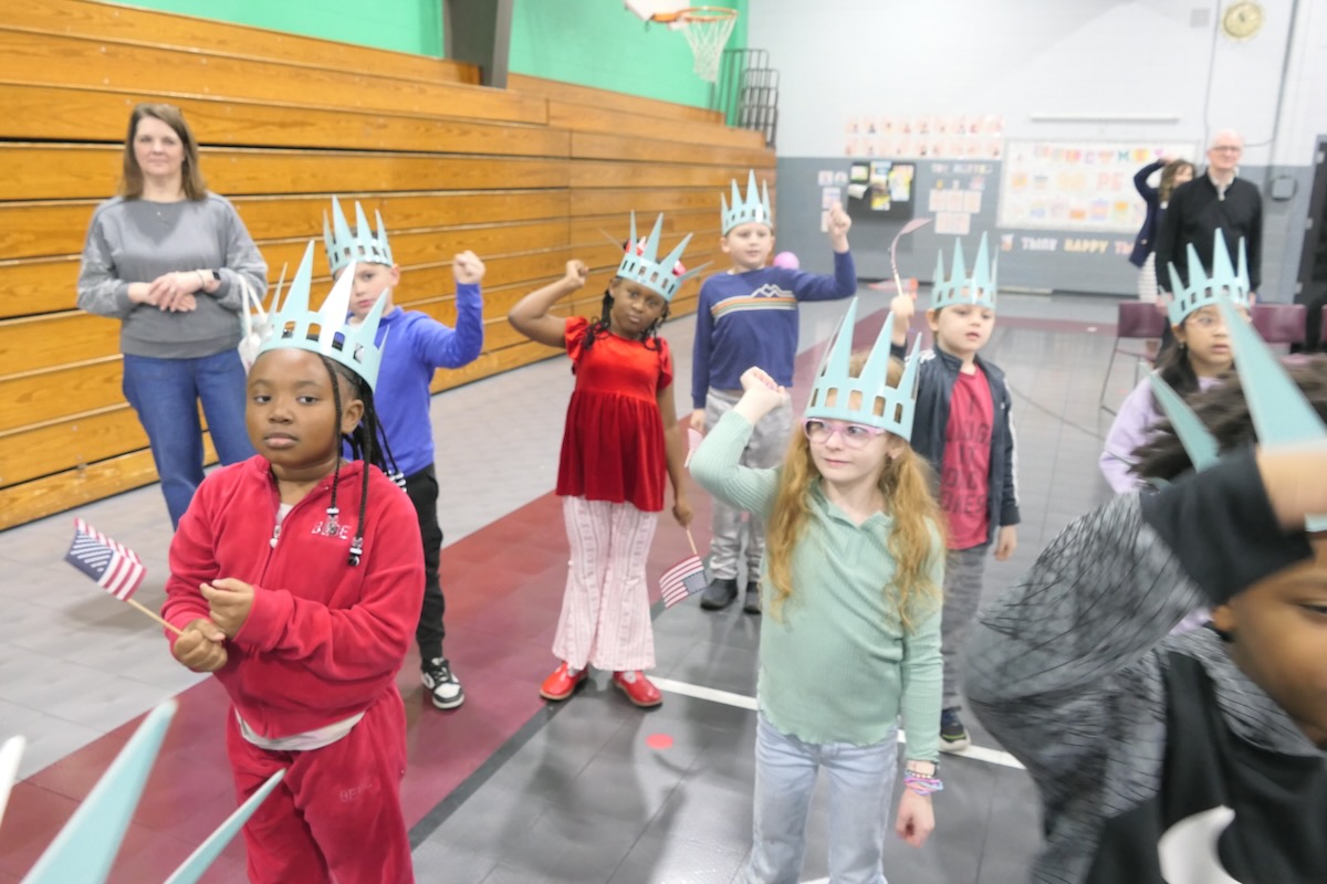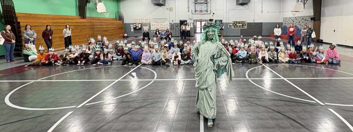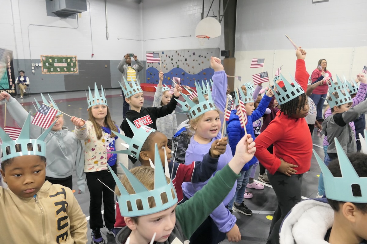 Today second graders from Gardendale Elementary School cheered and counted down to the grand entrance of Libby Liberty™. Wearing green paper crowns and waving tiny American flags, they showed their enthusiasm for the Super Citizen Program they’ll begin after today’s theatrical performance.
