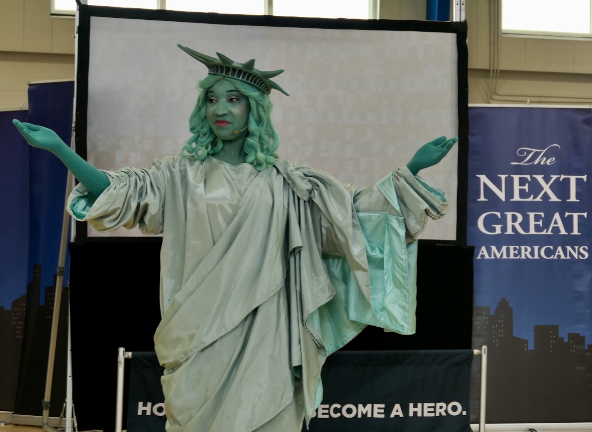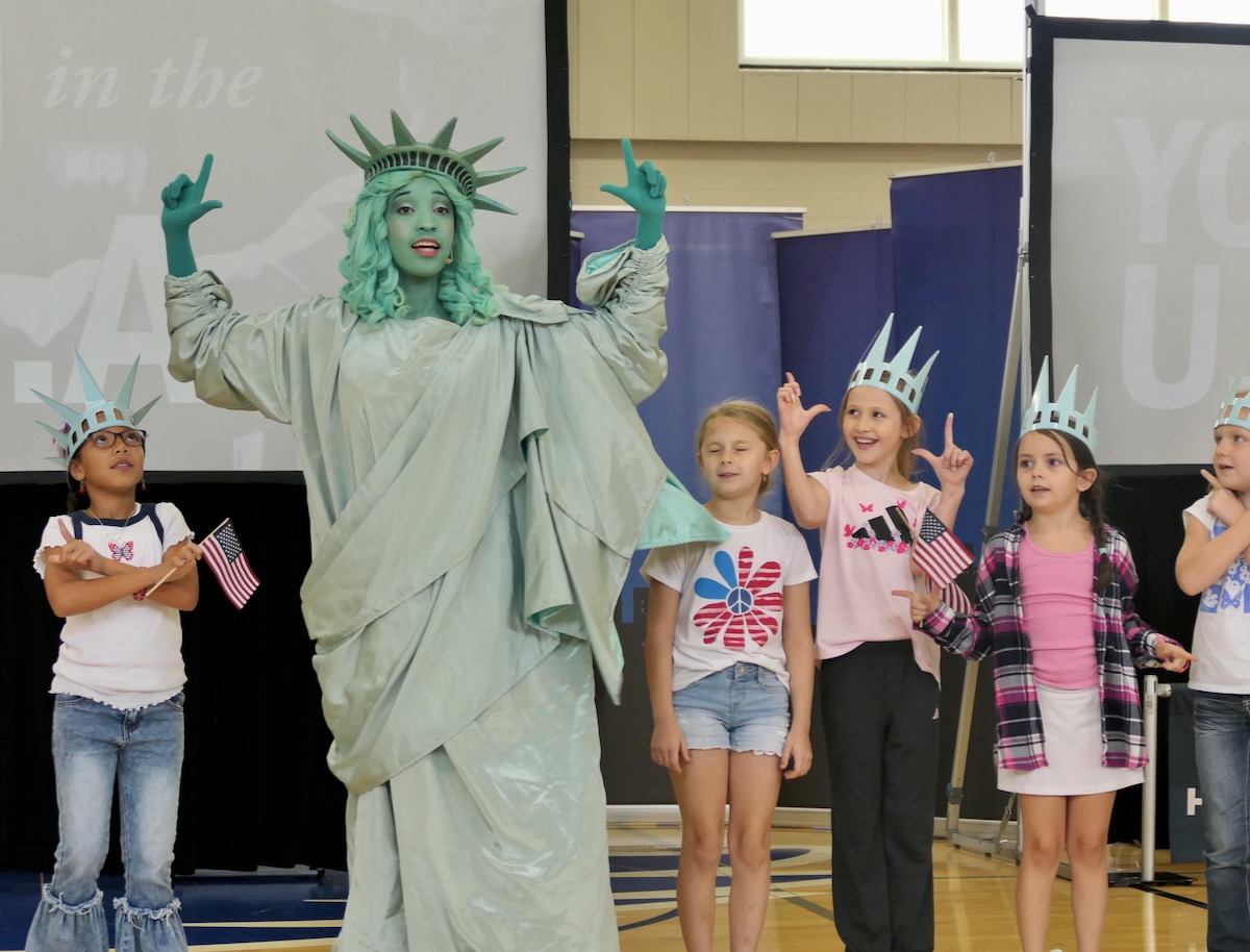 Today second graders from Cherokee, Colbert Heights, Hatton, Leighton, & New Bethel Elementary Schools cheered and counted down to the grand entrance of Libby Liberty™. Wearing green paper crowns and waving tiny American flags, they showed their enthusiasm for the Super Citizen Program they’ll begin after today’s theatrical performance.