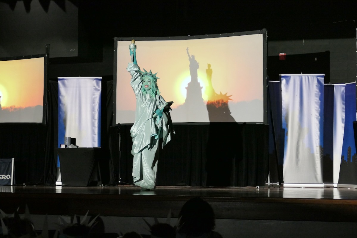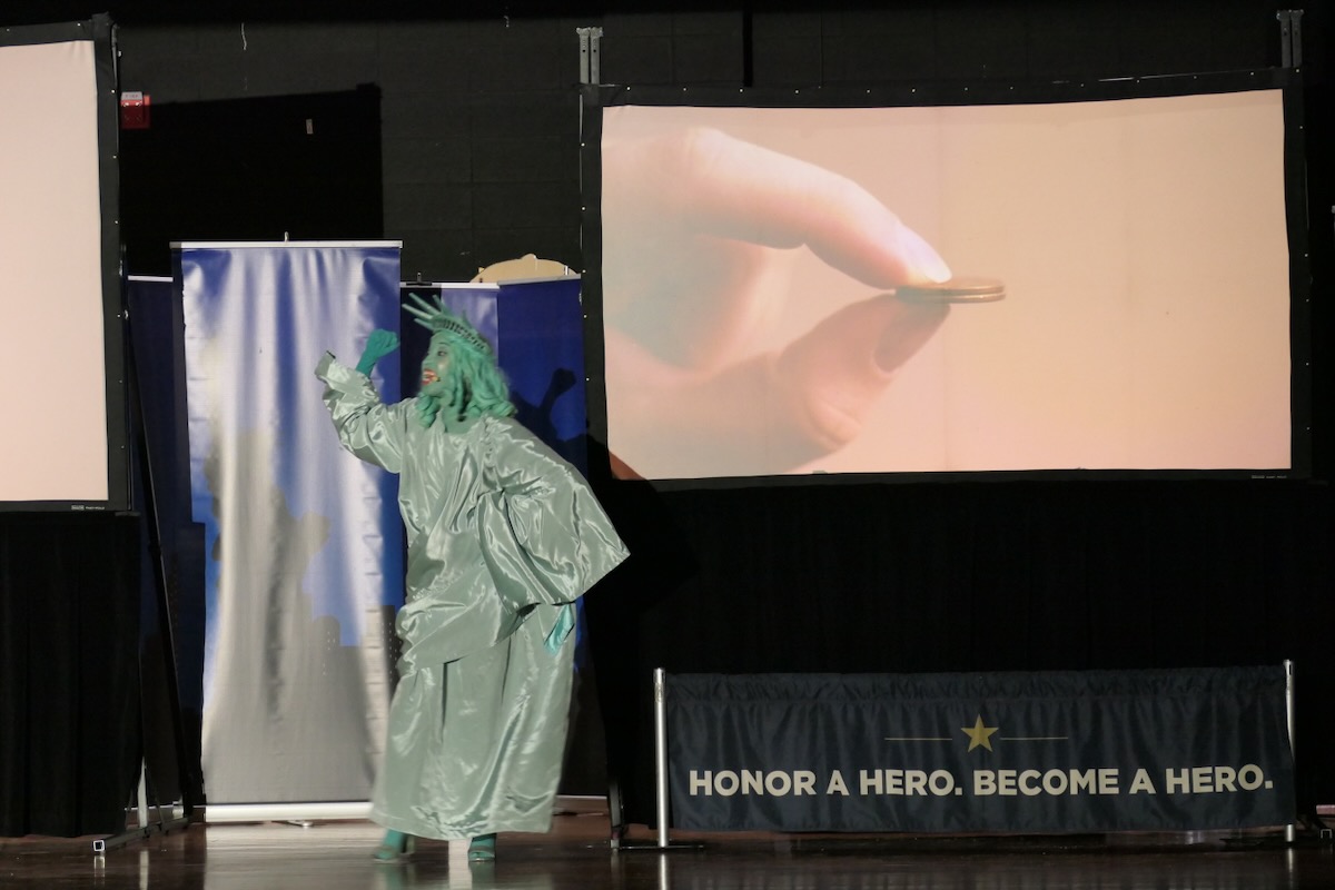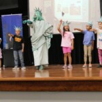 Liberty Learning Foundation (with generous sponsorship by the Russell County Community Alliance) is kicking off the program in a big way. Not only are students watching as the vivacious Statue of Liberty character brings history to life, they are also being introduced to the man who will give them a “hand” with lessons back in their classrooms. As Libby winds down, she hands the screen over to Mr. Palmer, a brash and brilliant hand-character who leads students in lessons in civics, character, financial literacy and our Great American Story.