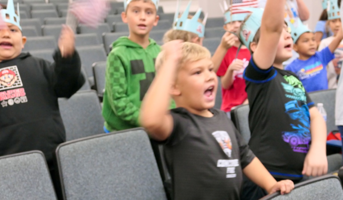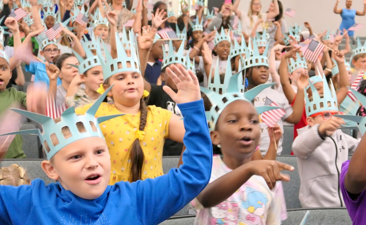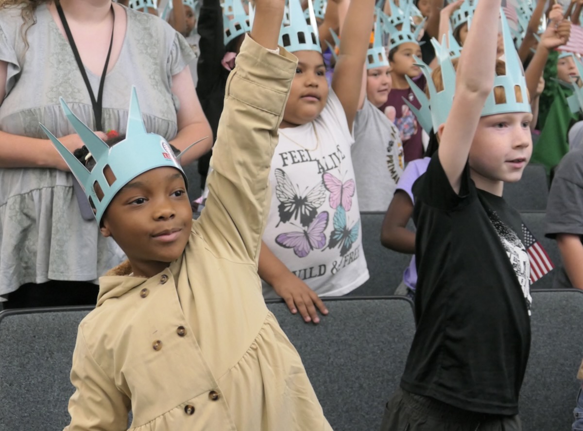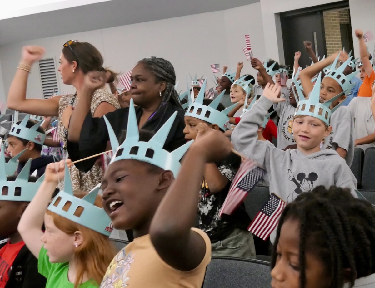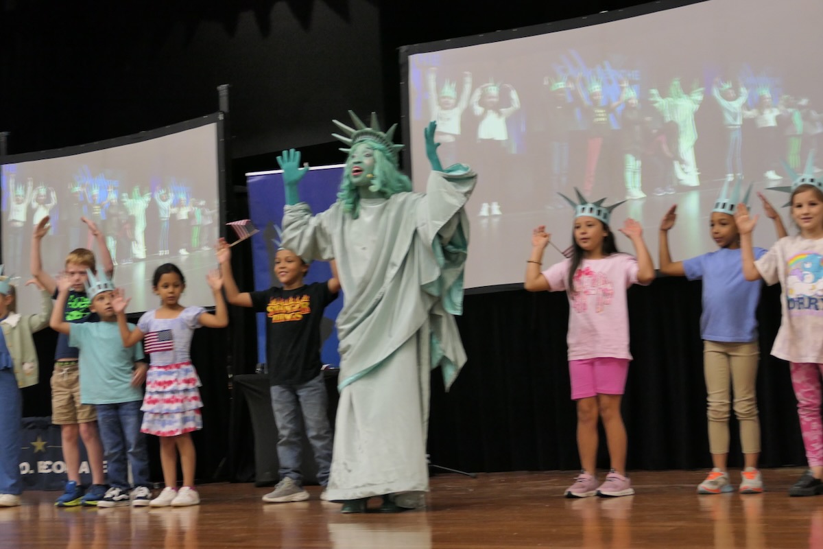 Today Dixie, Ladonia, Mt Olive, & Oliver Elementary Schools second graders cheered and counted down to the grand entrance of Libby Liberty™. Wearing green paper crowns and waving tiny American flags, they showed their enthusiasm for the Super Citizen Program they’ll begin after today’s theatrical performance.