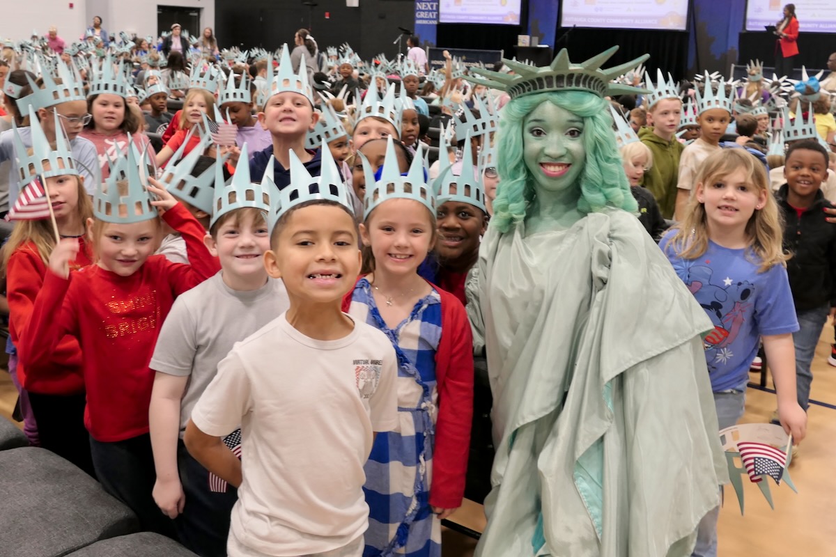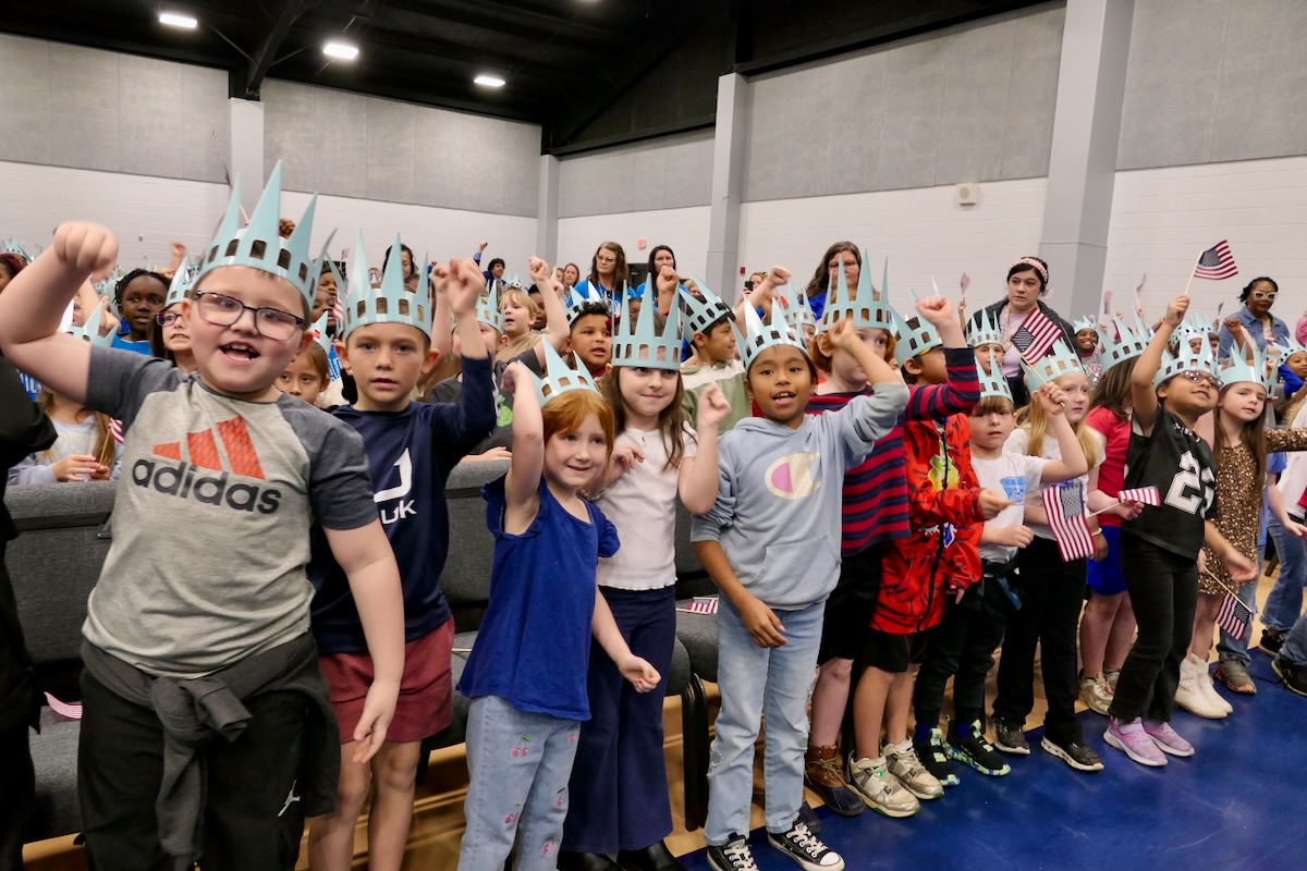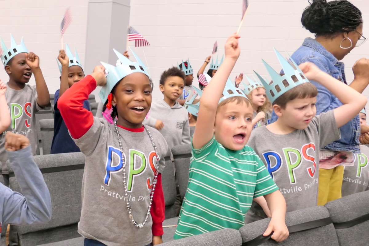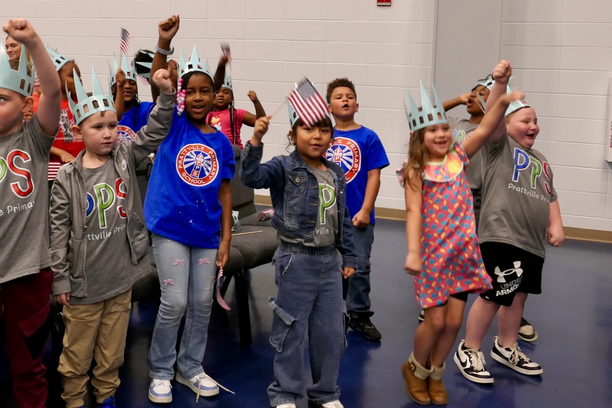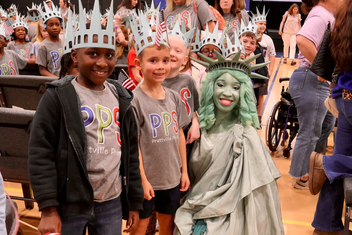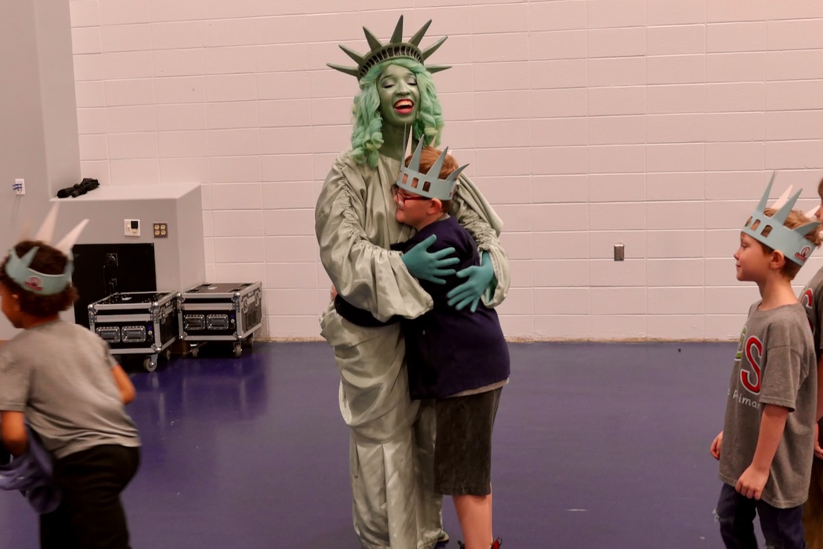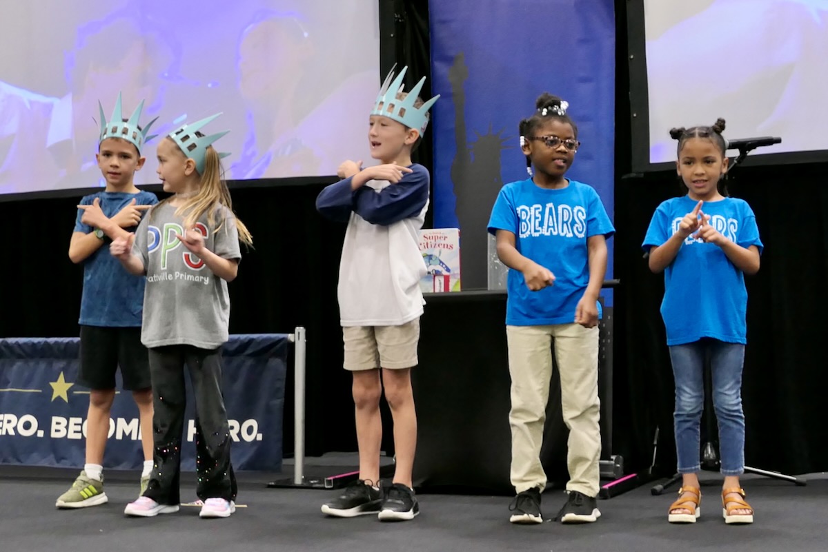 Today first graders from Billingsley High School, Daniel Pratt Elementary School, Pine Level Elementary School, &Prattville Primary School cheered and counted down to the grand entrance of Libby Liberty™. Wearing green paper crowns and waving tiny American flags, they showed their enthusiasm for the Super Citizen Program they’ll begin after today’s theatrical performance.