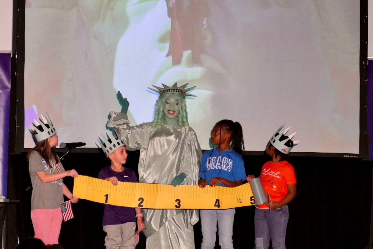 Liberty Learning Foundation (with generous sponsorship by the Autauga County Community Alliance) is kicking off the program in a big way. Not only are students watching as the vivacious Statue of Liberty character brings history to life, they are also being introduced to the man who will give them a “hand” with lessons back in their classrooms. As Libby winds down, she hands the screen over to Mr. Palmer, a brash and brilliant hand-character who leads students in lessons in civics, character, financial literacy and our Great American Story.