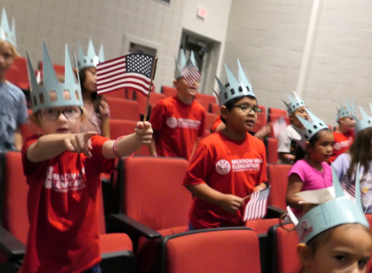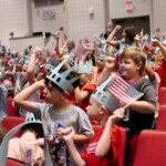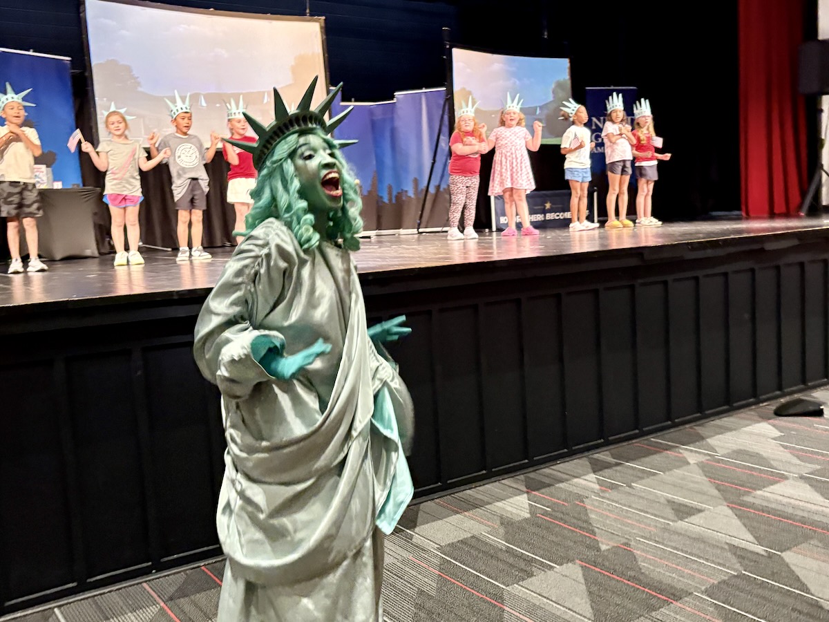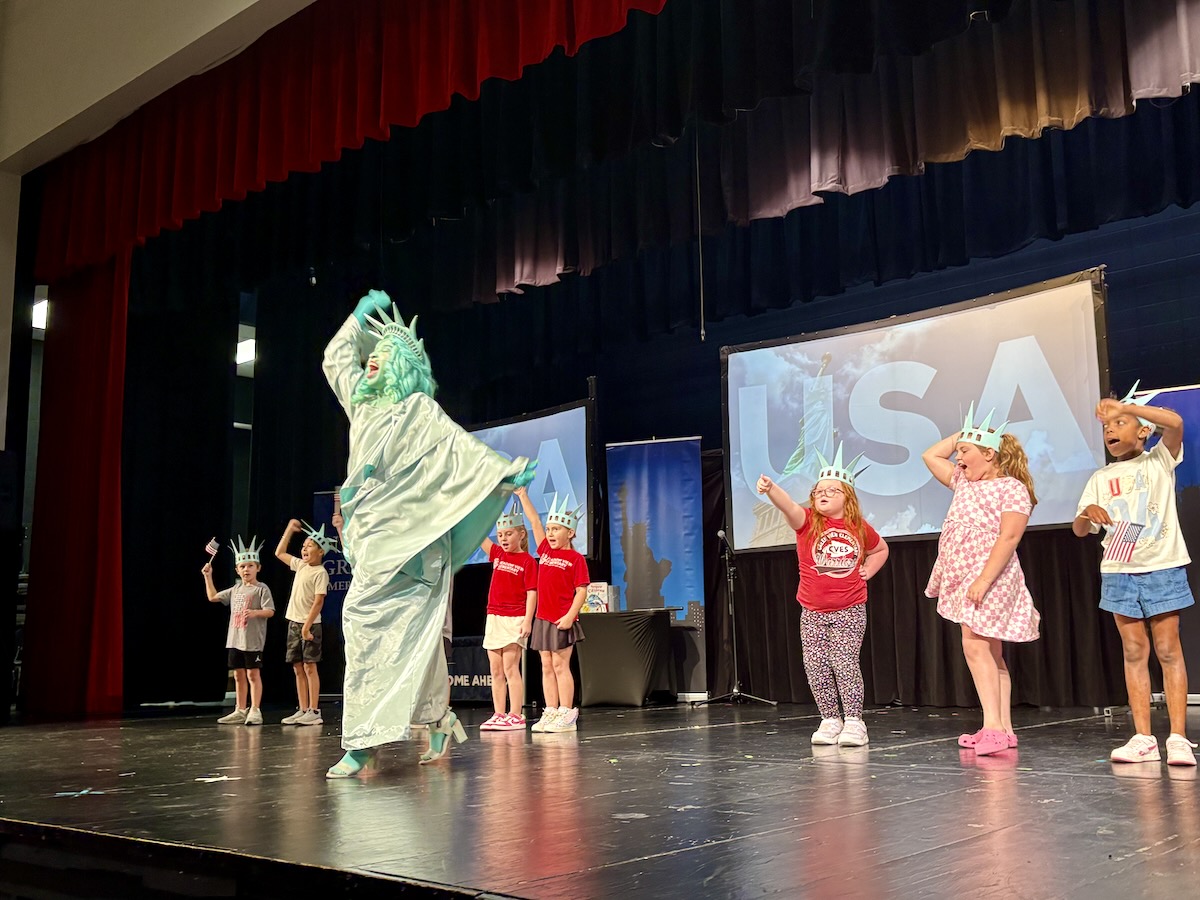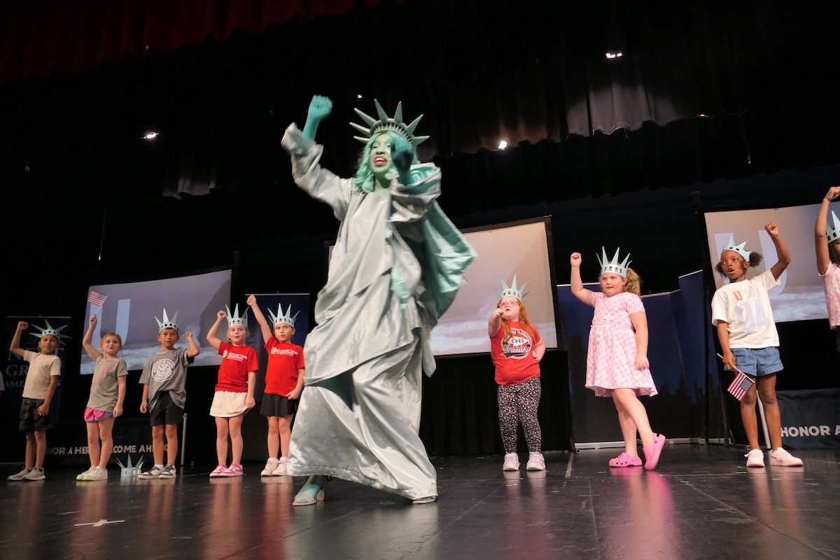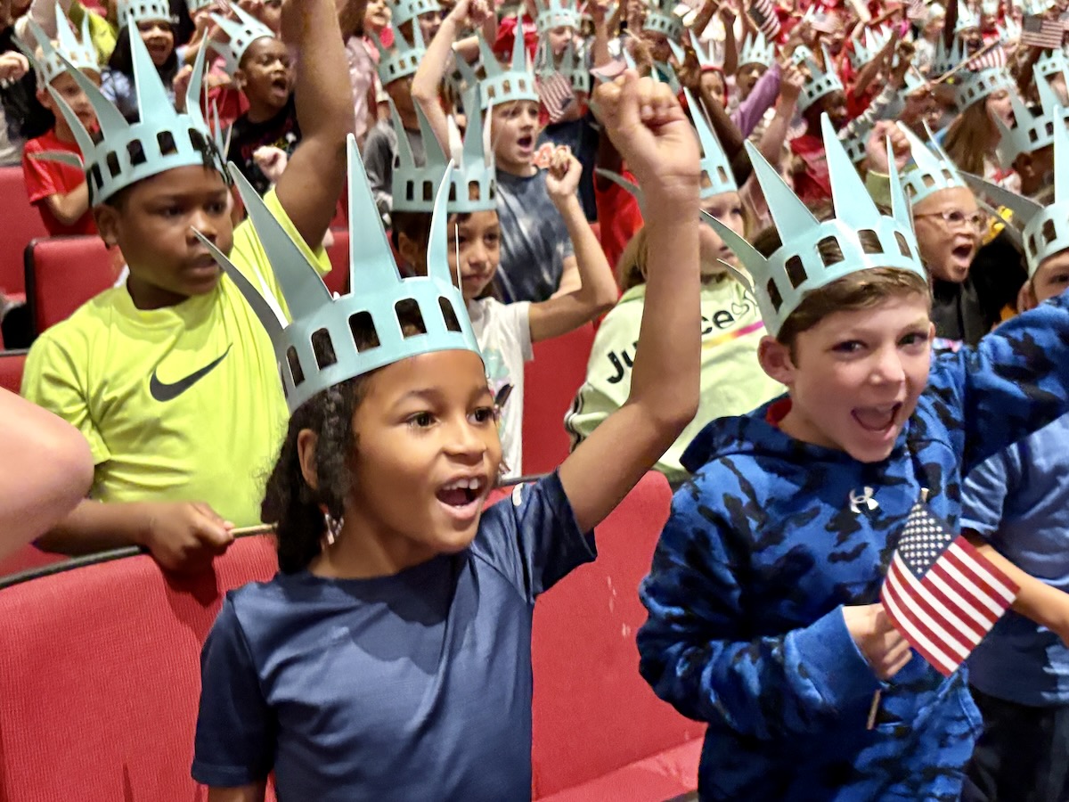 Today second graders from Creek View and Meadow View Elementary Schools cheered and counted down to the grand entrance of Libby Liberty™. Wearing green paper crowns and waving tiny American flags, they showed their enthusiasm for the Super Citizen Program they’ll begin after today’s theatrical performance.