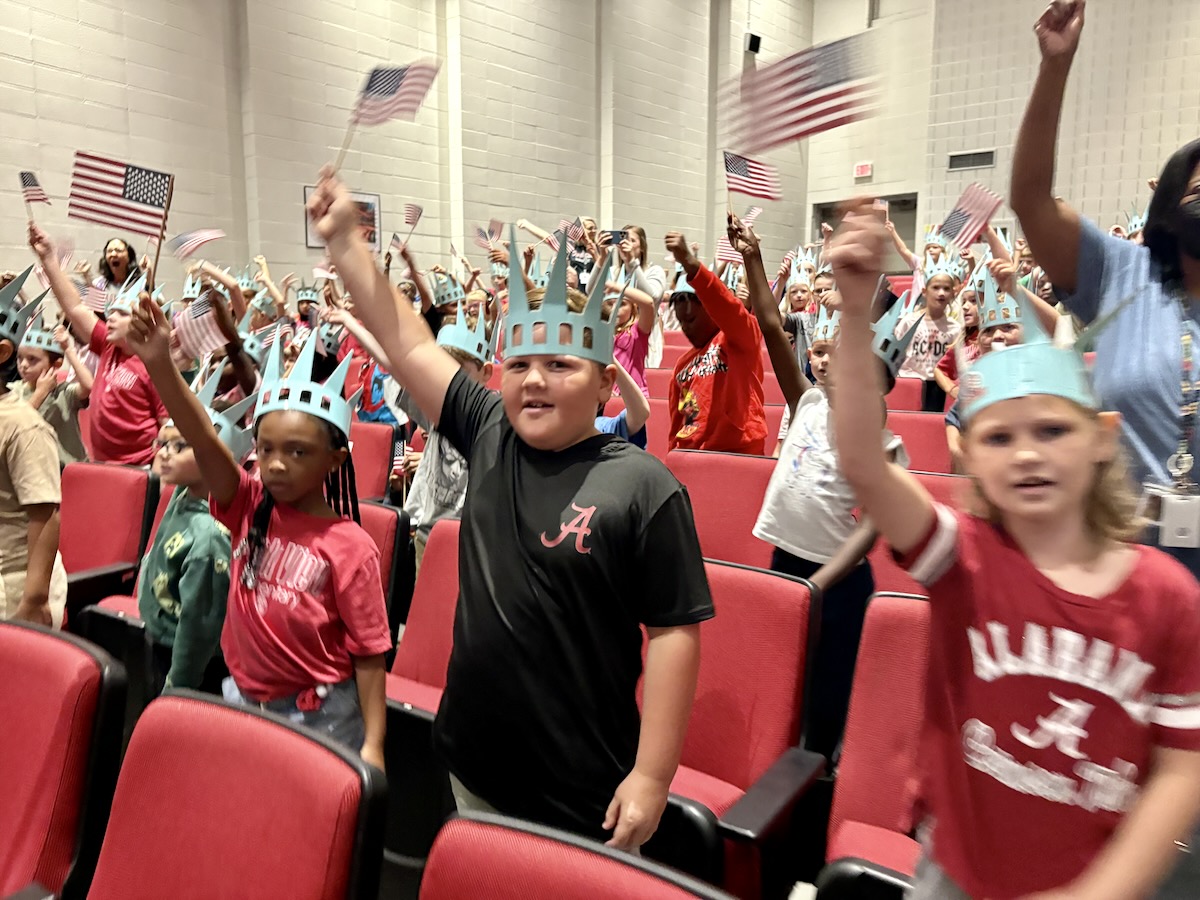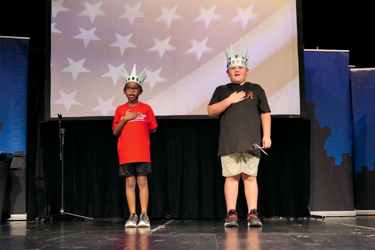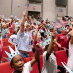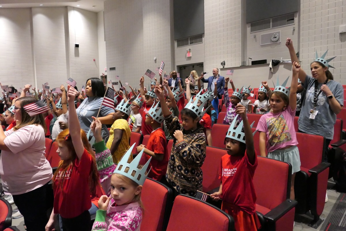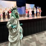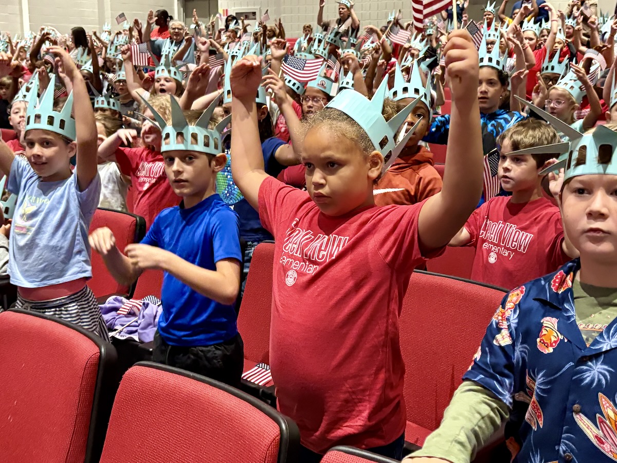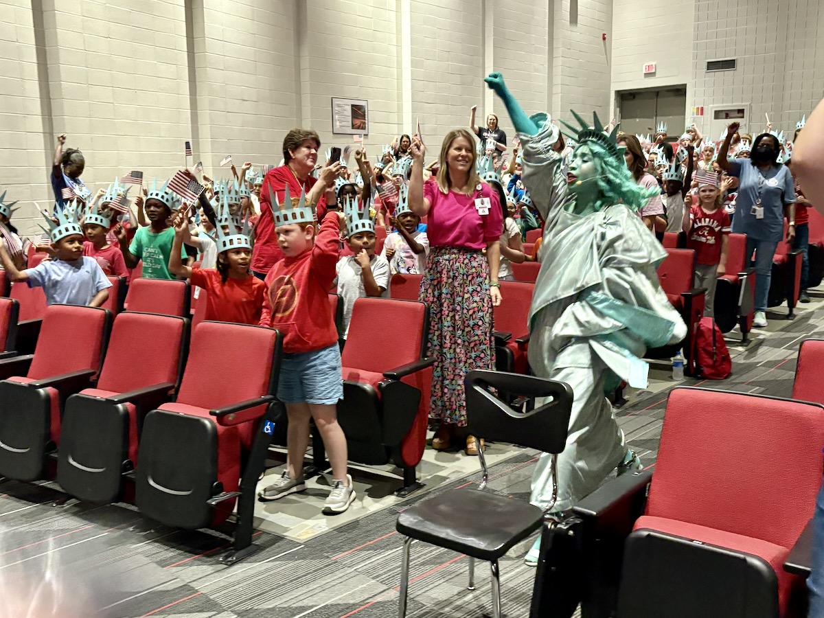Today second graders from Creek View and Meadow View Elementary Schools cheered and counted down to the grand entrance of Libby Liberty™. Wearing green paper crowns and waving tiny American flags, they showed their enthusiasm for the Super Citizen Program they’ll begin after today’s theatrical performance.