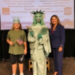Today elementary students from Southside Elementary, Whitesboro Elementary, John J Jones Elementary, Glencoe Elementary, & Glencoe Middle Schools came together to kick off the Super Citizen Program for 2025. They waved flags, wore Statue of Liberty crowns and counted down for Libby Liberty™ to take the stage. On three huge screens “live video” shows her Next Great Americans tour pulling up to the school and then the real-life Libby walked out from behind the screens!