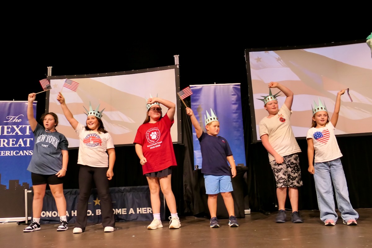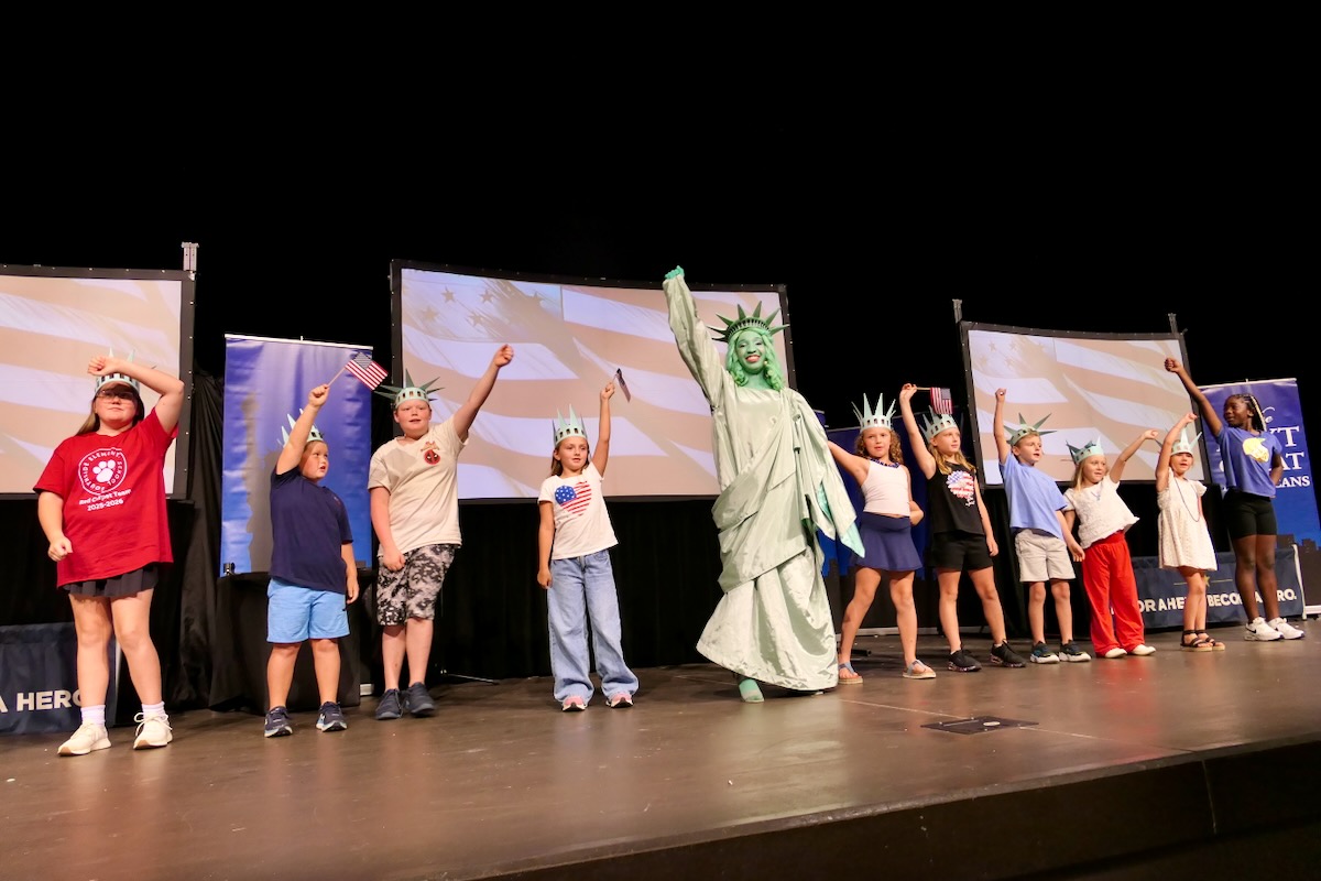 Today elementary students from Southside Elementary, Whitesboro Elementary, John J Jones Elementary, Glencoe Elementary, & Glencoe Middle Schools came together to kick off the Super Citizen Program for 2025. They waved flags, wore Statue of Liberty crowns and counted down for Libby Liberty™ to take the stage. On three huge screens “live video” shows her Next Great Americans tour pulling up to the school and then the real-life Libby walked out from behind the screens!