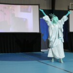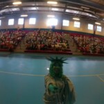 The lady in green brought history to life and introduced students to the 10-week civic, character, financial literacy and social studies program they will begin when her tour rolls away. She told them that they already have the most important title in the world: “CITIZEN.”