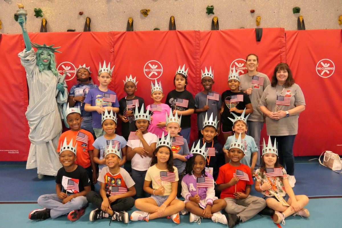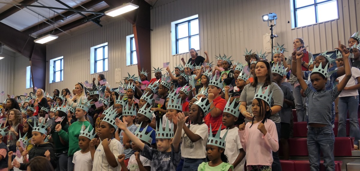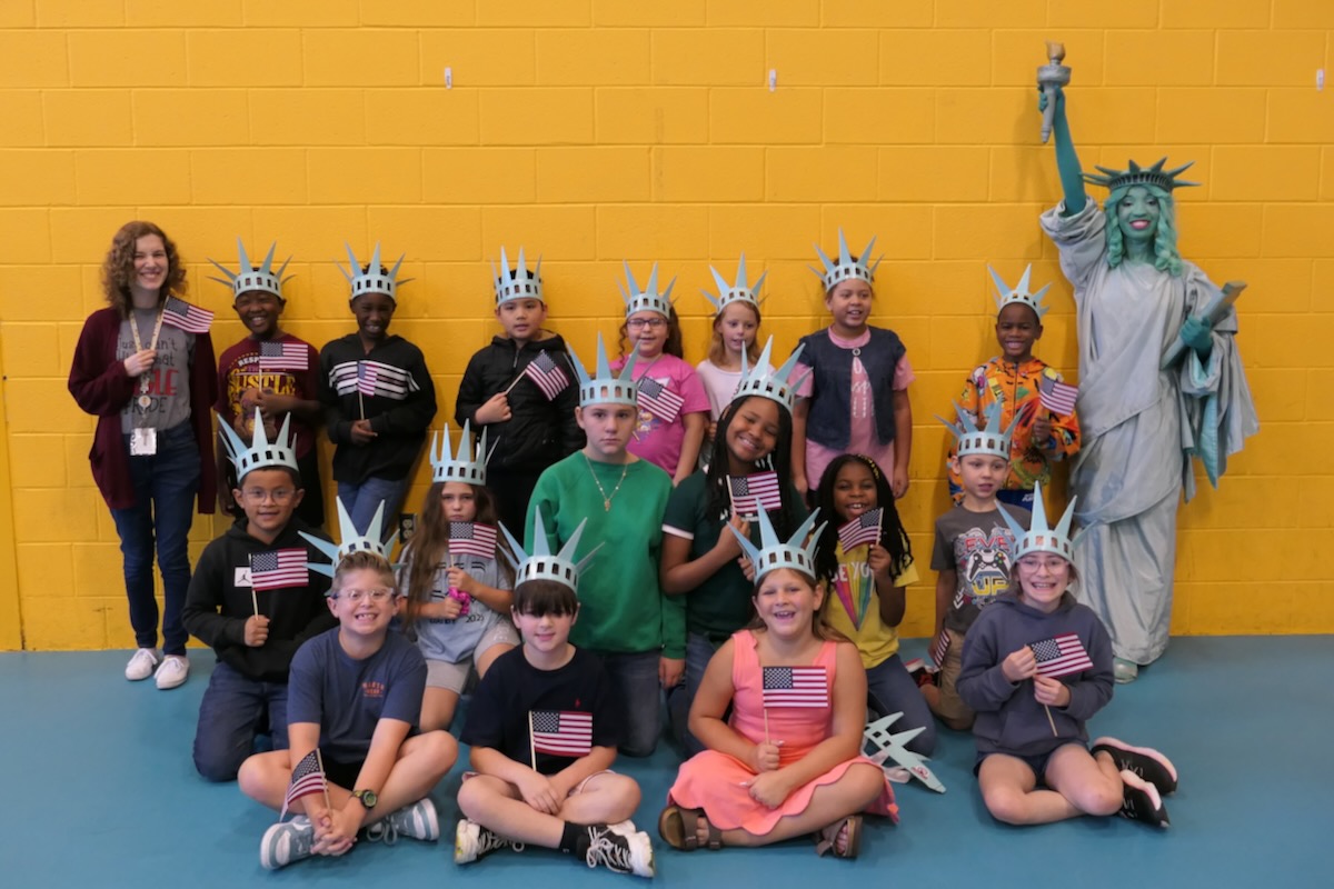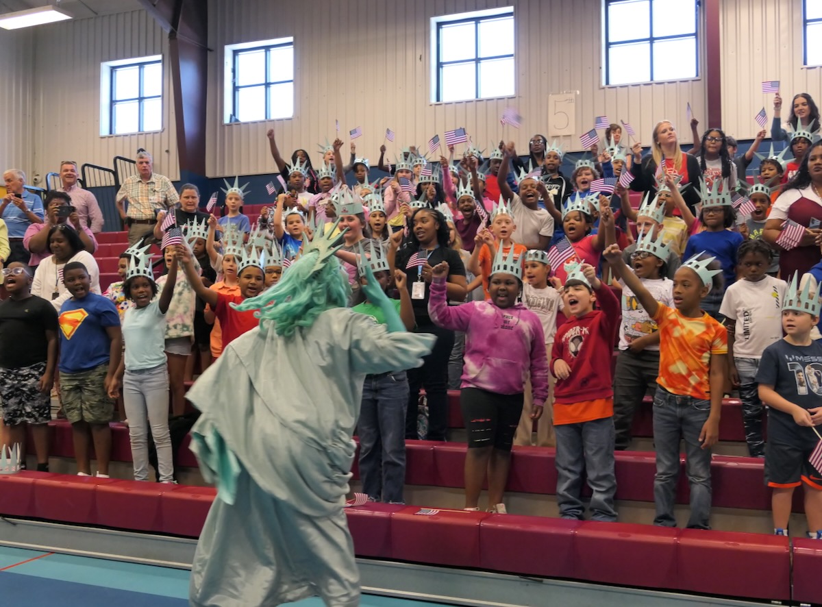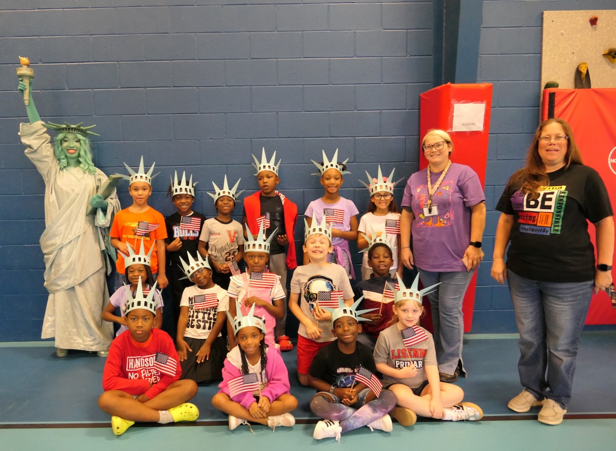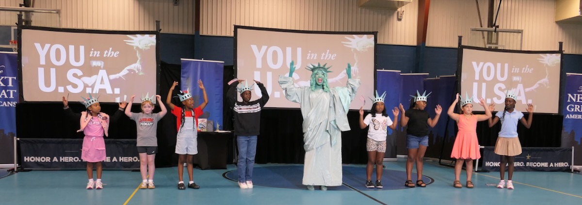 Today second and third grade elementary students from Joseph W Lisenby & Harry N Mixon Elementary Schools came together to kick off the Super Citizen Program for 2025. They waved flags, wore Statue of Liberty crowns and counted down for Libby Liberty™ to take the stage. On three huge screens “live video” shows her Next Great Americans tour pulling up to the school and then the real-life Libby walked out from behind the screens!