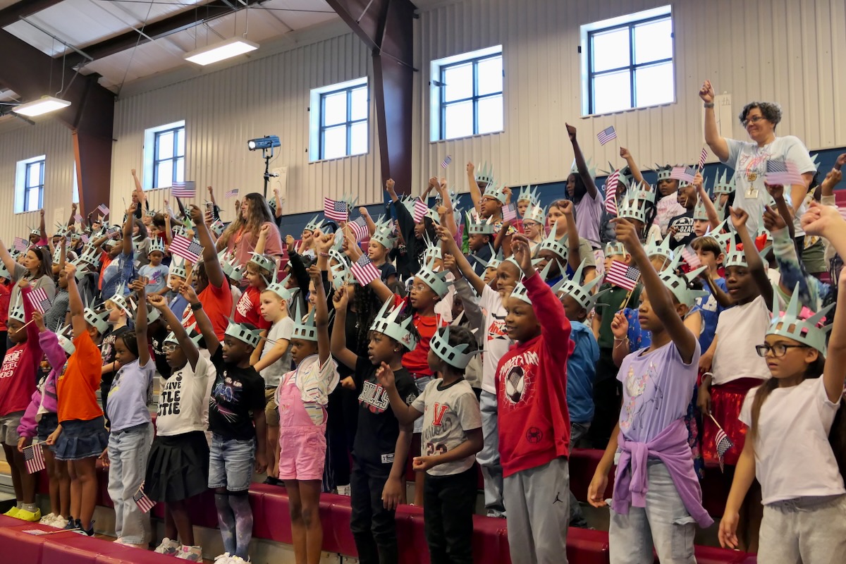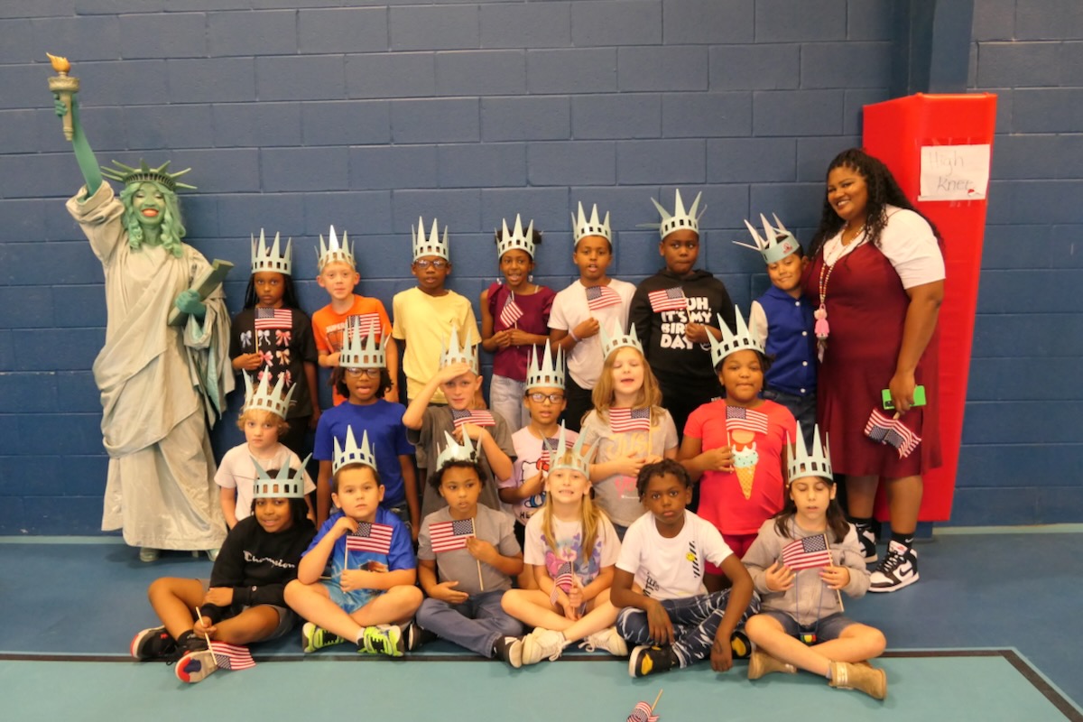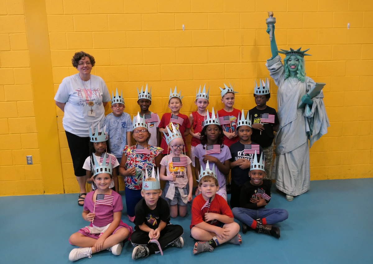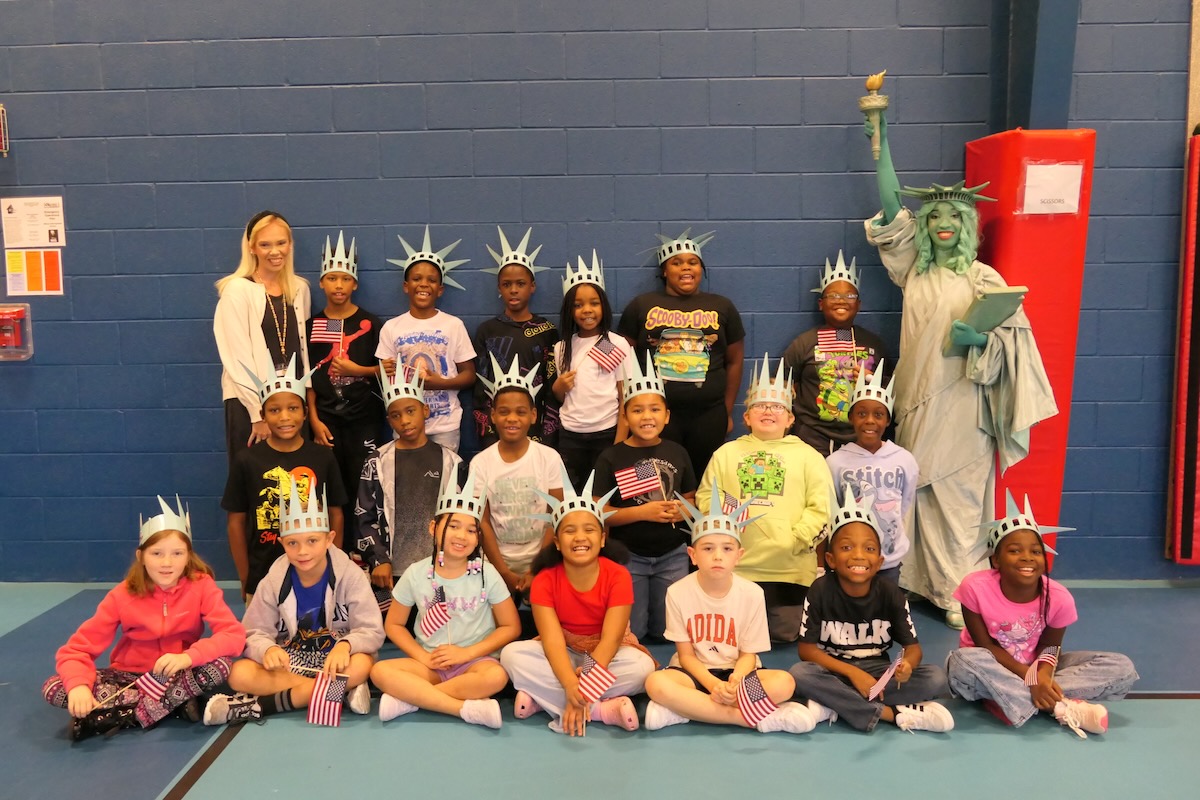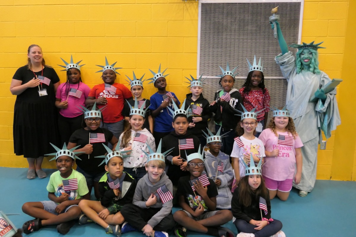 Today second and third grade elementary students from Joseph W Lisenby & Harry N Mixon Elementary Schools came together to kick off the Super Citizen Program for 2025. They waved flags, wore Statue of Liberty crowns and counted down for Libby Liberty™ to take the stage. On three huge screens “live video” shows her Next Great Americans tour pulling up to the school and then the real-life Libby walked out from behind the screens!