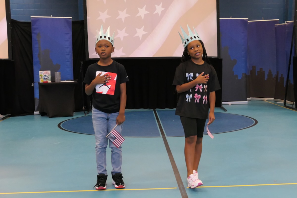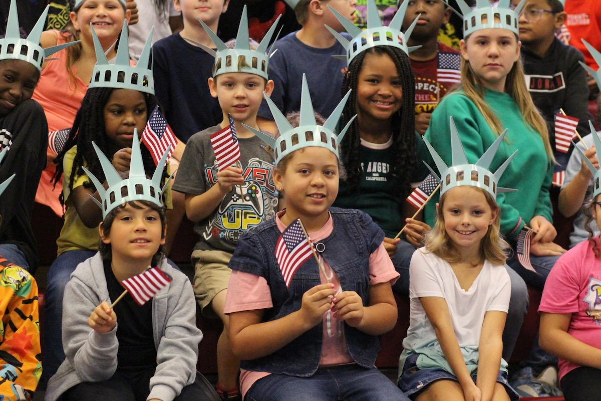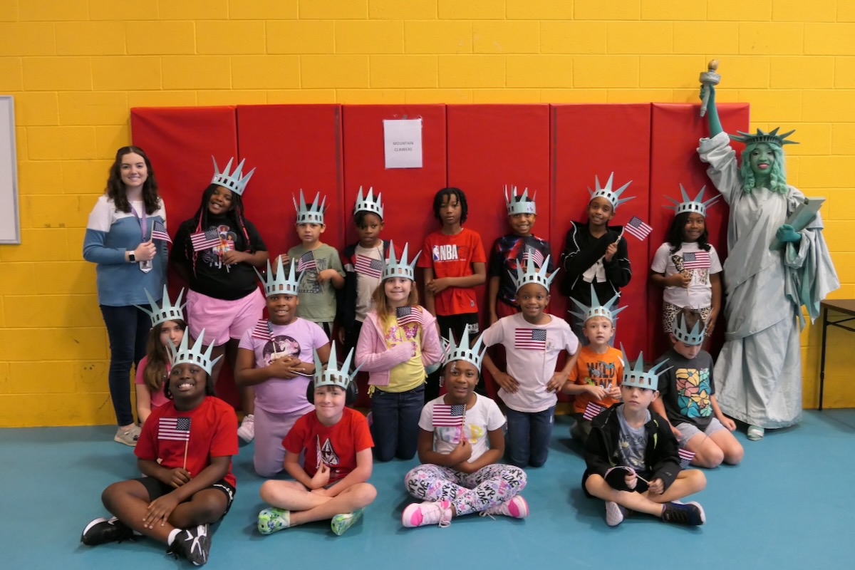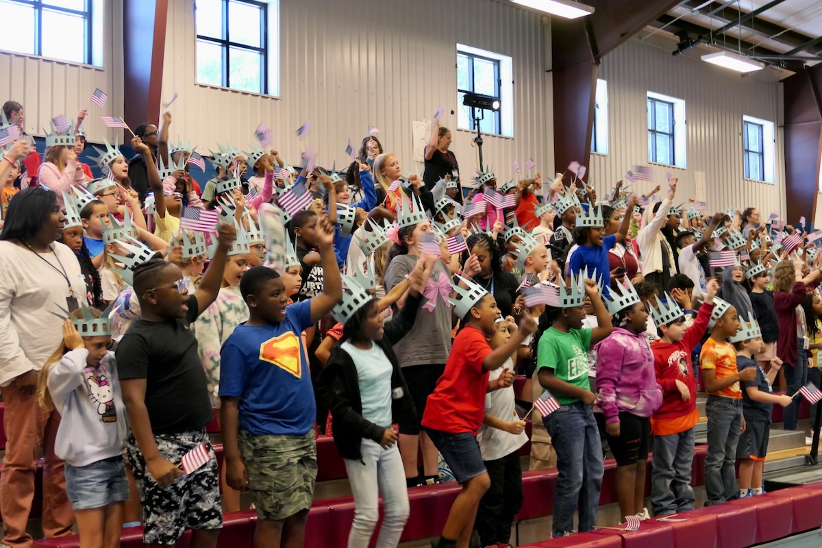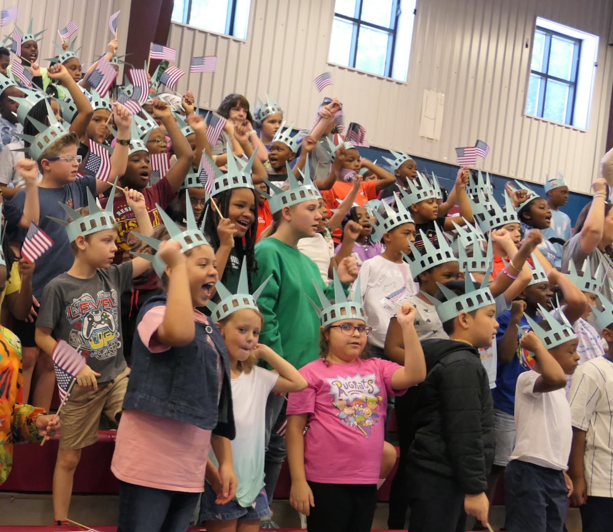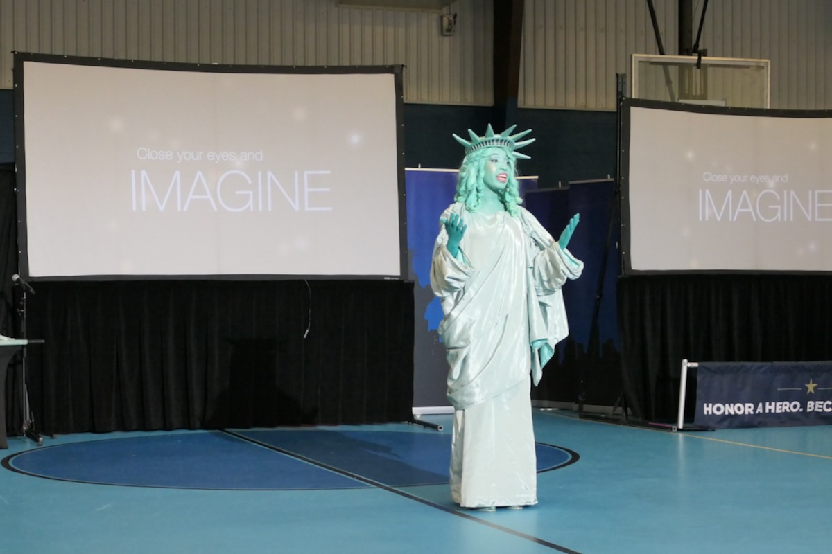 Today second and third grade elementary students from Joseph W Lisenby & Harry N Mixon Elementary Schools came together to kick off the Super Citizen Program for 2025. They waved flags, wore Statue of Liberty crowns and counted down for Libby Liberty™ to take the stage. On three huge screens “live video” shows her Next Great Americans tour pulling up to the school and then the real-life Libby walked out from behind the screens!
