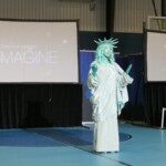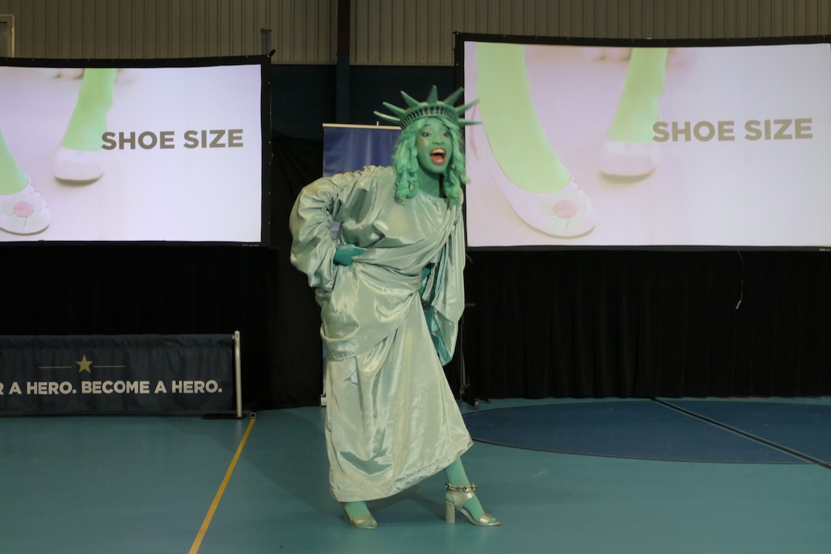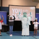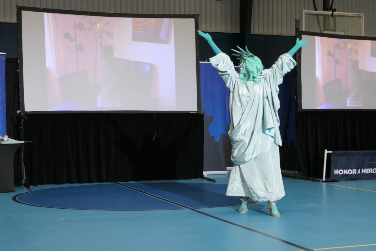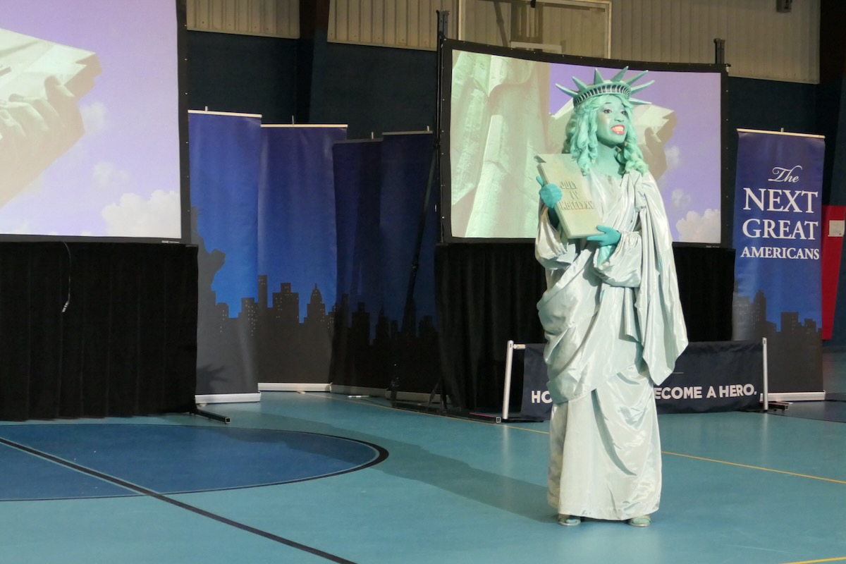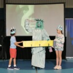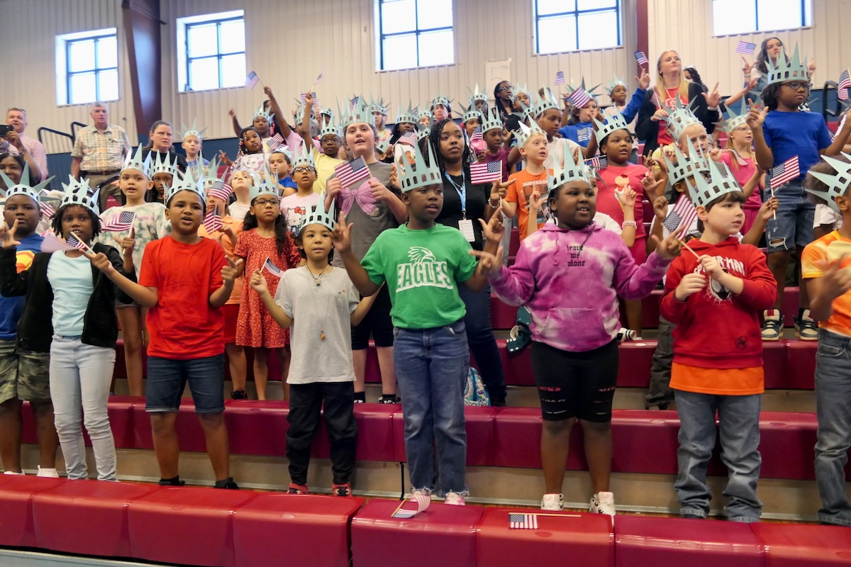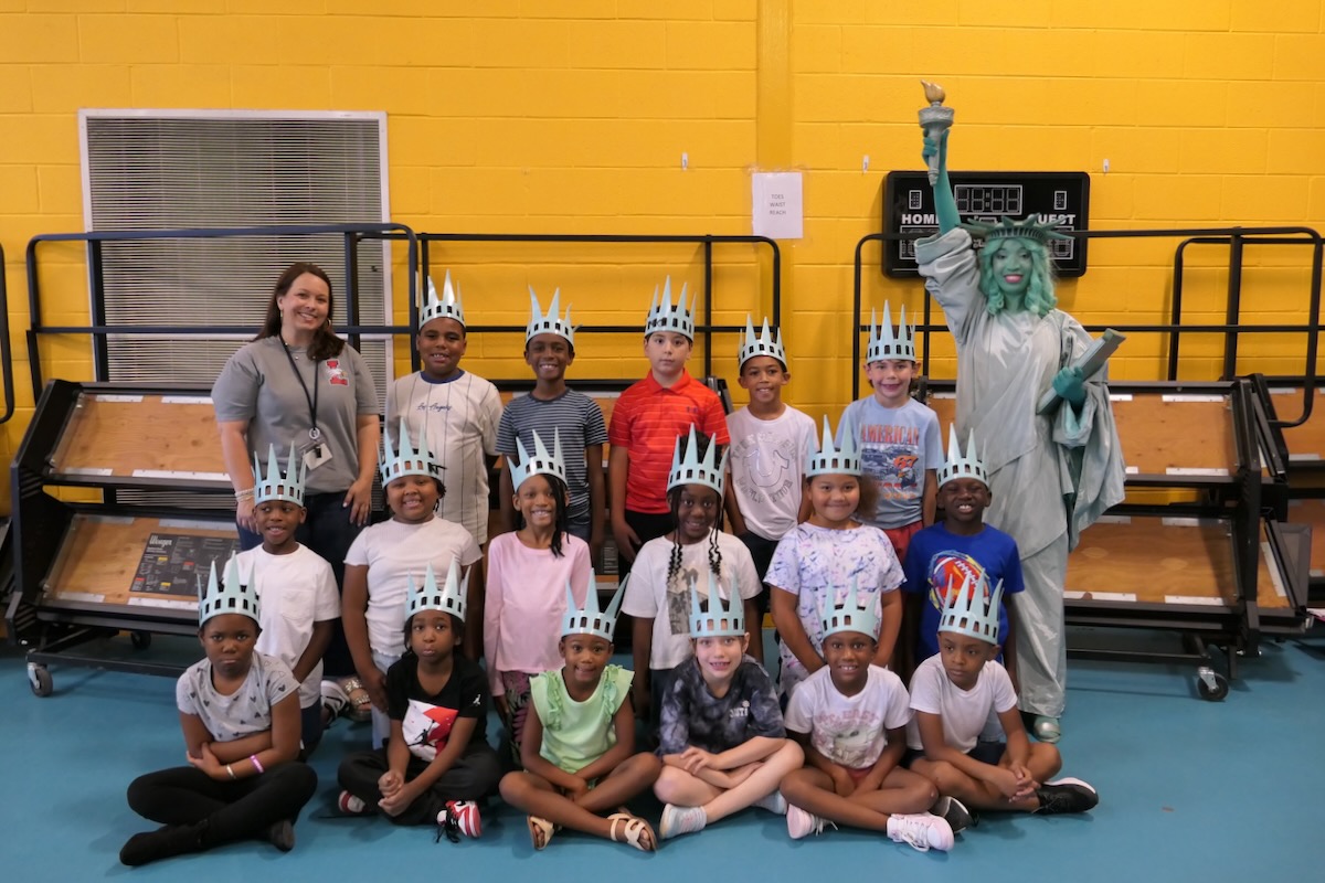 Today second and third grade elementary students from Joseph W Lisenby & Harry N Mixon Elementary Schools came together to kick off the Super Citizen Program for 2025. They waved flags, wore Statue of Liberty crowns and counted down for Libby Liberty™ to take the stage. On three huge screens “live video” shows her Next Great Americans tour pulling up to the school and then the real-life Libby walked out from behind the screens!