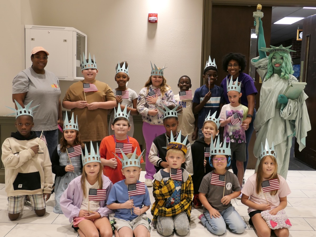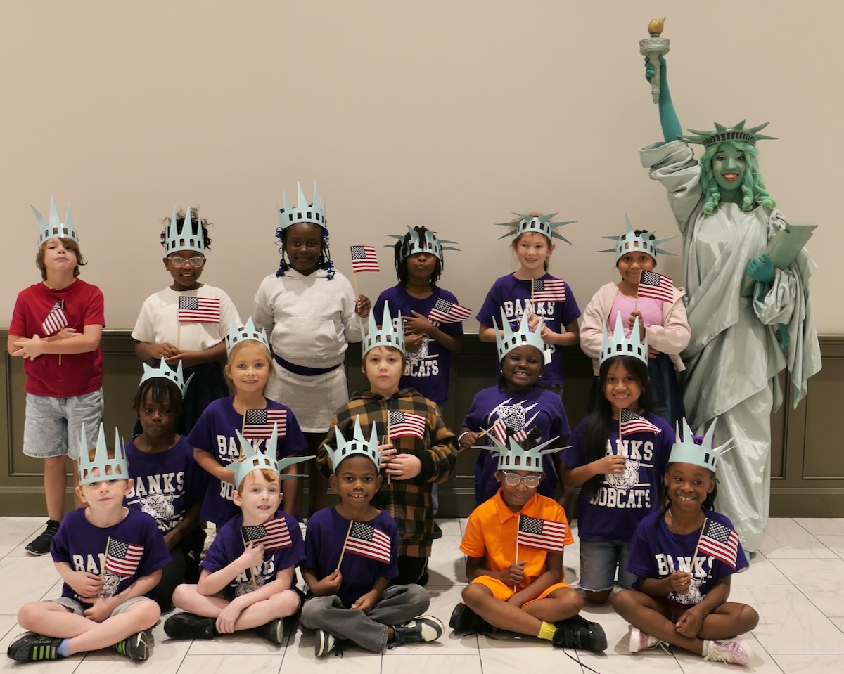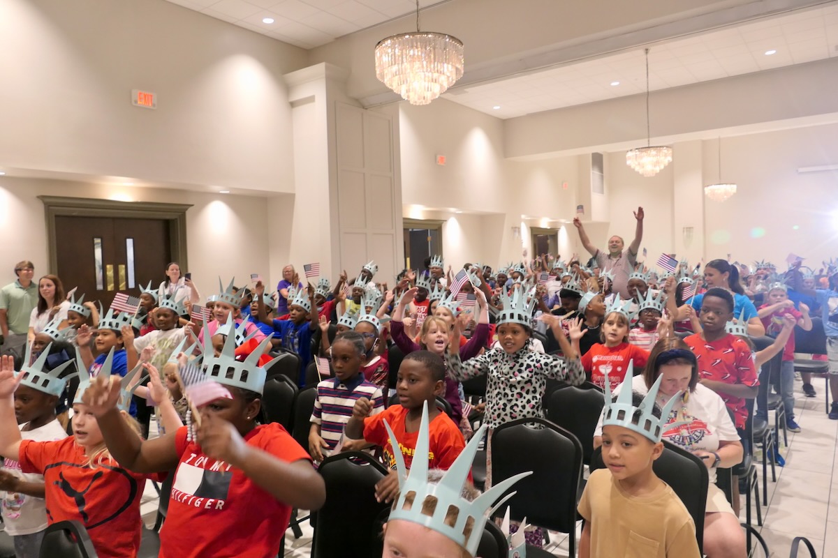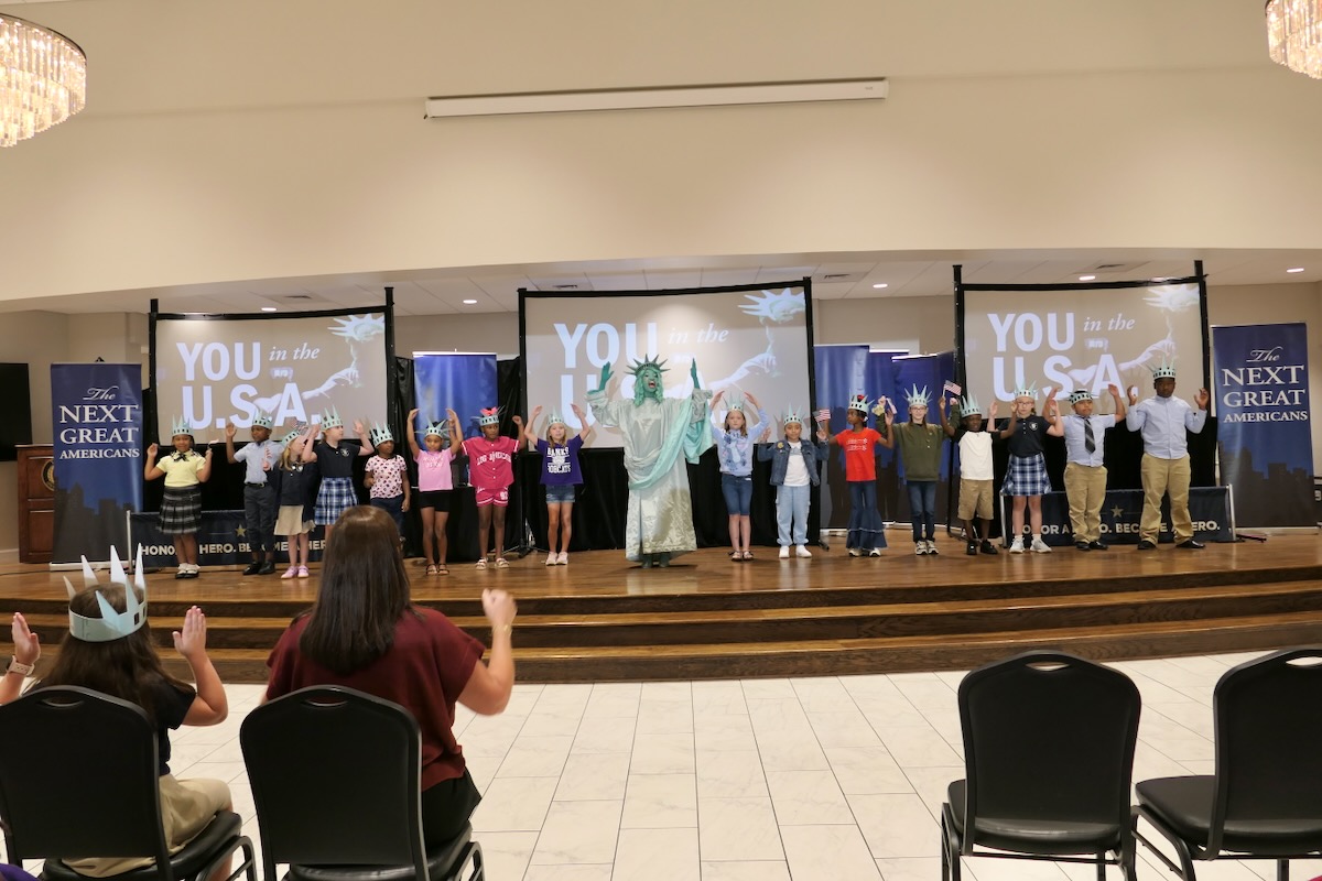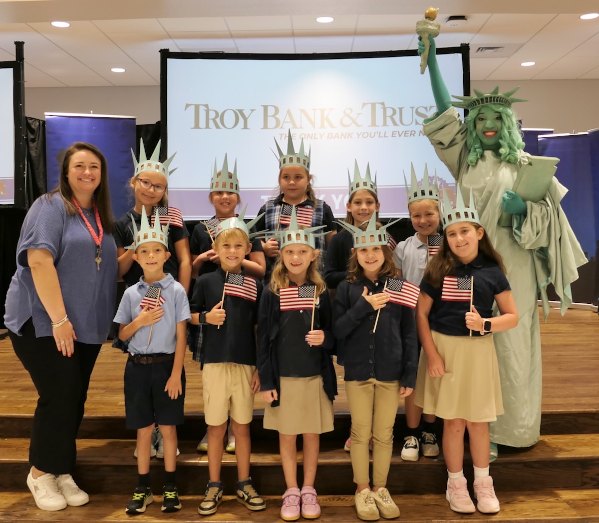 Today elementary students from Pike County Elementary, Banks Elementary, Goshen Elementary, New Life Christian, & Covenant Christian Schools came together to kick off the Super Citizen Program for 2025. They waved flags, wore Statue of Liberty crowns and counted down for Libby Liberty™ to take the stage. On three huge screens “live video” shows her Next Great Americans tour pulling up to the school and then the real-life Libby walked out from behind the screens!
