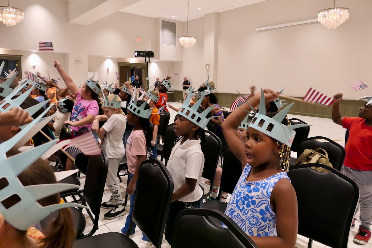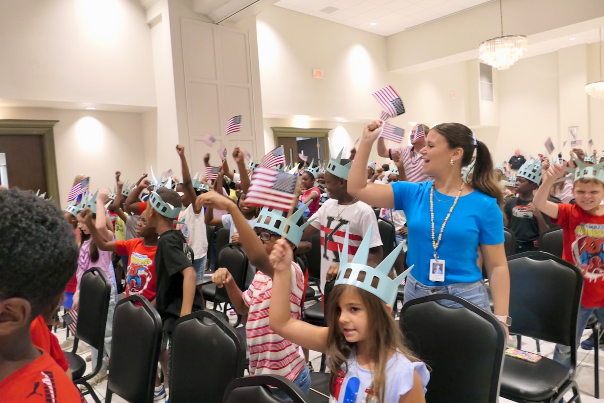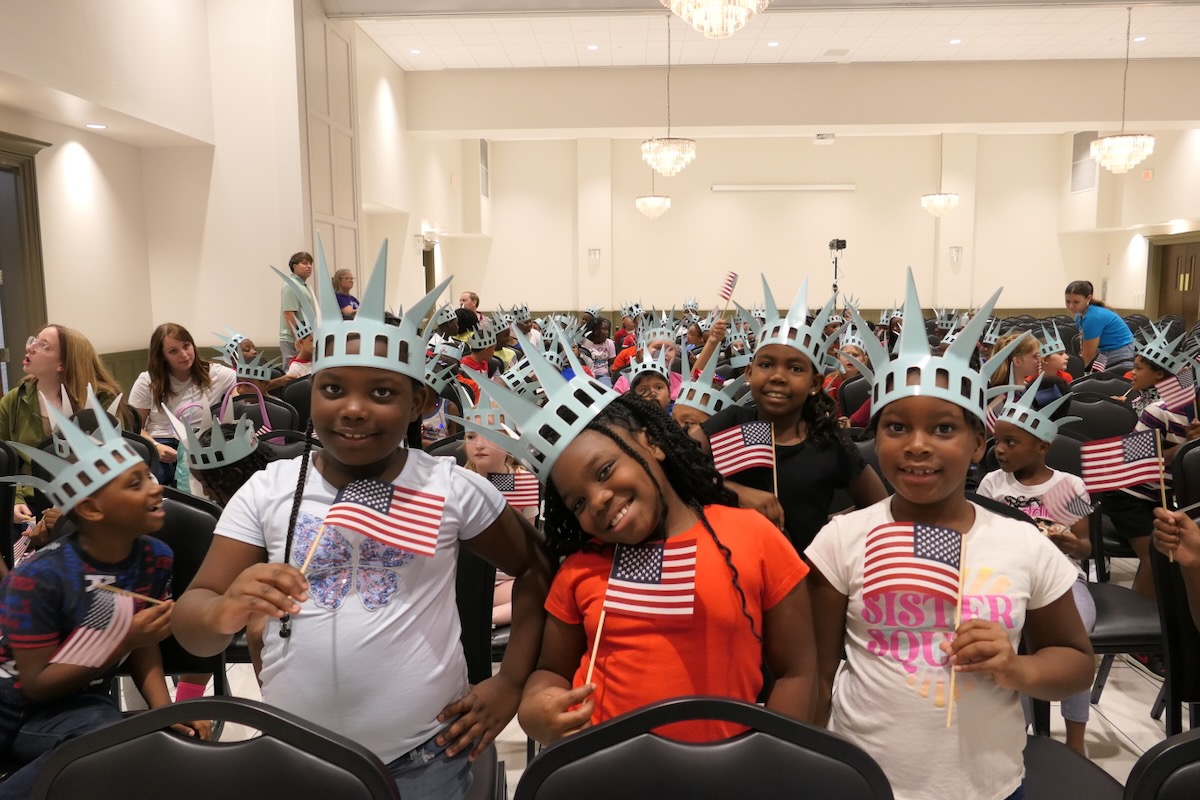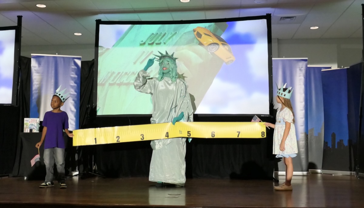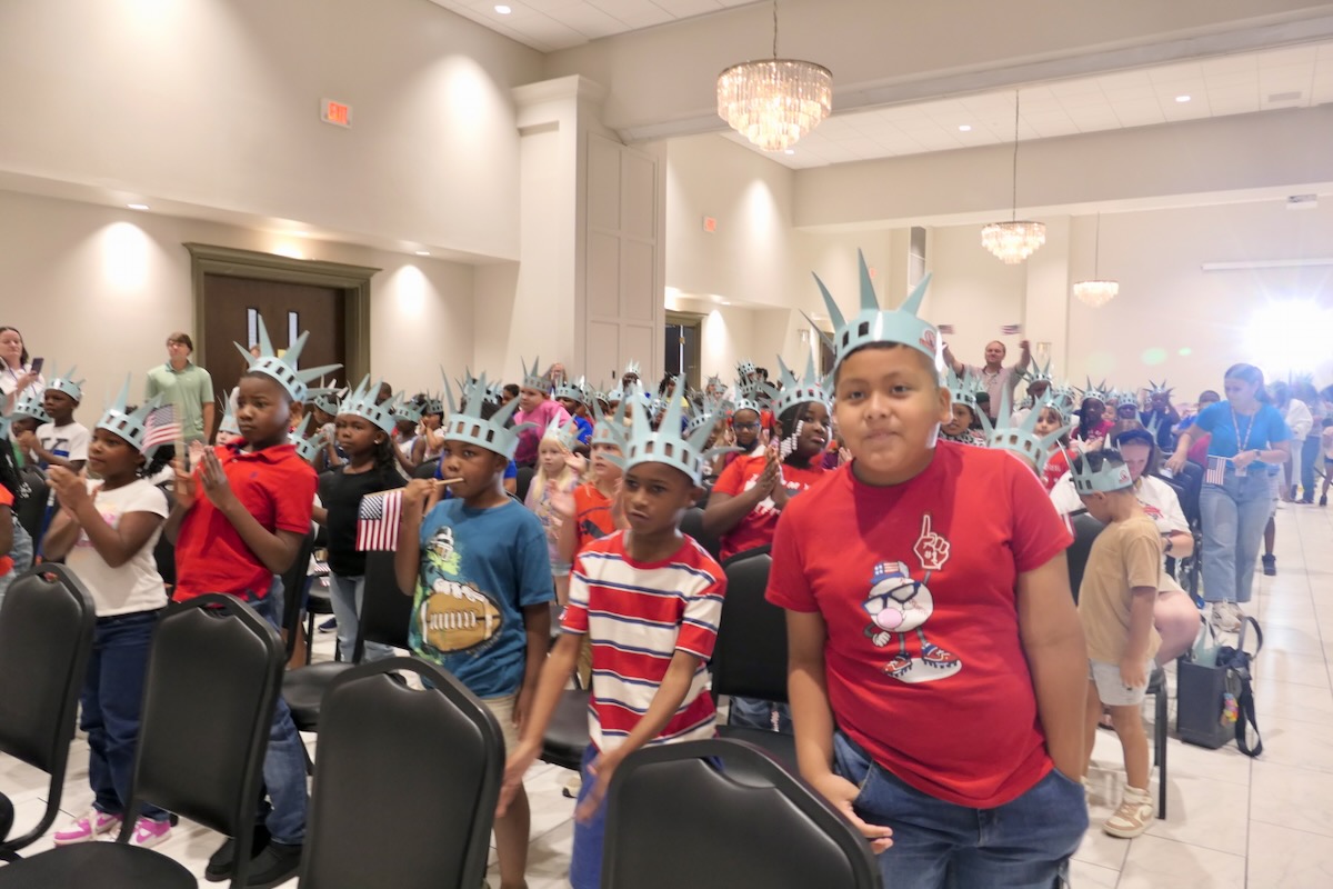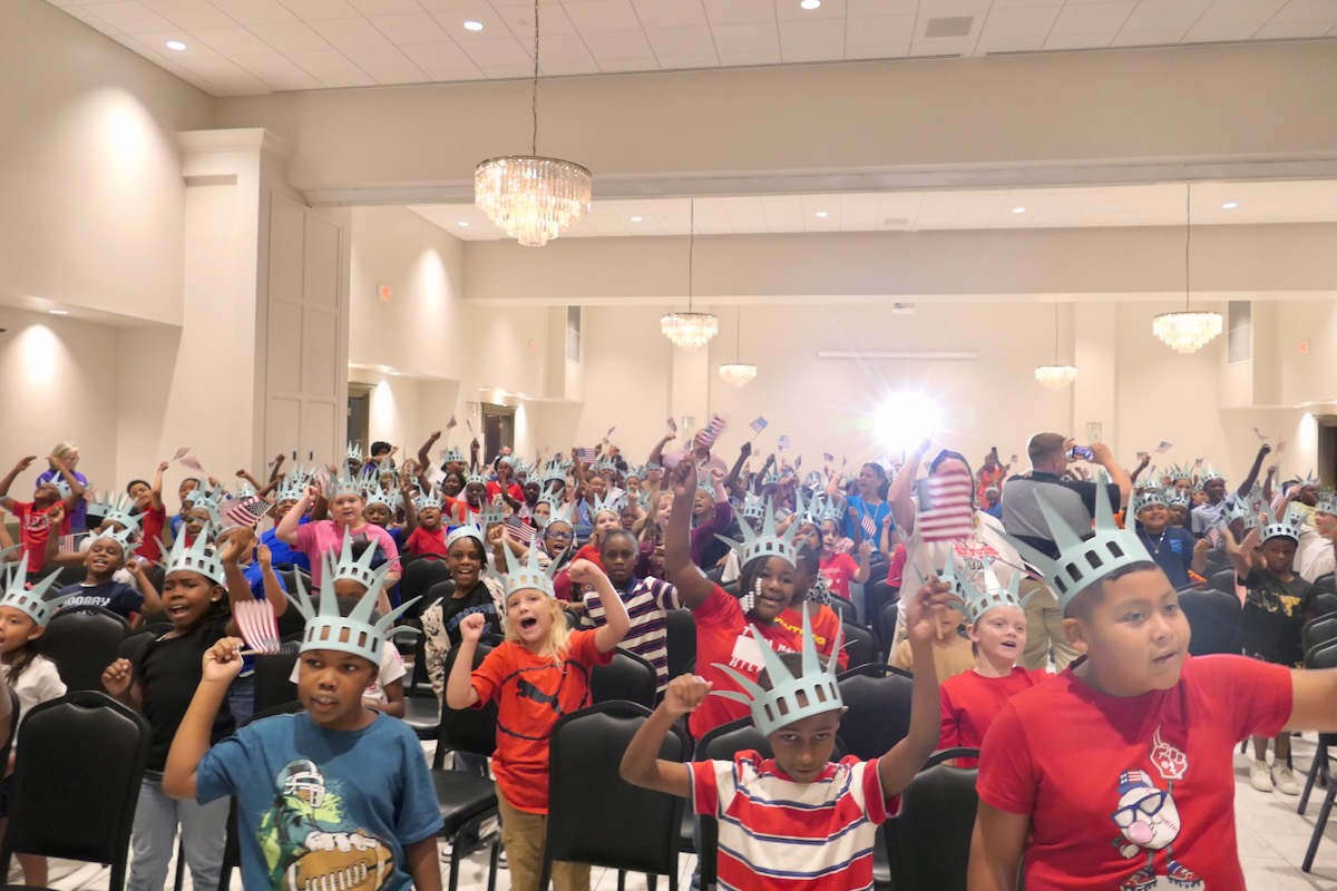 Today elementary students from Pike County Elementary, Banks Elementary, Goshen Elementary, New Life Christian, & Covenant Christian Schools came together to kick off the Super Citizen Program for 2025. They waved flags, wore Statue of Liberty crowns and counted down for Libby Liberty™ to take the stage. On three huge screens “live video” shows her Next Great Americans tour pulling up to the school and then the real-life Libby walked out from behind the screens!