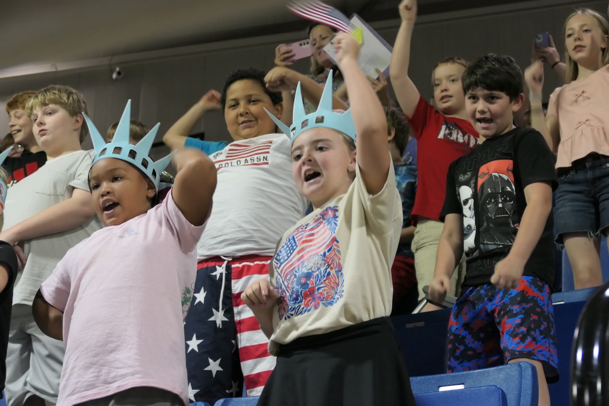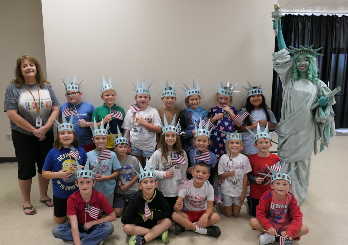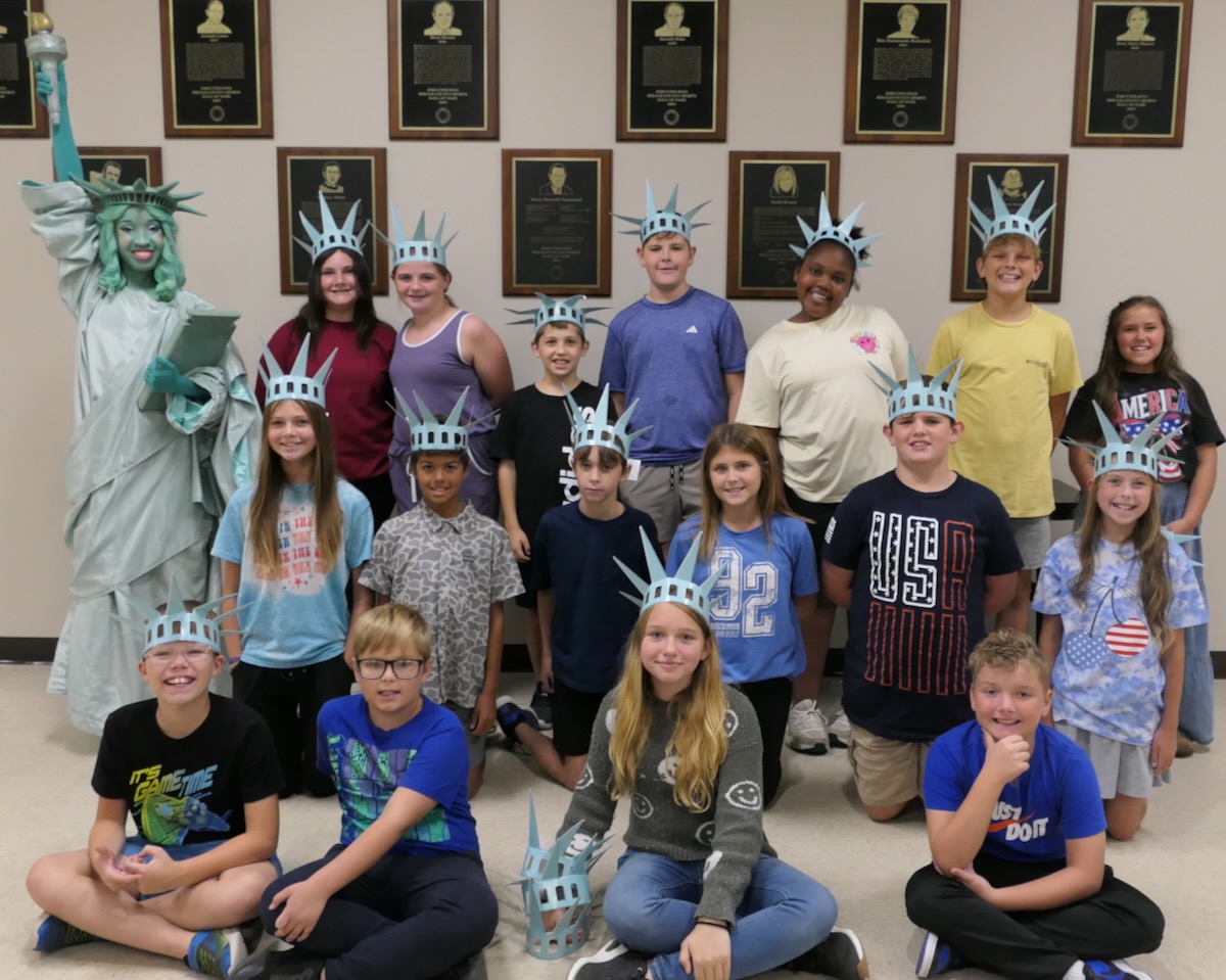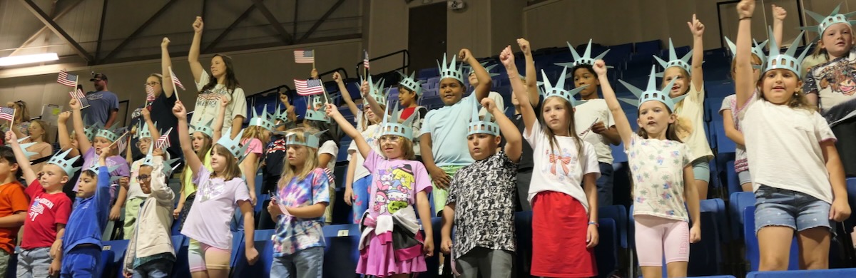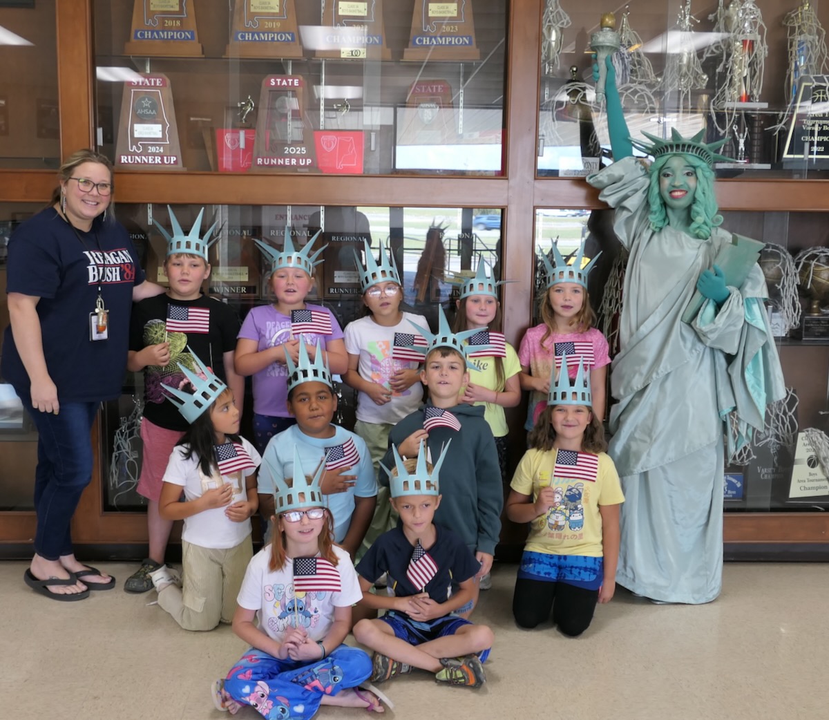 Today elementary students from Geraldine, Henager, Plainview, Sylvania, & Fyffe Elementary Schools came together to kick off the Super Citizen Program for 2025. They waved flags, wore Statue of Liberty crowns and counted down for Libby Liberty™ to take the stage. On three huge screens “live video” shows her Next Great Americans tour pulling up to the school and then the real-life Libby walked out from behind the screens!
