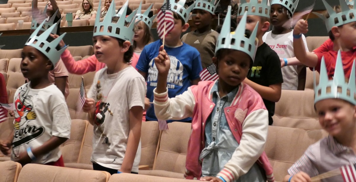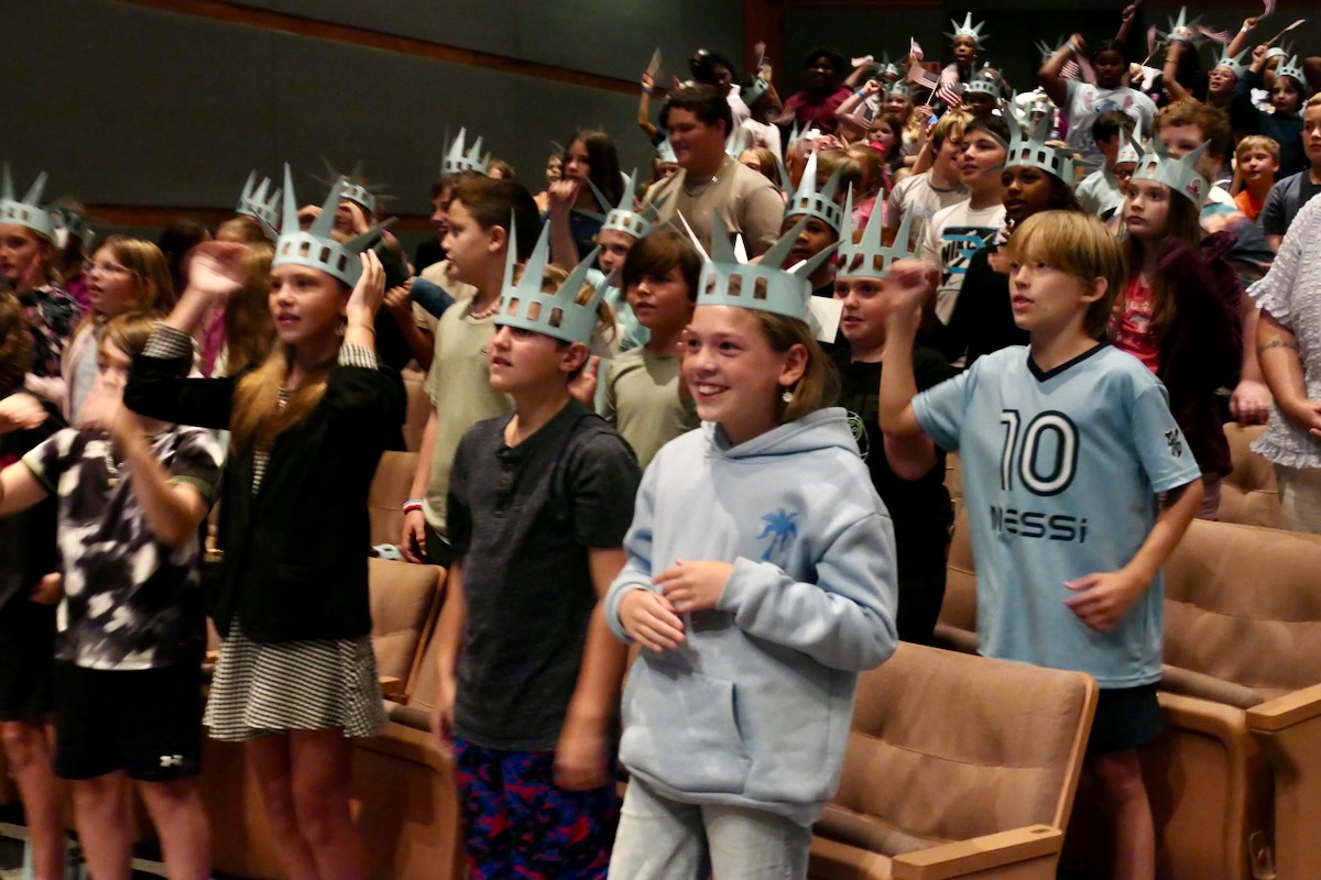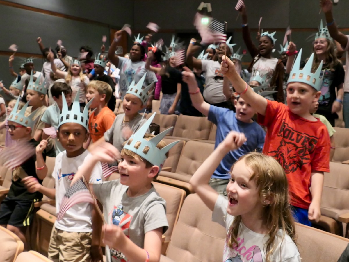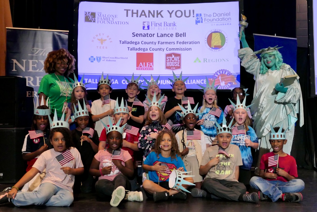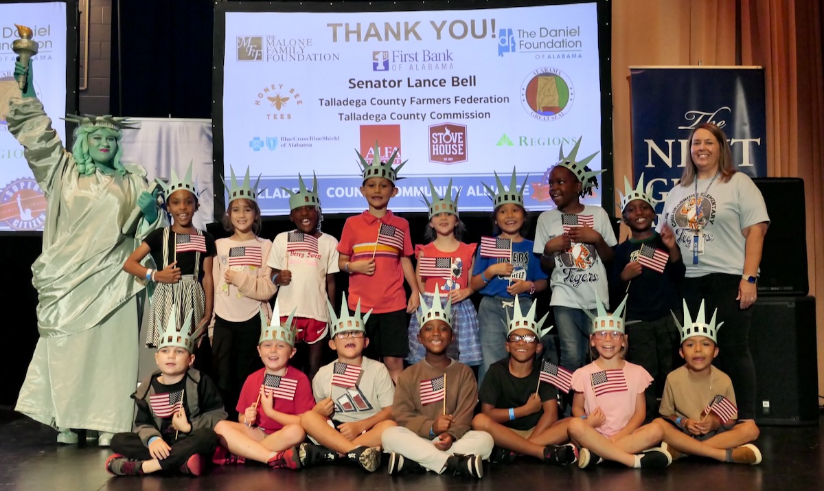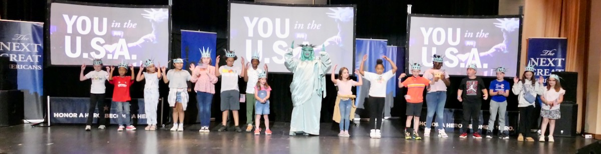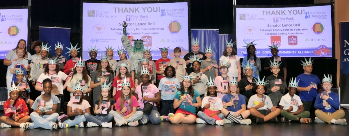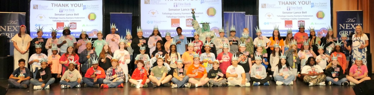 Today 2nd and 5th grade elementary students from Sycamore, Childersburg, Watwood, BB Comer, & Fayetteville Elementary Schools came together to kick off the Super Citizen Program for 2025. They waved flags, wore Statue of Liberty crowns and counted down for Libby Liberty™ to take the stage. On three huge screens “live video” shows her Next Great Americans tour pulling up to the school and then the real-life Libby walked out from behind the screens!