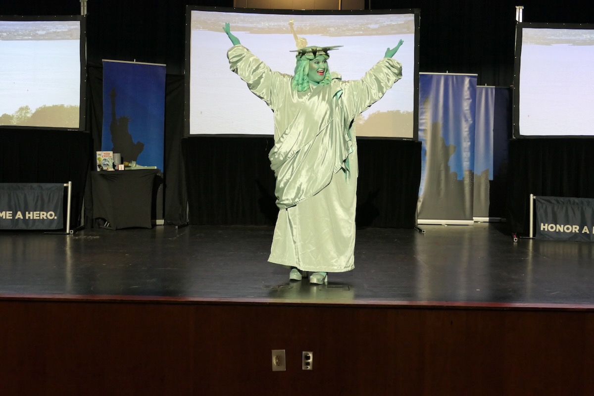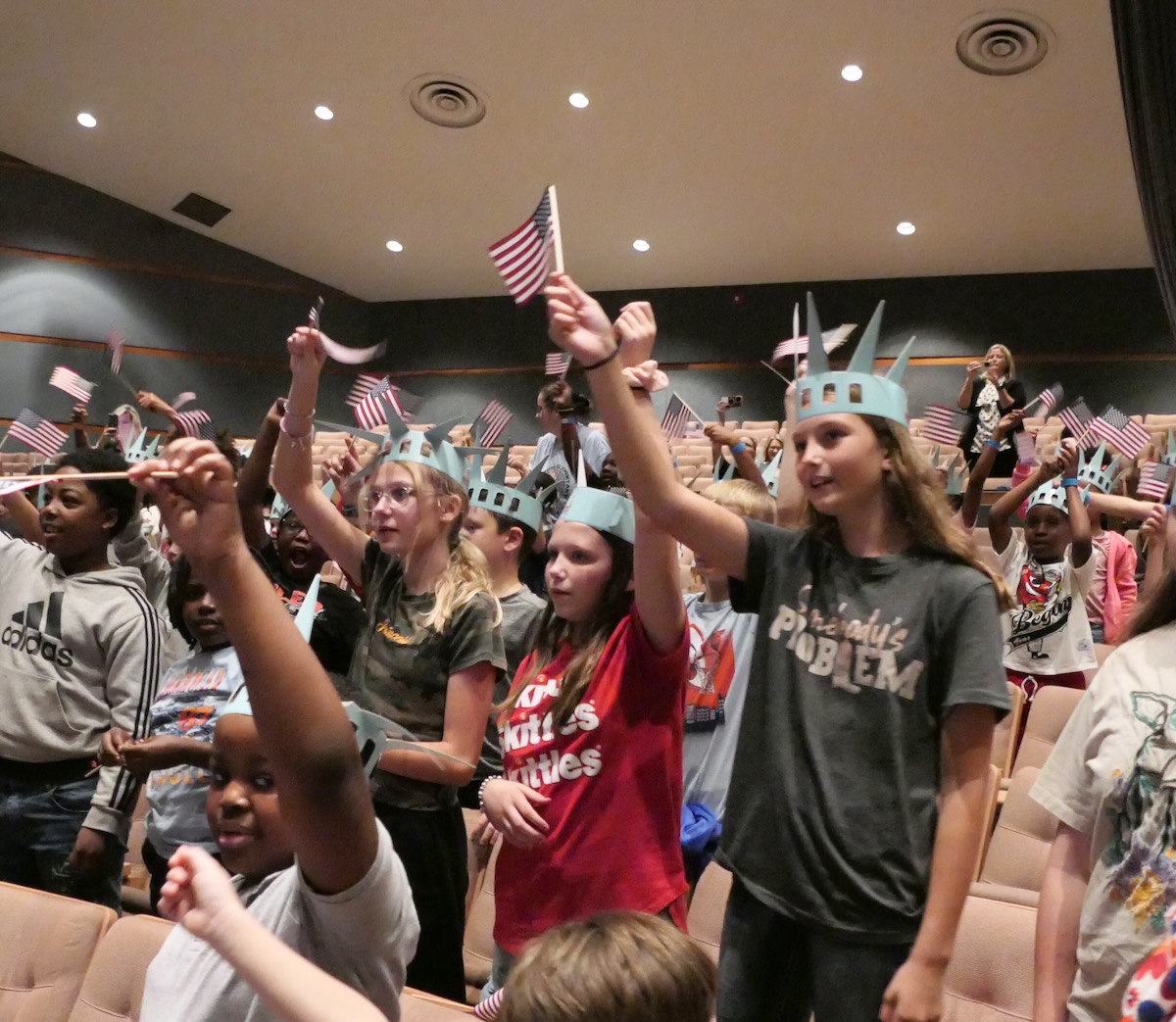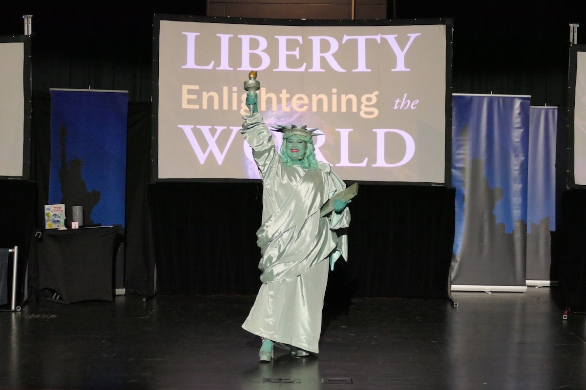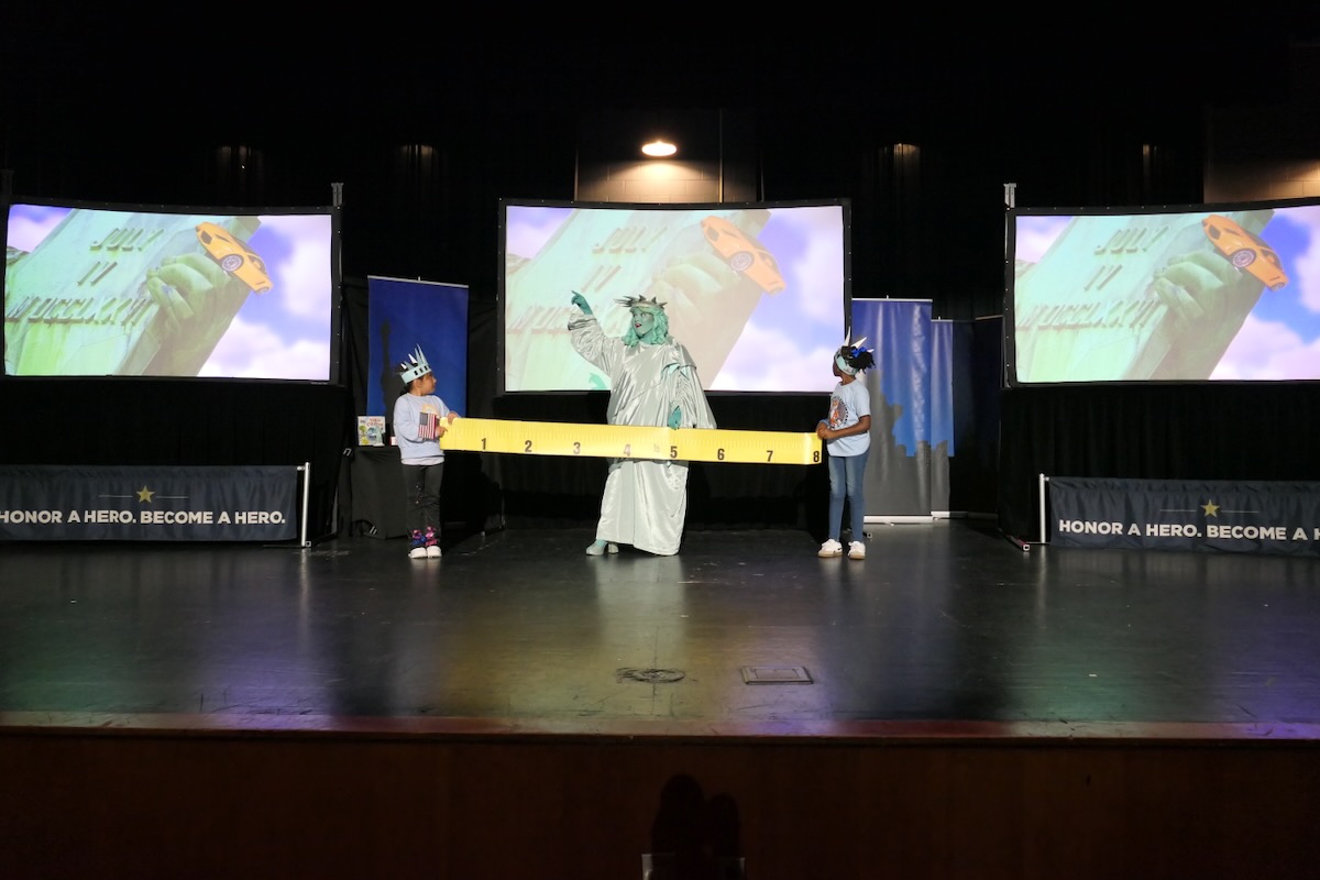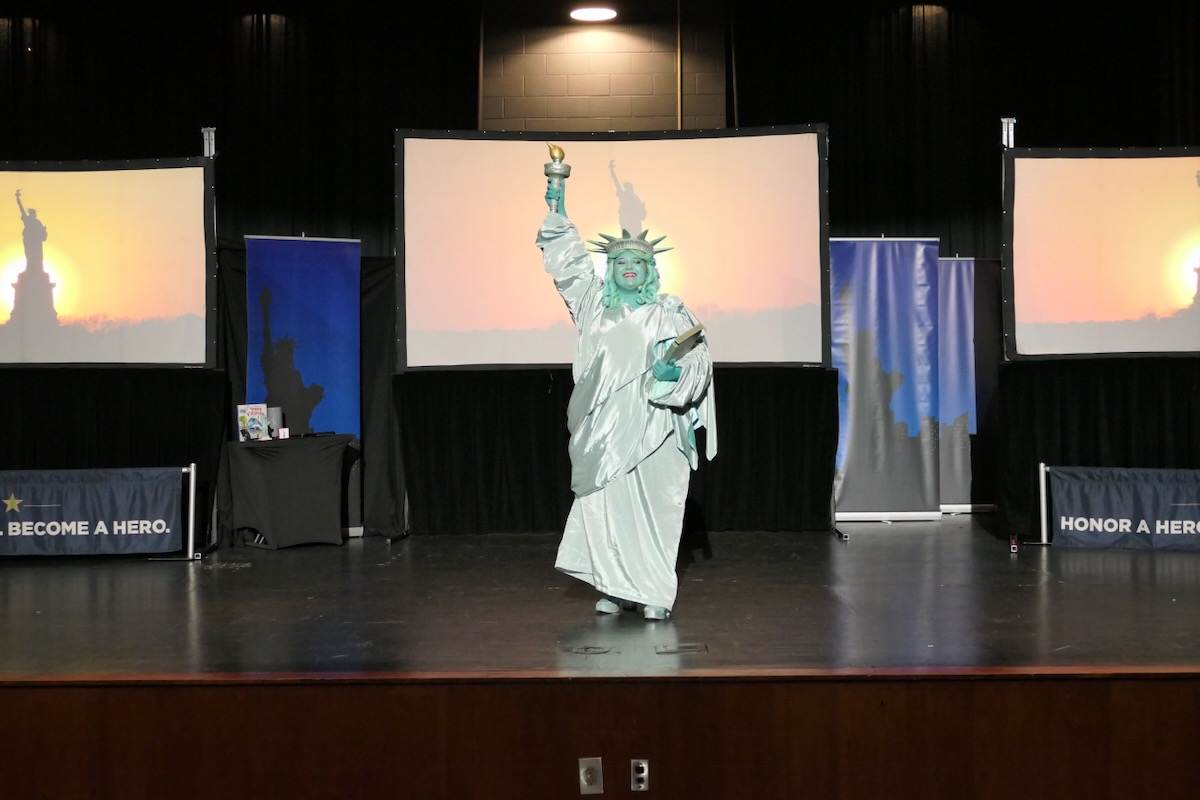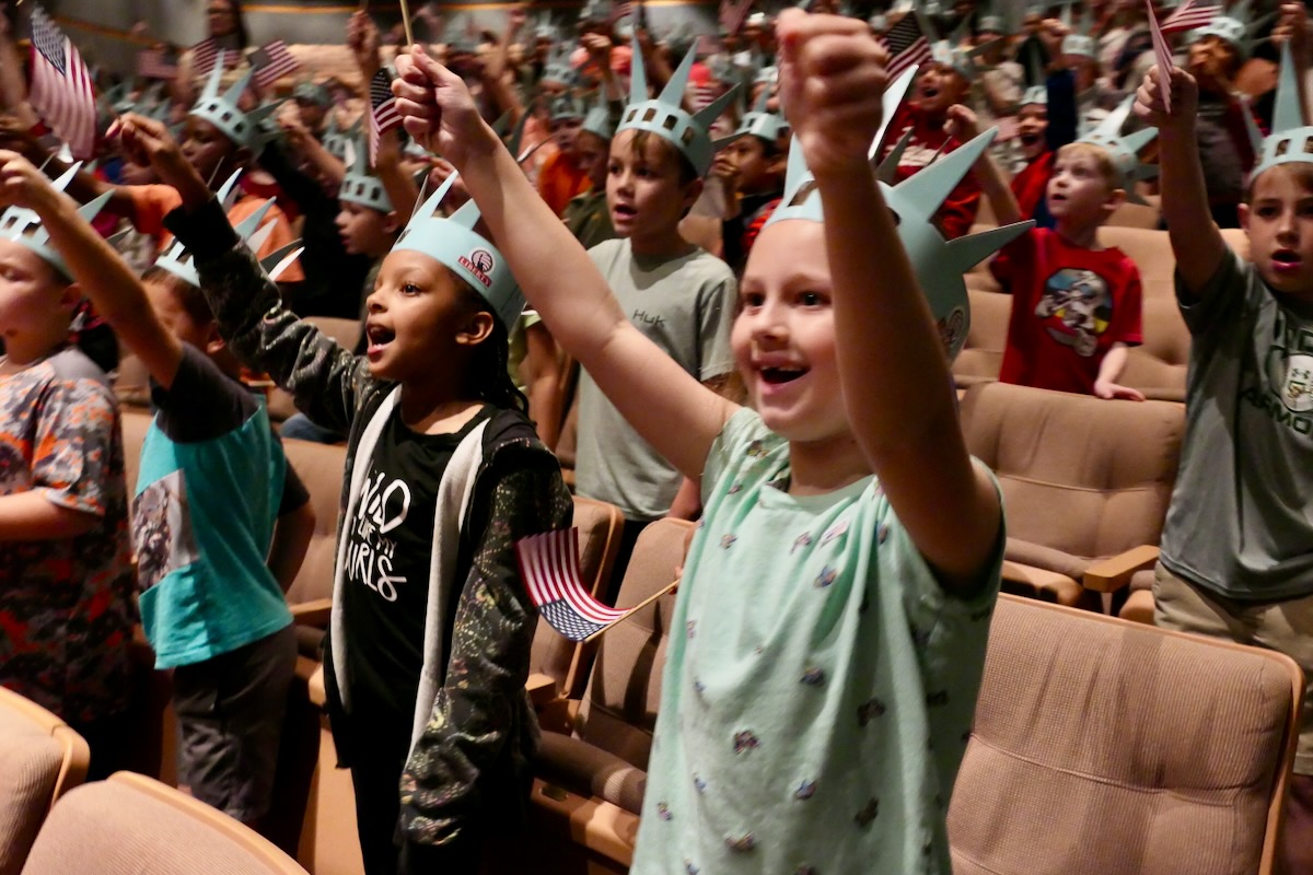 Today 2nd and 5th grade elementary students from Sycamore, Childersburg, Watwood, BB Comer, & Fayetteville Elementary Schools came together to kick off the Super Citizen Program for 2025. They waved flags, wore Statue of Liberty crowns and counted down for Libby Liberty™ to take the stage. On three huge screens “live video” shows her Next Great Americans tour pulling up to the school and then the real-life Libby walked out from behind the screens!