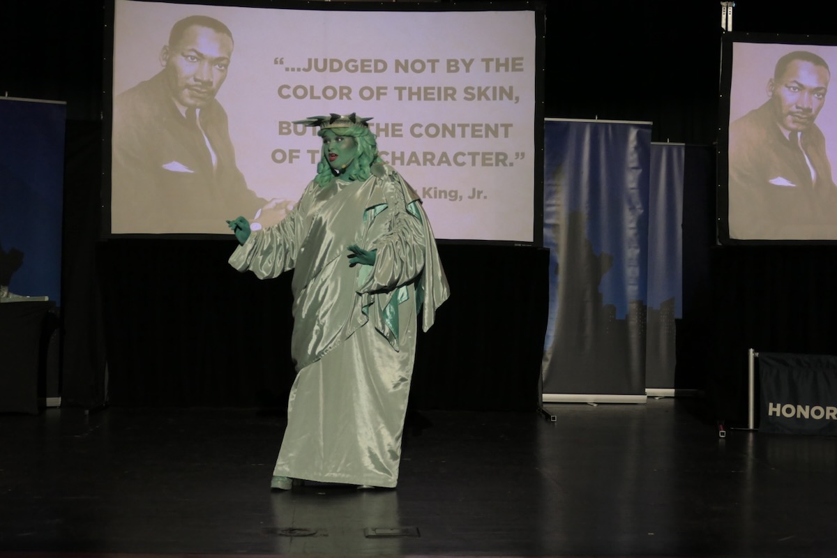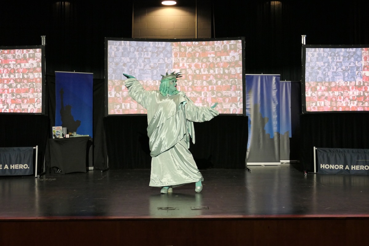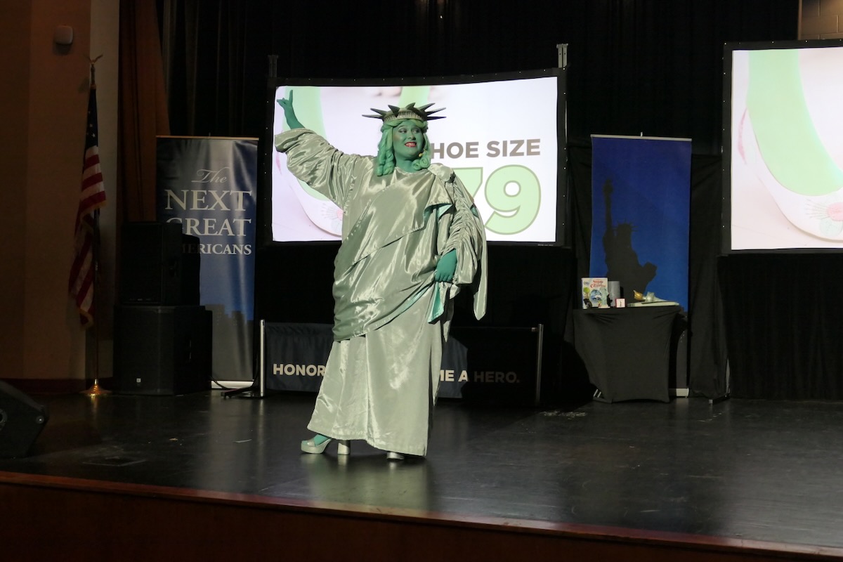 The lady in green brought history to life and introduced students to the 10-week civic, character, financial literacy and social studies program they will begin when her tour rolls away. She told them that they already have the most important title in the world: “CITIZEN.”