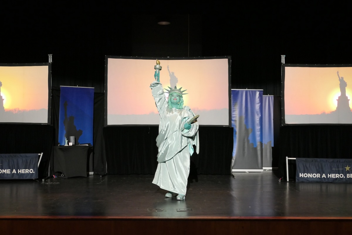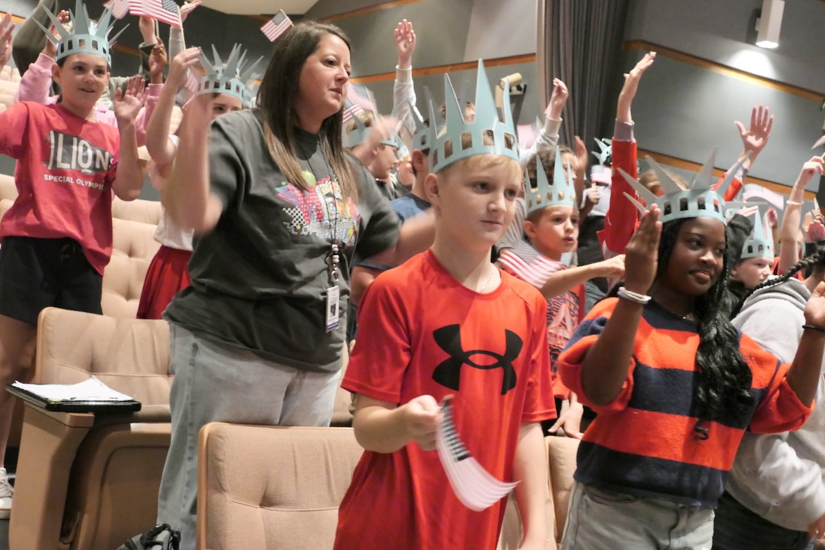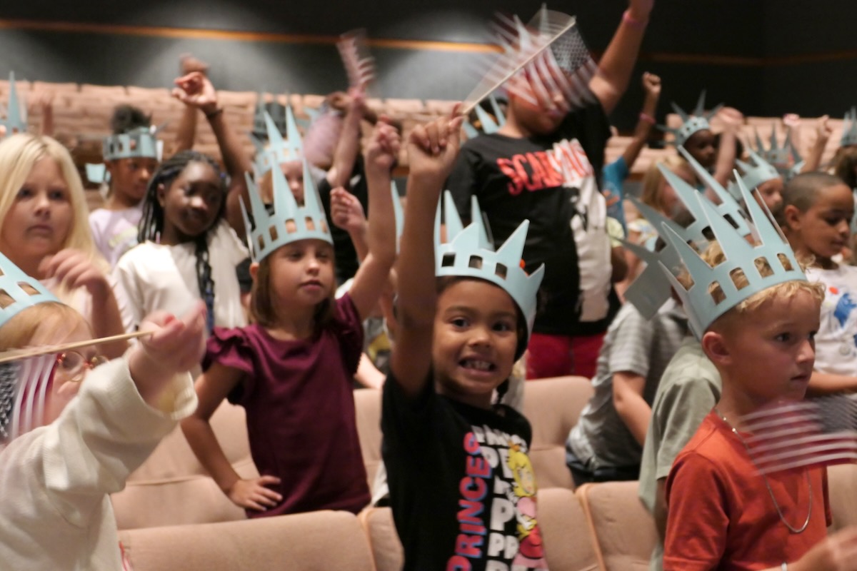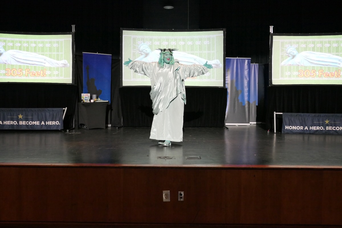 Today elementary students from Lincoln, Munford, & Stemley Road Elementary came together to kick off the Super Citizen Program for 2025. They waved flags, wore Statue of Liberty crowns and counted down for Libby Liberty™ to take the stage. On three huge screens “live video” shows her Next Great Americans tour pulling up to the school and then the real-life Libby walked out from behind the screens!