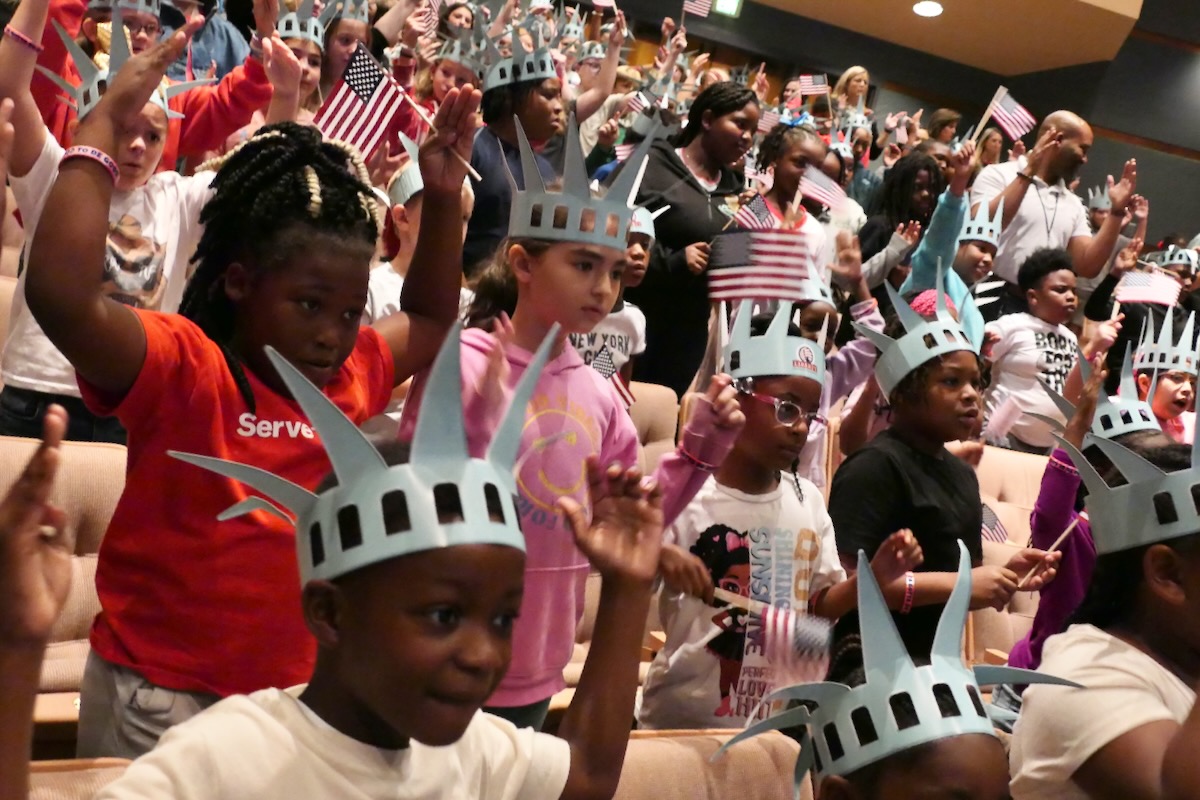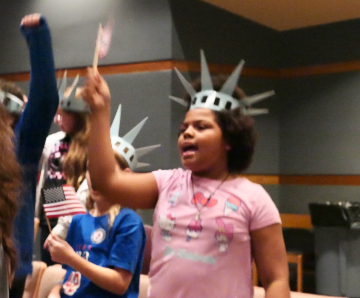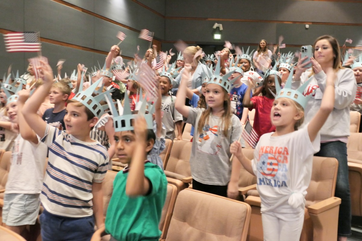 Today elementary students from Lincoln, Munford, & Stemley Road Elementary came together to kick off the Super Citizen Program for 2025. They waved flags, wore Statue of Liberty crowns and counted down for Libby Liberty™ to take the stage. On three huge screens “live video” shows her Next Great Americans tour pulling up to the school and then the real-life Libby walked out from behind the screens!