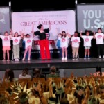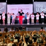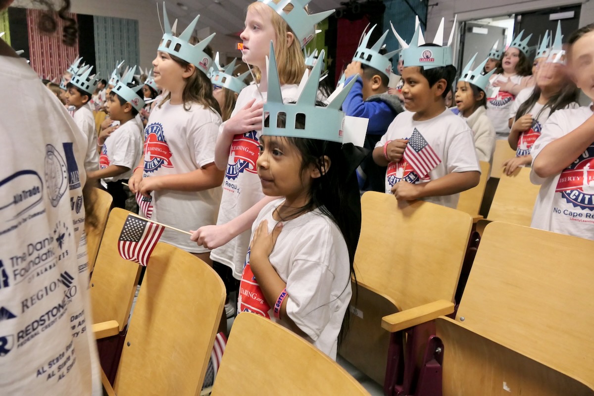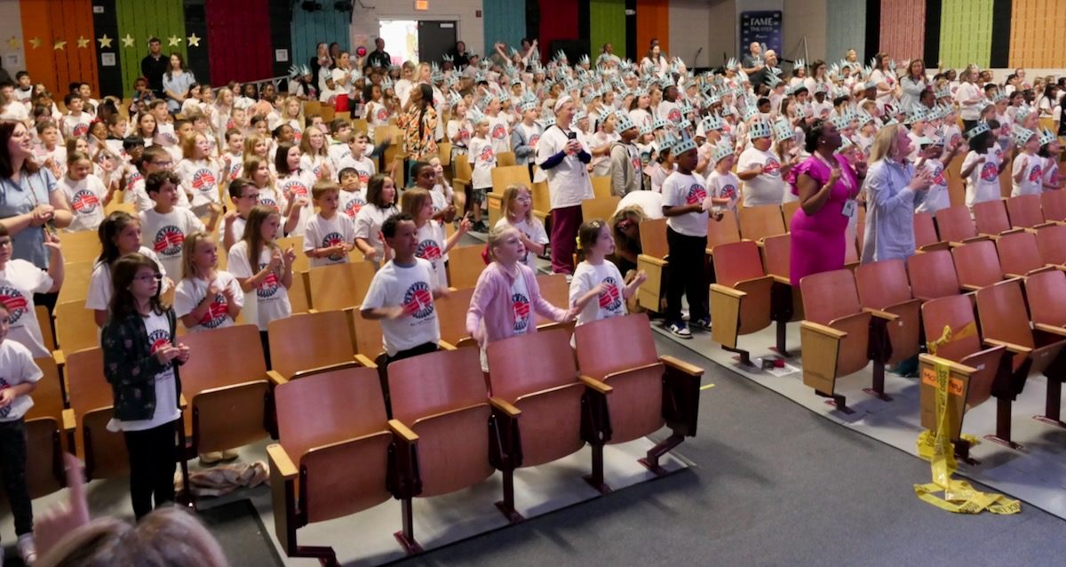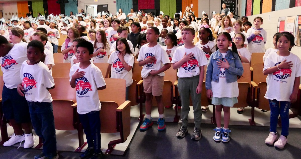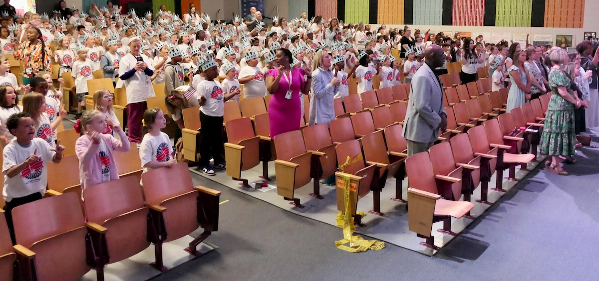 Today, 2nd graders from FAME Academy at Brookhill, HEART Academy at Newman, iAcademy at Athens Elementary, SPARK Academy at Cowart, & Athens Renaissance filled the FAME Academy at Brookhill Theatre. After finishing 10 weeks in the Hands on Liberty Program, they are gathered to celebrate their accomplishments and honor local heroes from the stage.