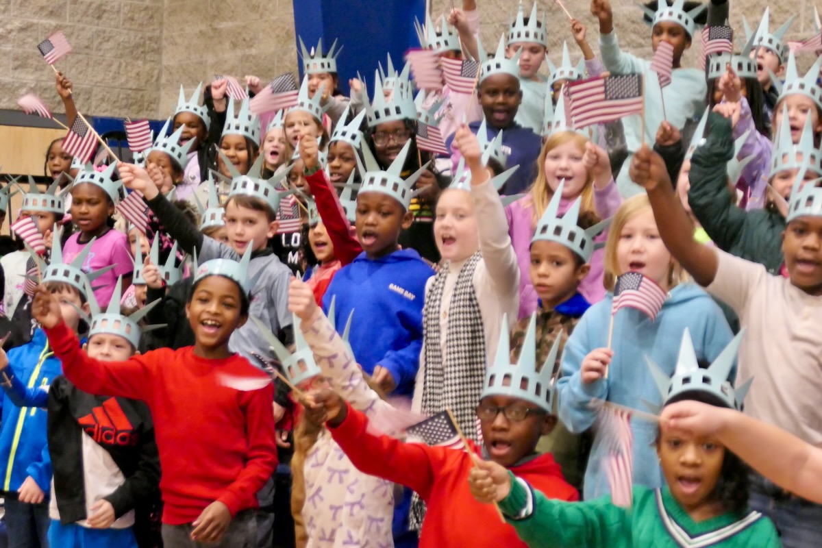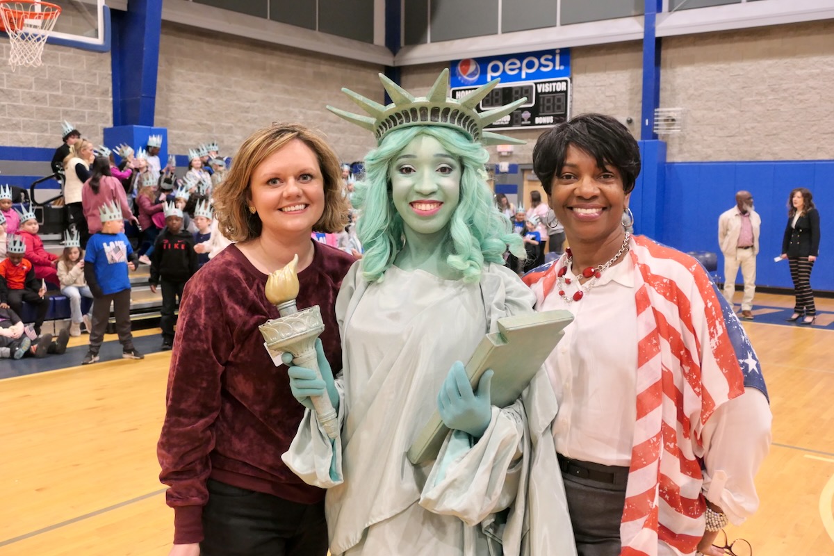 Today second graders from Myrtlewood Elementary, Big Sandy Elementary, Lake View Elementary, Vance Elementary, & Cottondale Elementary cheered and counted down to the grand entrance of Libby Liberty™. Wearing green paper crowns and waving tiny American flags, they showed their enthusiasm for the Super Citizen Program they’ll begin after today’s theatrical performance.