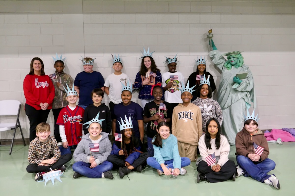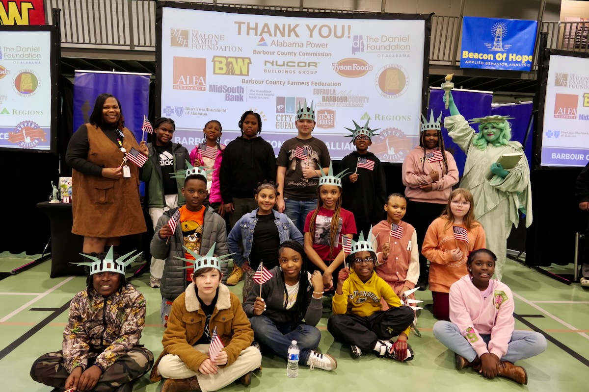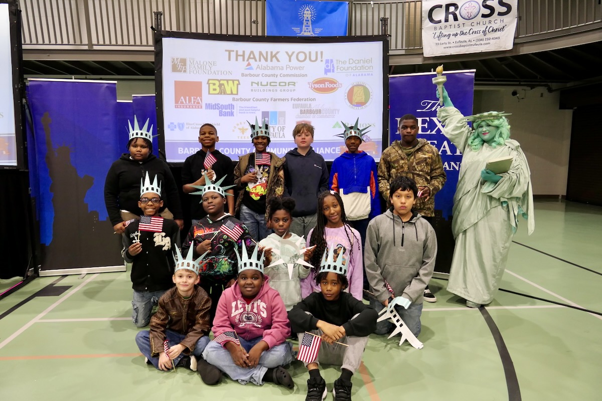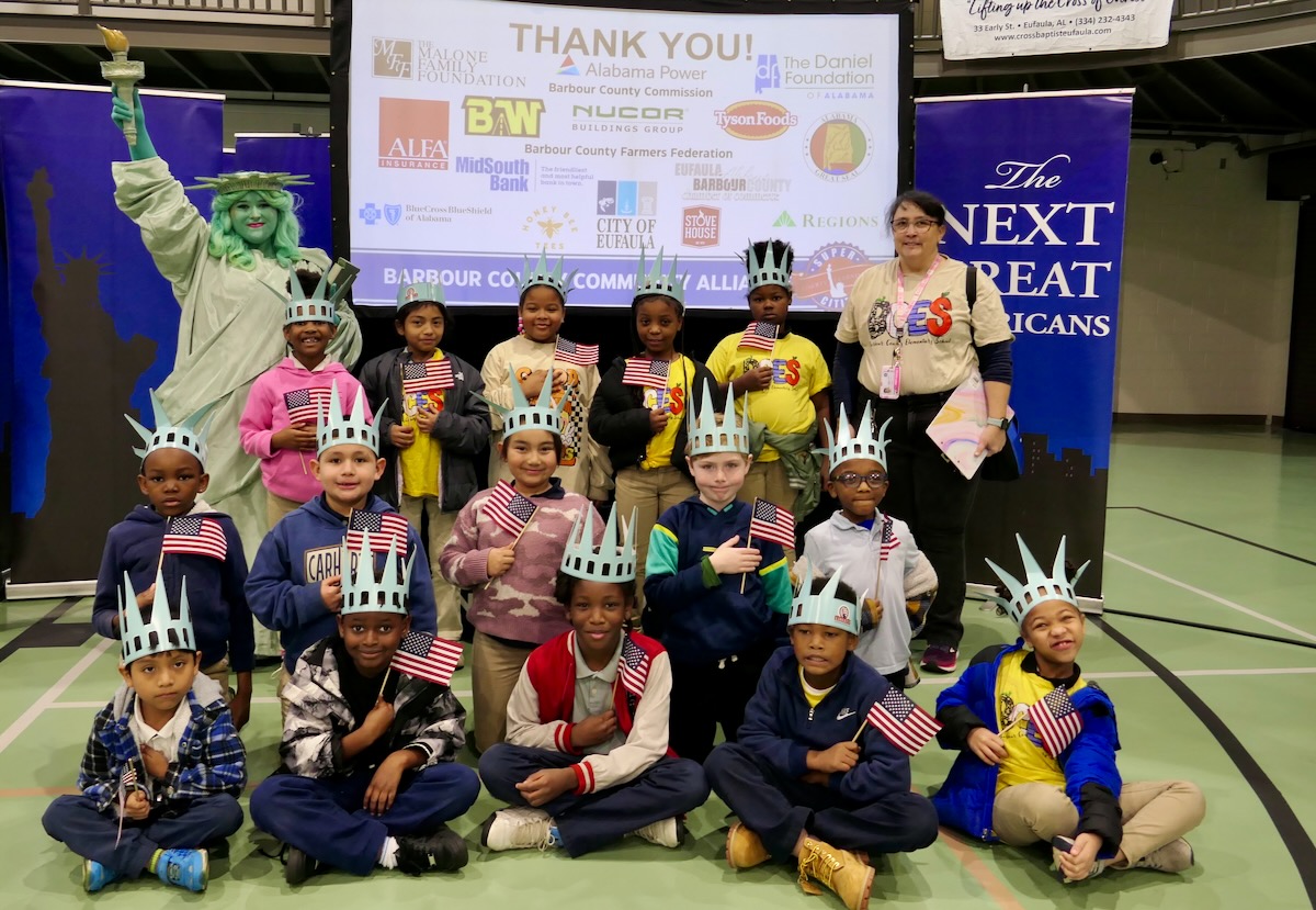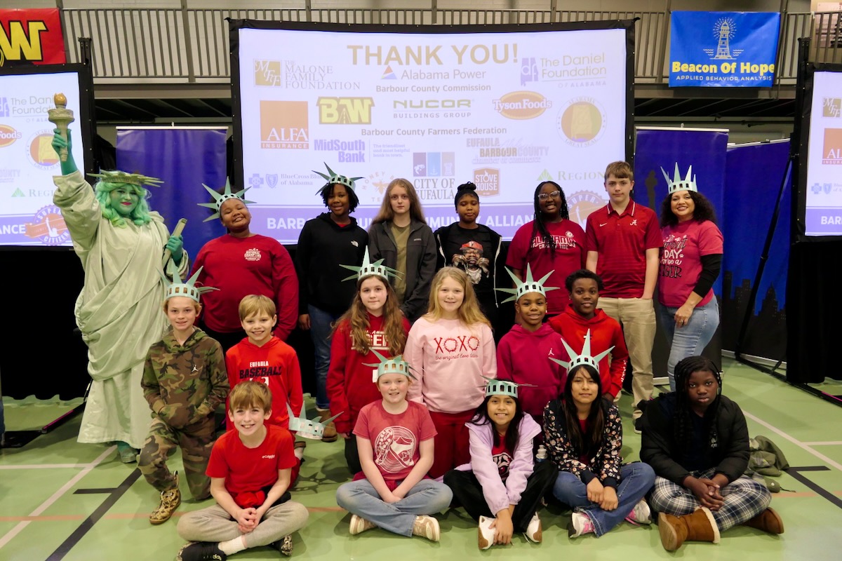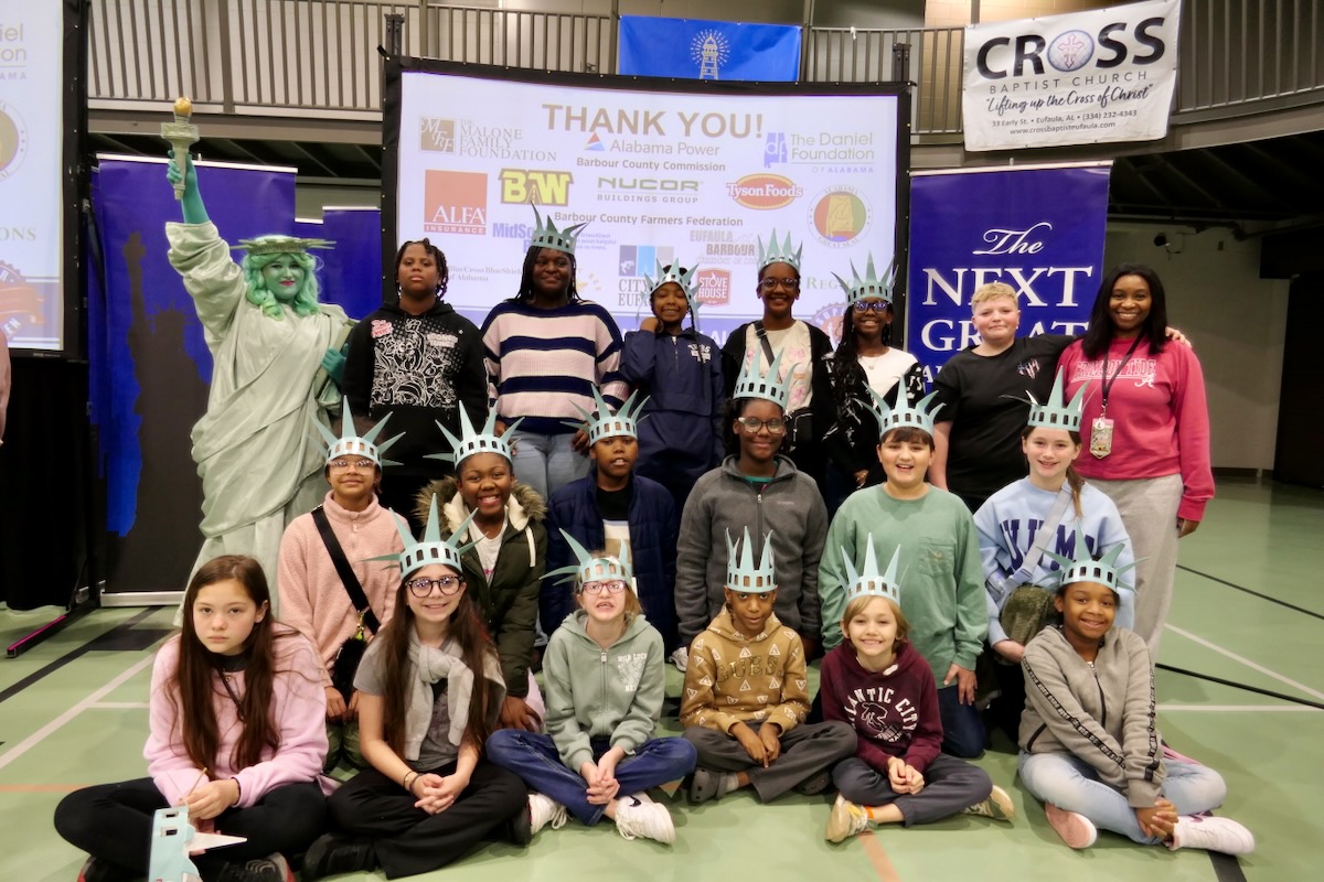 Today second, third, & fifth grade elementary students from Eufaula Primary, Eufaula Elementary, Barbour County Intermediate, & The Lakeside Schoolcame together to kick off the Super Citizen Program for 2025-2026 School Year. They waved flags, wore Statue of Liberty crowns and counted down for Libby Liberty™ to take the stage. On three huge screens “live video” shows her Next Great Americans tour pulling up to the school and then the real-life Libby walked out from behind the screens!
