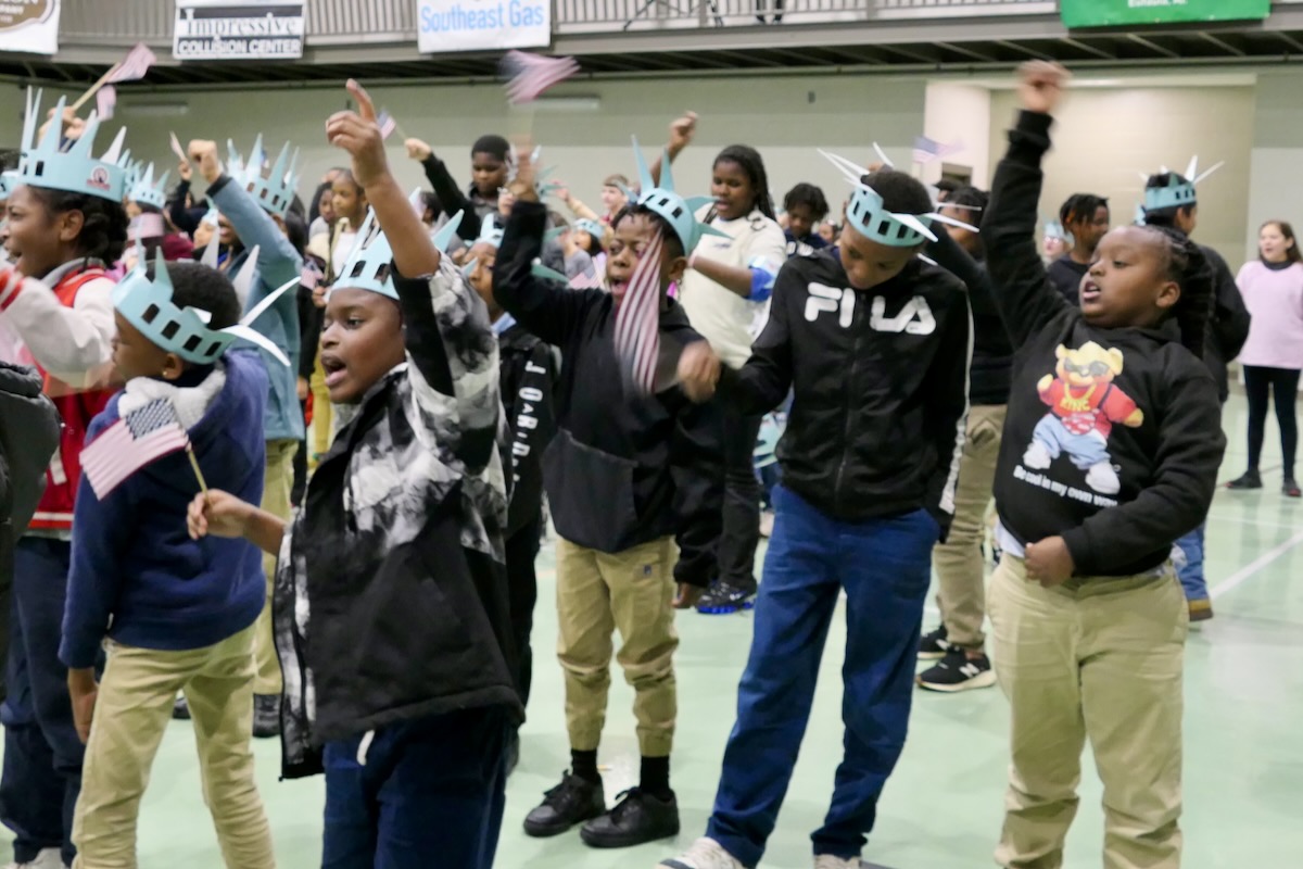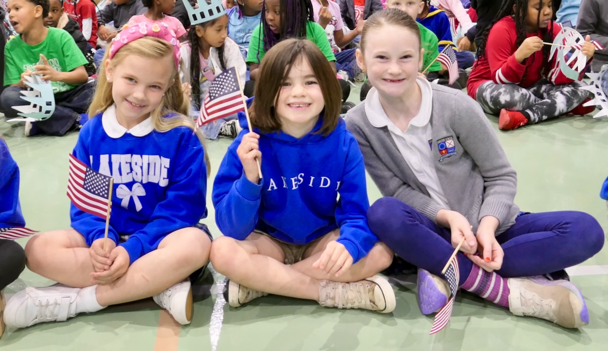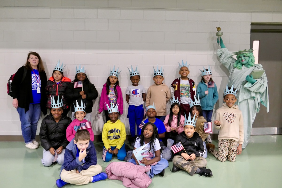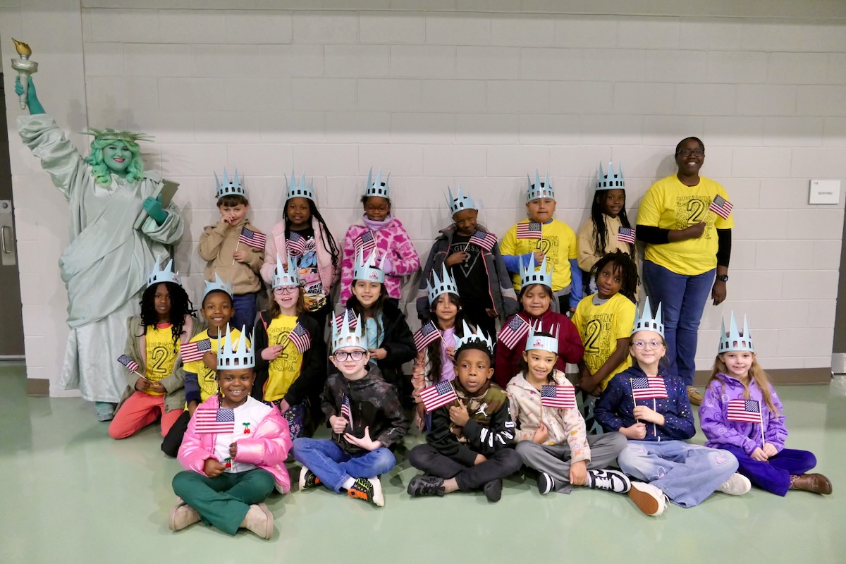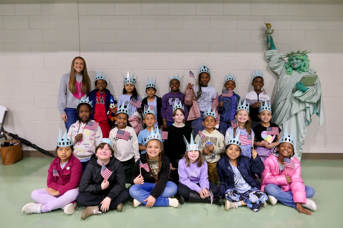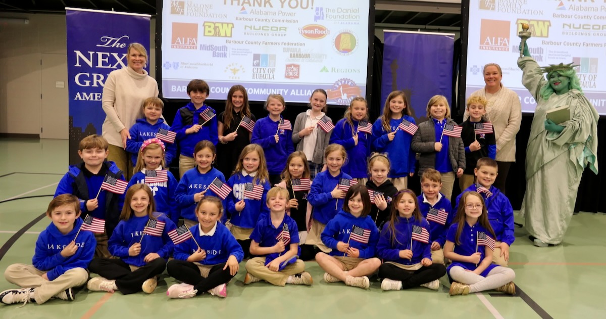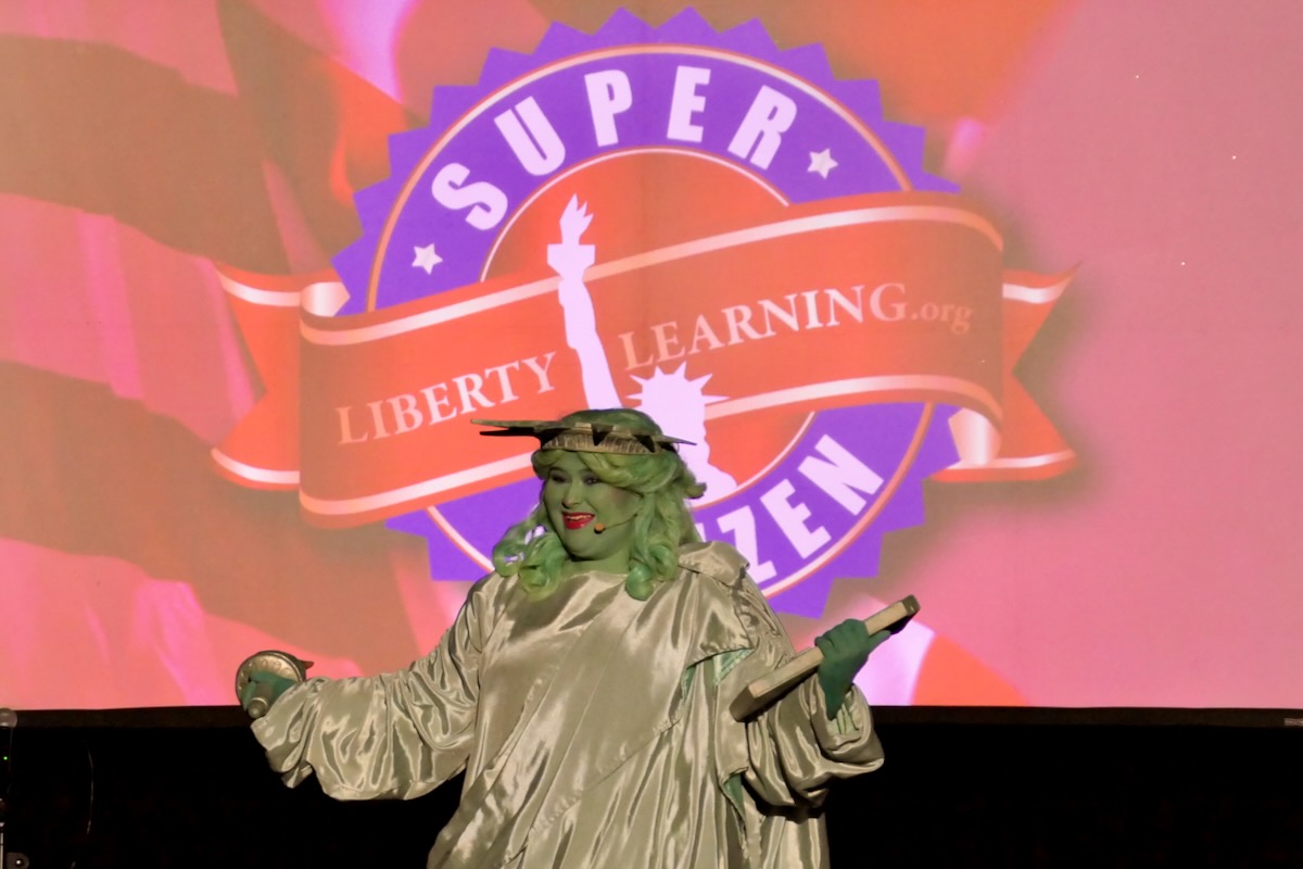 Today second, third, & fifth grade elementary students from Eufaula Primary, Eufaula Elementary, Barbour County Intermediate, & The Lakeside Schoolcame together to kick off the Super Citizen Program for 2025-2026 School Year. They waved flags, wore Statue of Liberty crowns and counted down for Libby Liberty™ to take the stage. On three huge screens “live video” shows her Next Great Americans tour pulling up to the school and then the real-life Libby walked out from behind the screens!